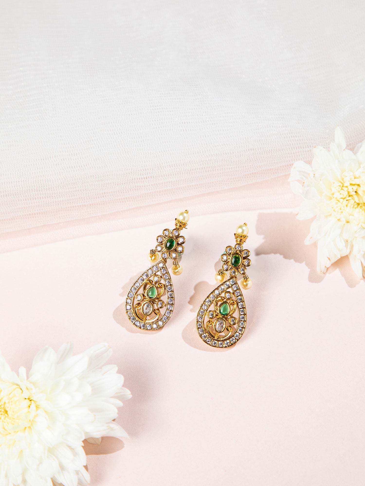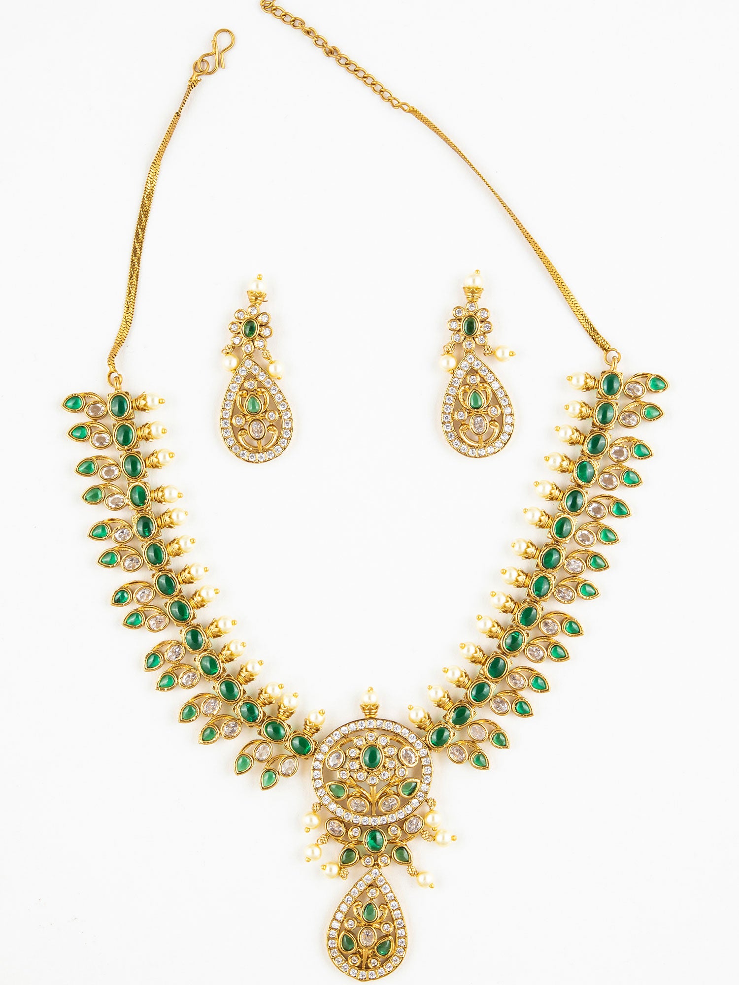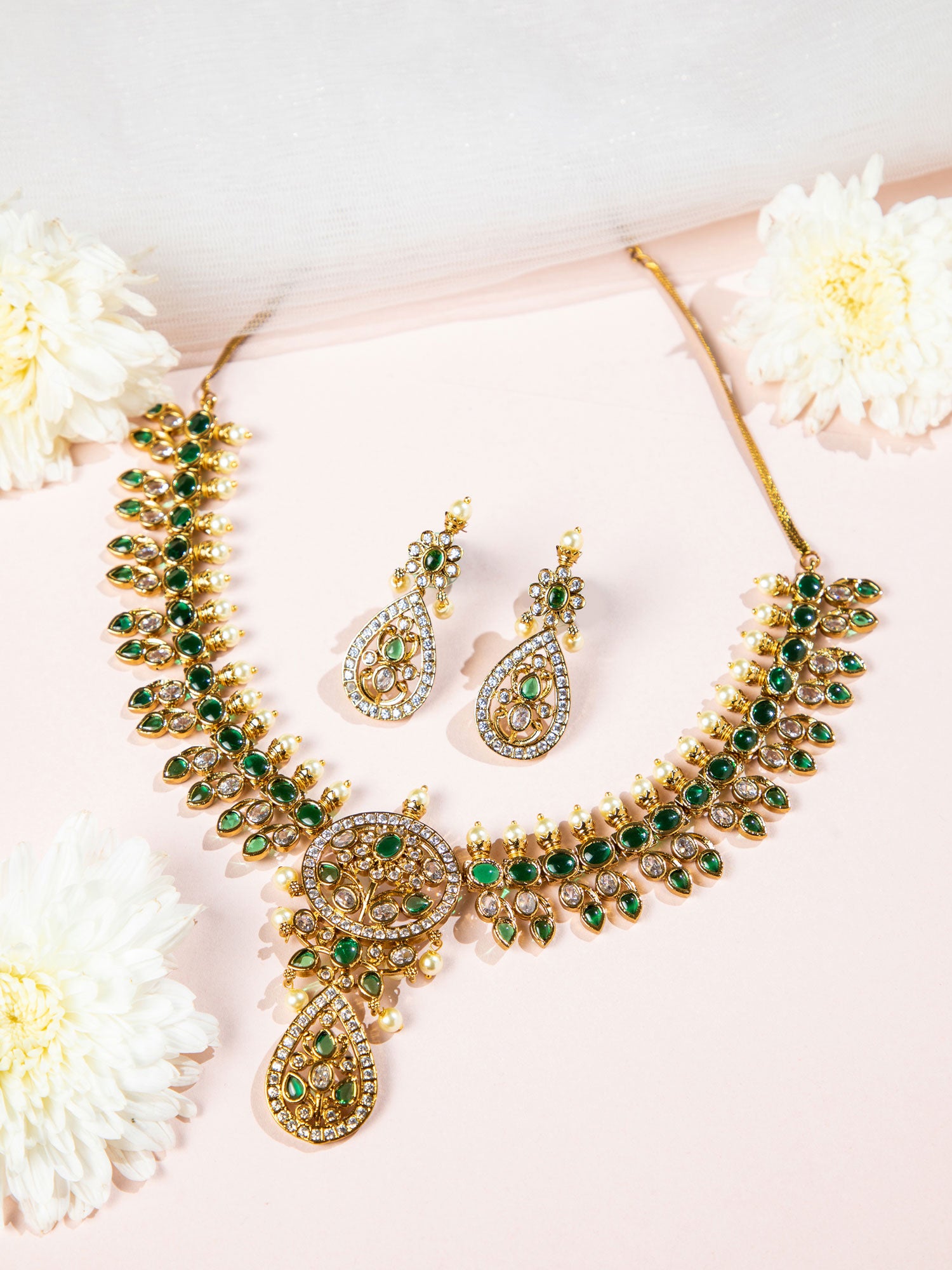 A gold-plated choker adorned with clear crystals and vivid emerald-green teardrop stones, accented by delicate pearl drops. The central pendant exudes sparkling elegance while matching earrings complete the set—ideal for festive celebrations and ethnic ensembles.
