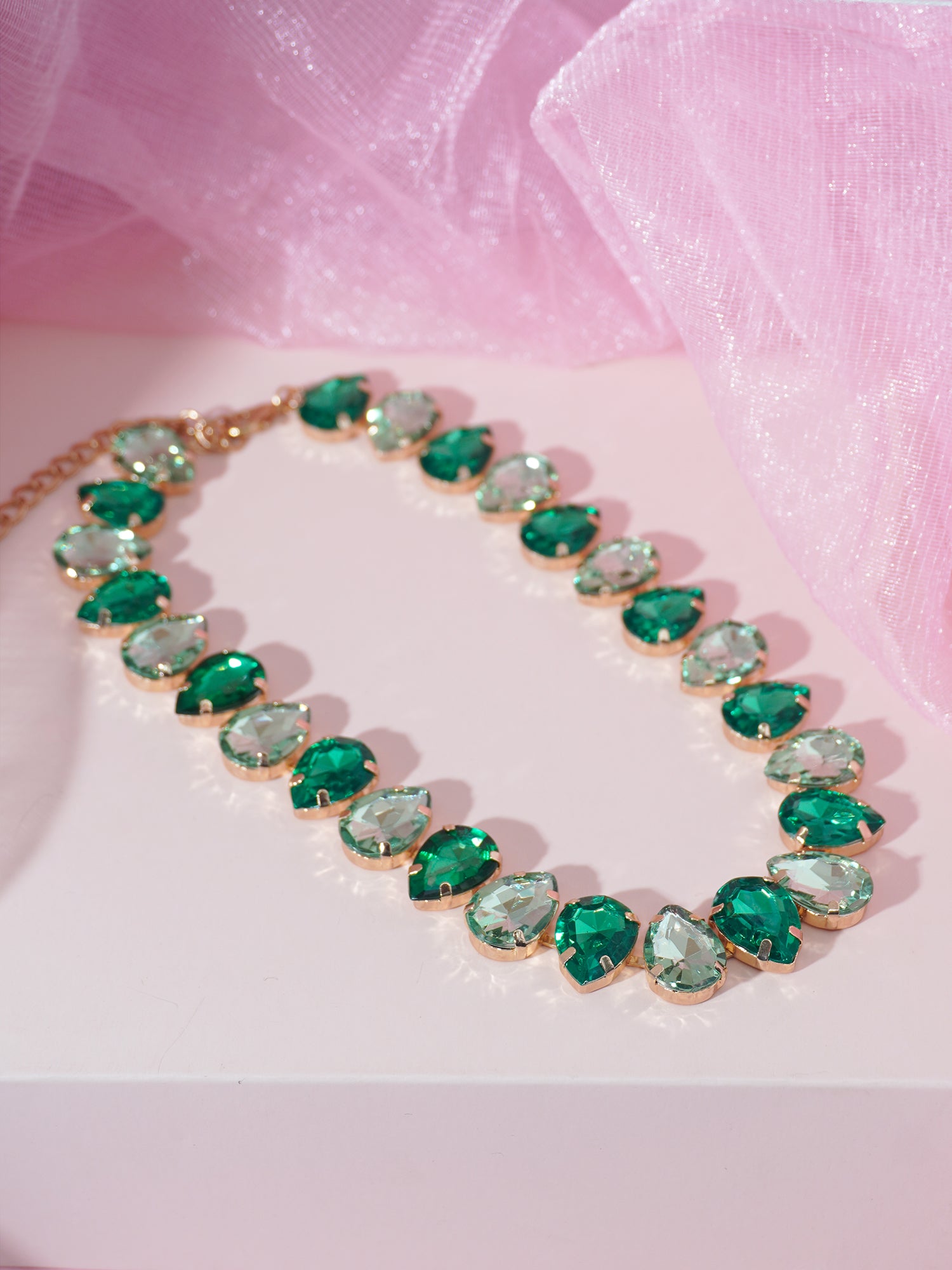 Elevate your jewelry collection with Niscka's stunning choker necklace, featuring a captivating design that showcases vibrant emerald and pristine white accents. Crafted with a luxurious gold-plated finish and expertly rhodium polished, this necklace radiates elegance and sophistication. The combination of emeralds and white stones, along with sparkling American diamonds, creates a striking contrast that adds a touch of glamour to any outfit. Perfect for special occasions or to elevate your everyday look, this choker necklace is a must-have accessory that beautifully frames the neckline and enhances your style.