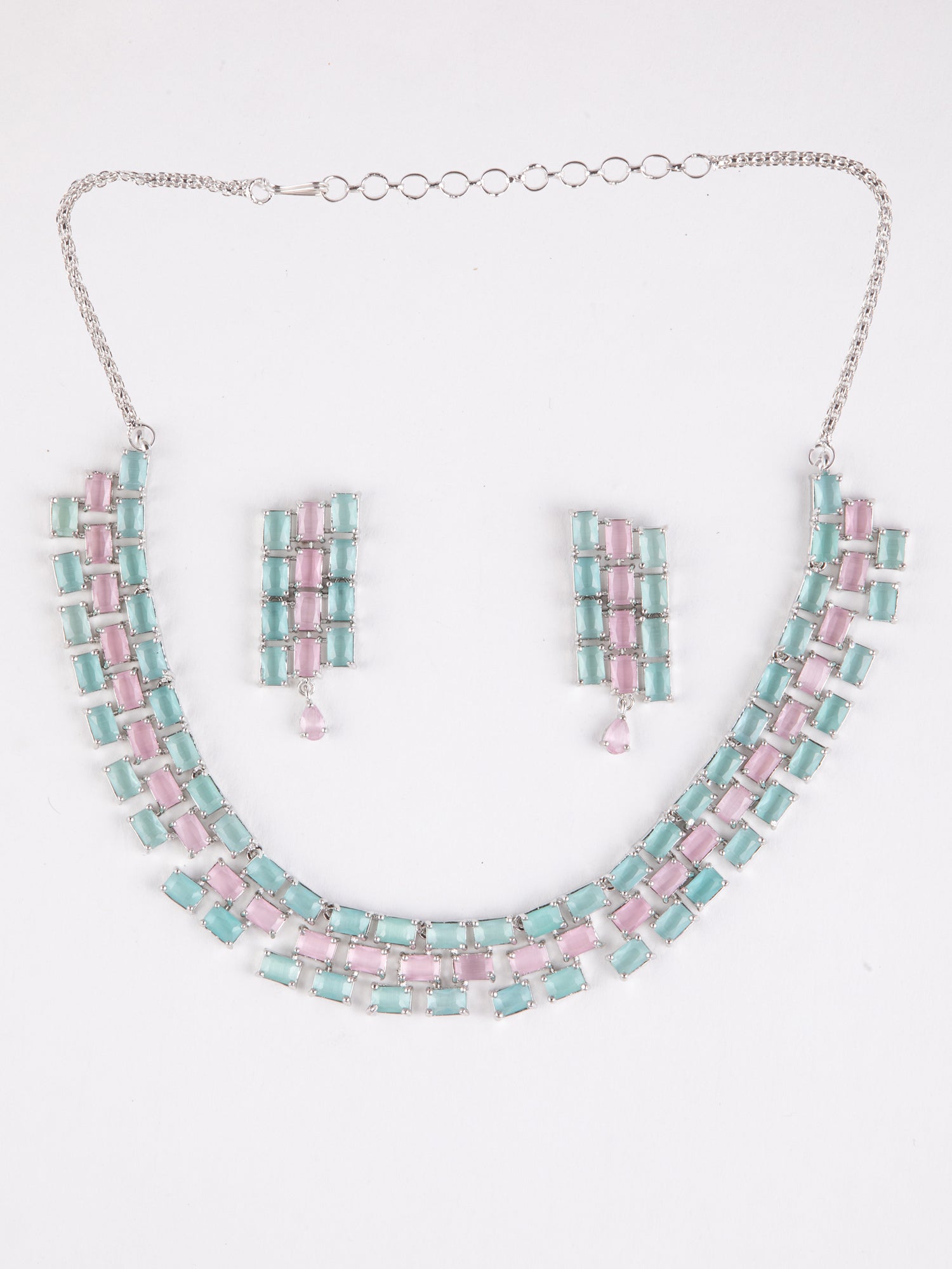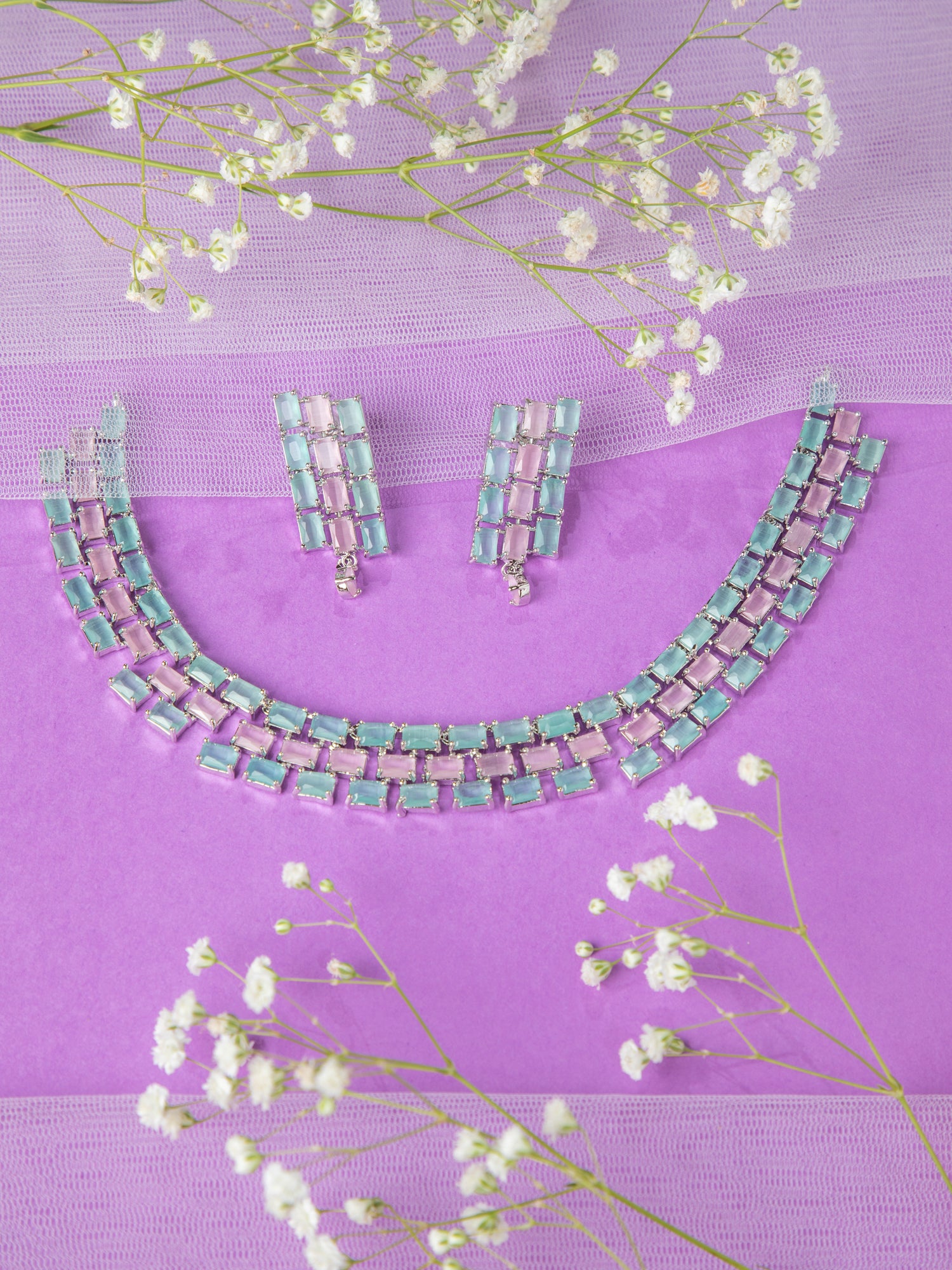 Shine in elegance with this rhodium plated silver American Diamond necklace, adorned with mesmerizing green and pink stones. Paired with matching earrings, it’s an enchanting piece from the new collection.