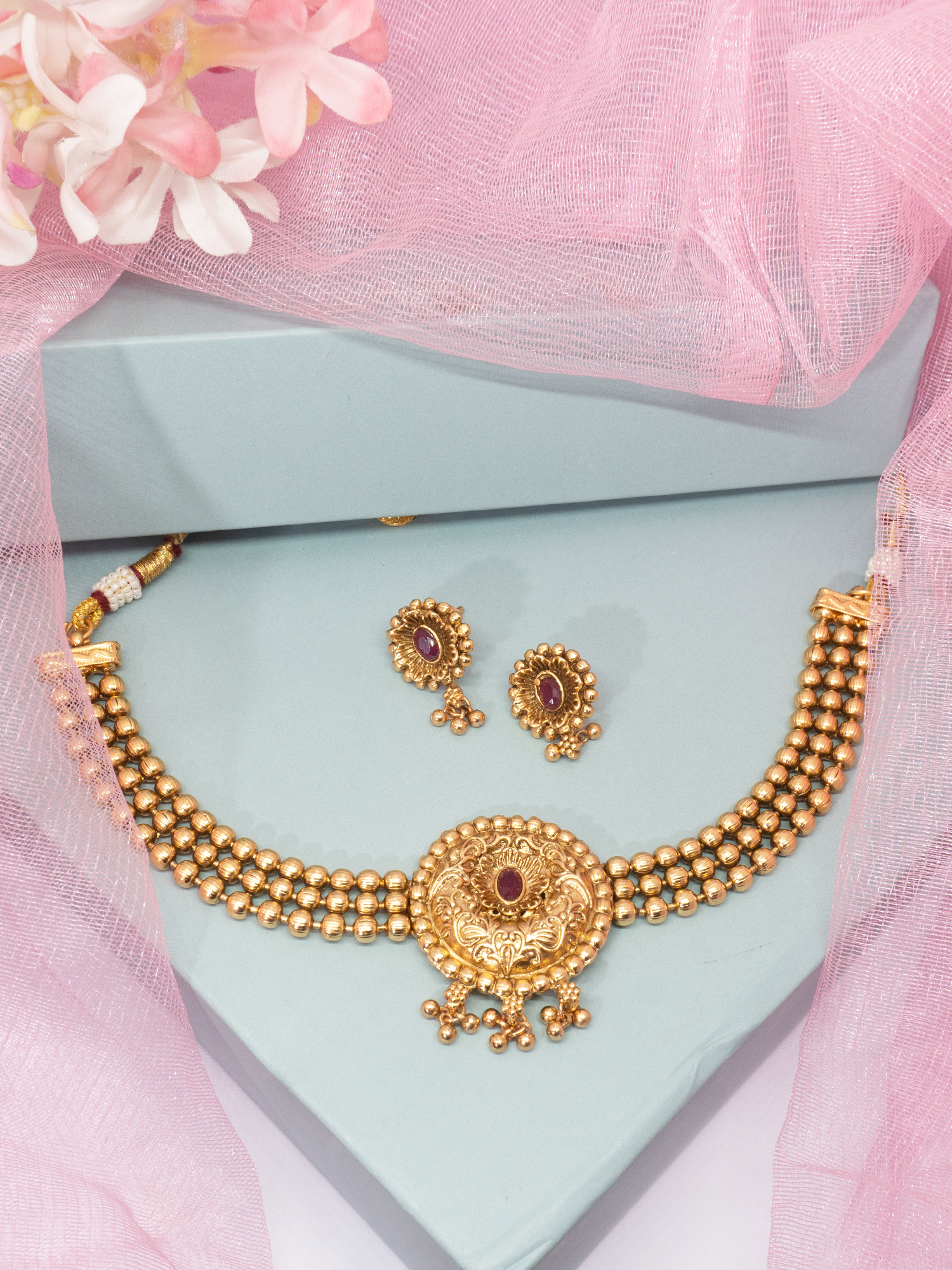 To make the most of the Niscka 24K Gold-Plated Pearl Choker Necklace Set, pair it with a timeless saree or lehenga in a complementary color. Opt for a blouse with a V-neck or off-the-shoulder style to showcase the choker.