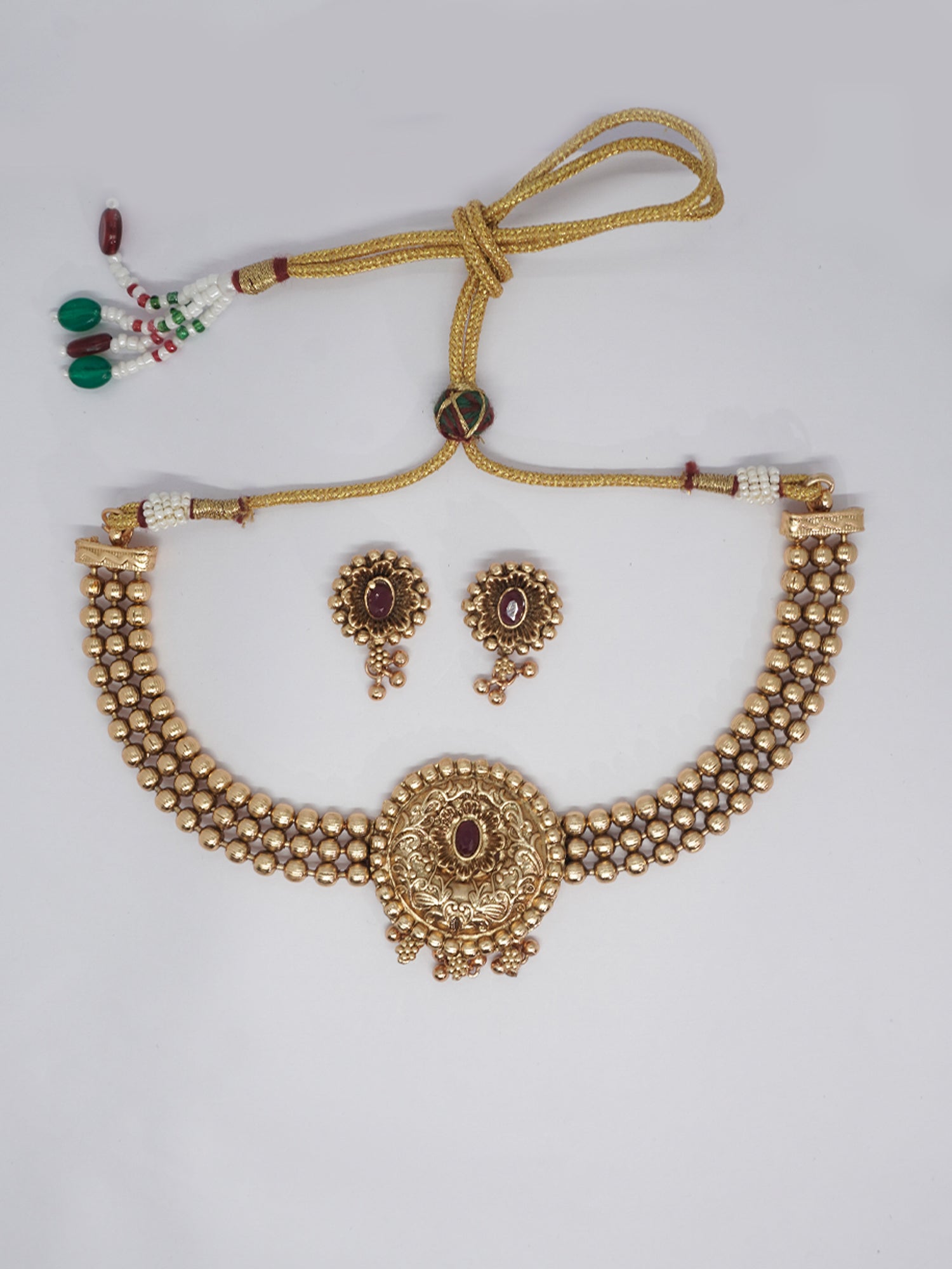 Enhance your look with Niscka's 24K Gold-Plated Pearl Choker Necklace Set. This elegant set features a luxurious 24K gold-plated choker adorned with lustrous pink stone and delicate moti dori details. Ideal for adding a touch of classic sophistication to any special occasion.