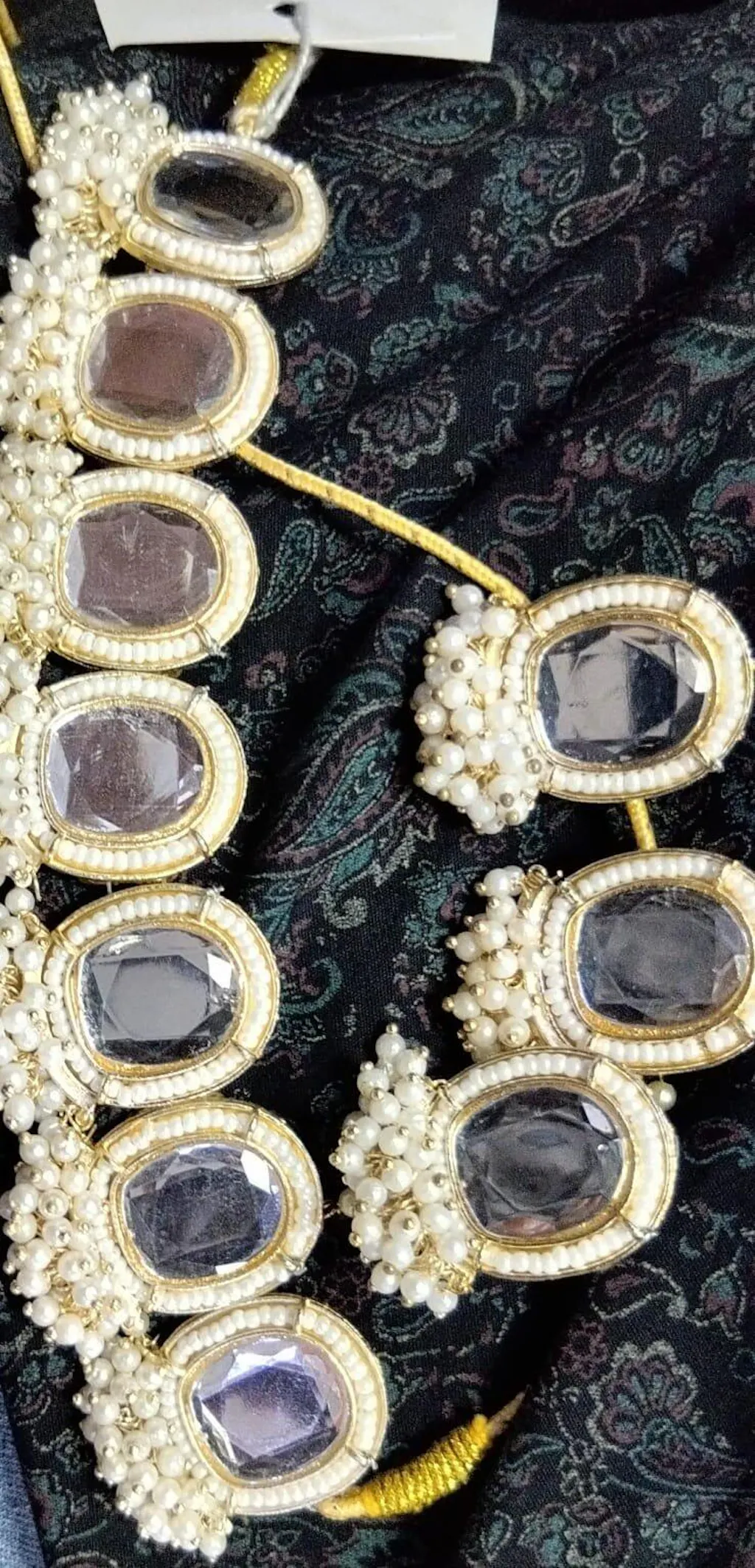 What’s included- A necklace A pair of earrings A mang tikka Material type- High-quality metal Polki stones Tiny white beads Gold plated body High-quality alloy.