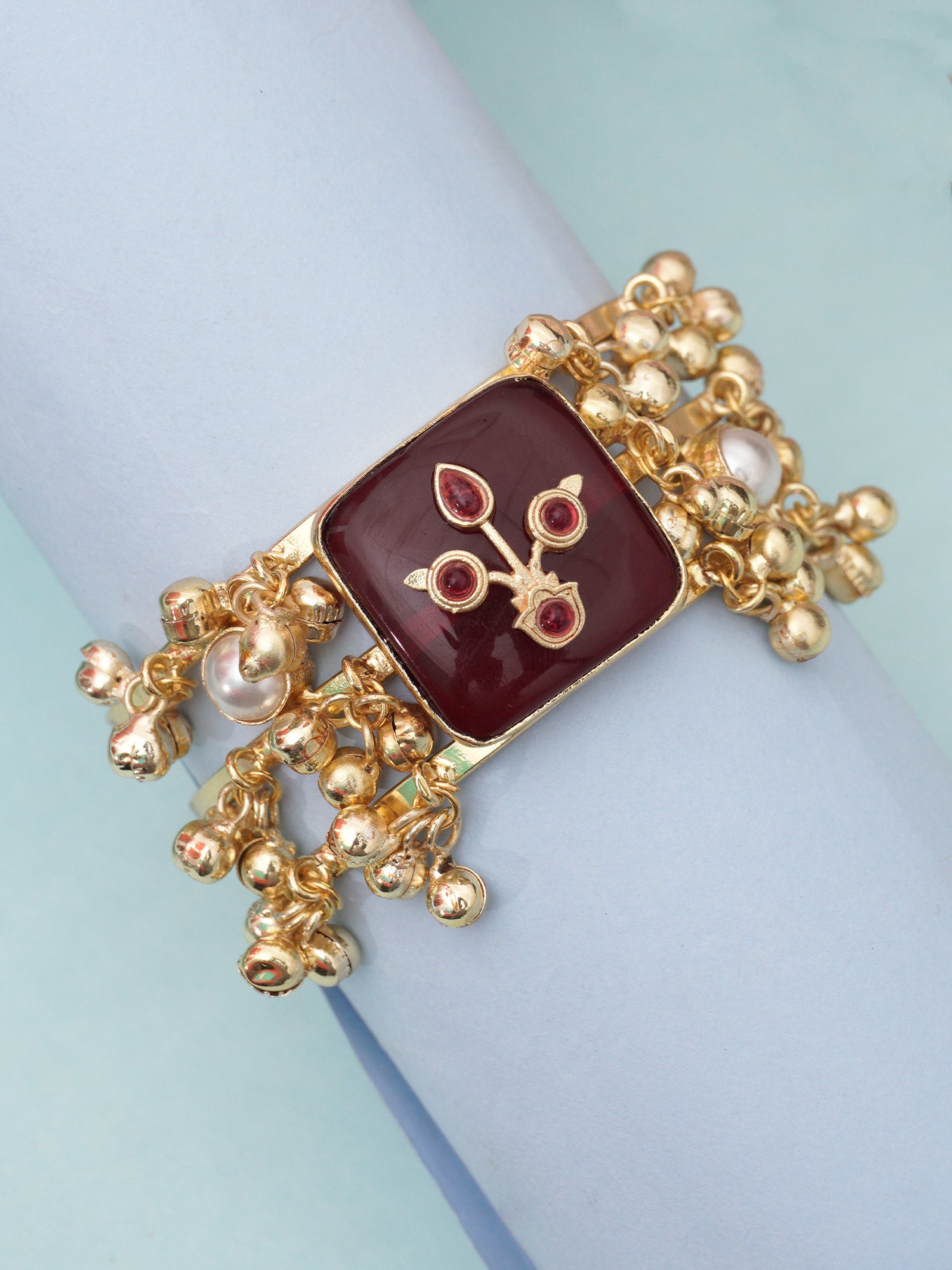 Celebrate heritage and elegance with this exquisite traditional kada, crafted to perfection with a 24K gold-plated finish. Designed for those who appreciate fine detailing, this piece features delicate ghungroo accents that create a soft, melodic charm with every movement. The intricate design is further enhanced with lustrous pearls and rich maroon stones, adding a regal touch to your ensemble. Whether paired with ethnic attire or worn as a statement piece, this kada beautifully blends tradition with timeless allure.