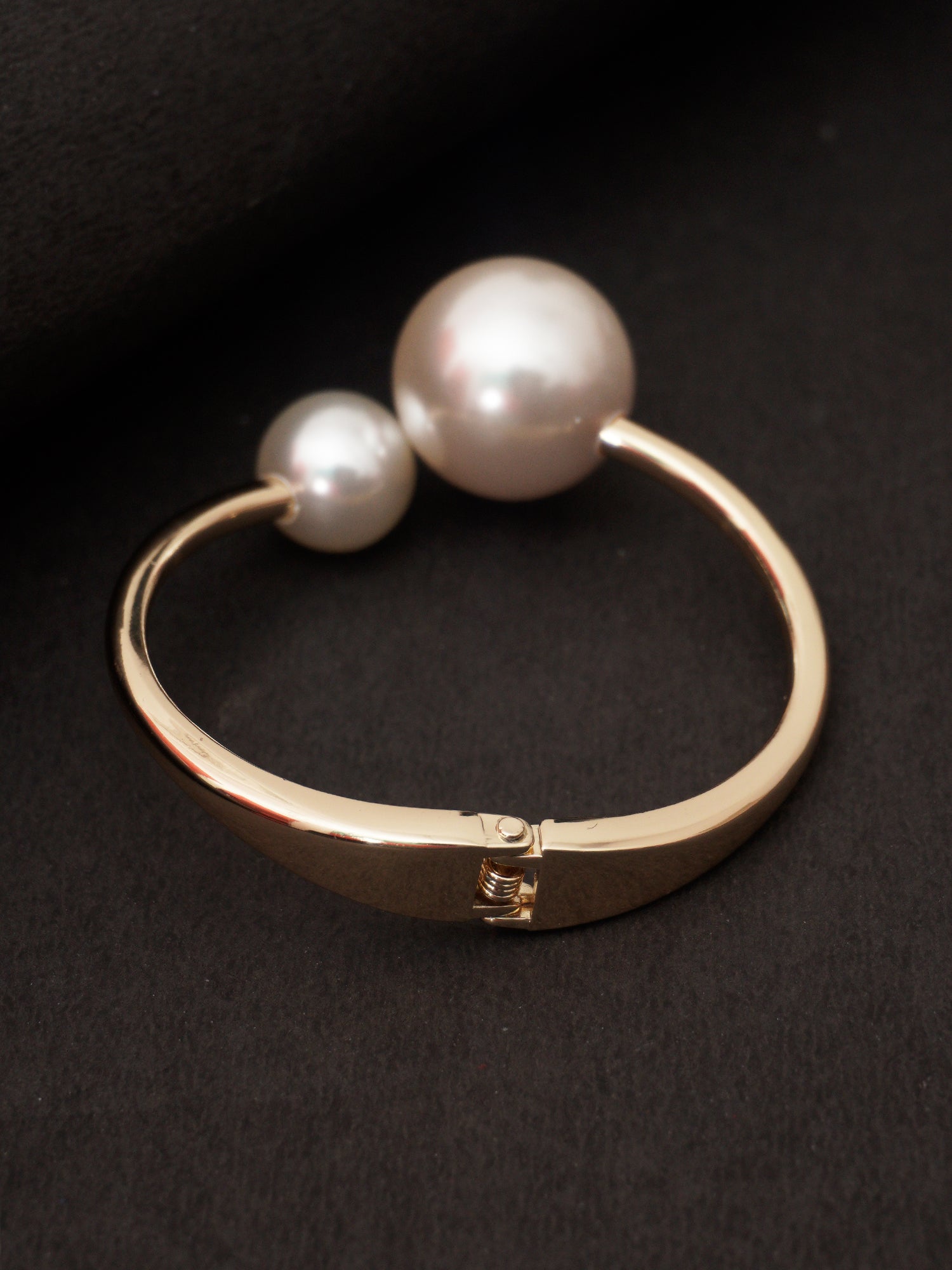 Pair this gold-plated cuff bracelet with a pearl clasp with an elegant silk blouse or a classic dress for a refined look. For a timeless touch, match it with pearl earrings or a delicate gold necklace. Whether worn alone for understated elegance or stacked with dainty bangles, this bracelet effortlessly elevates any outfit.