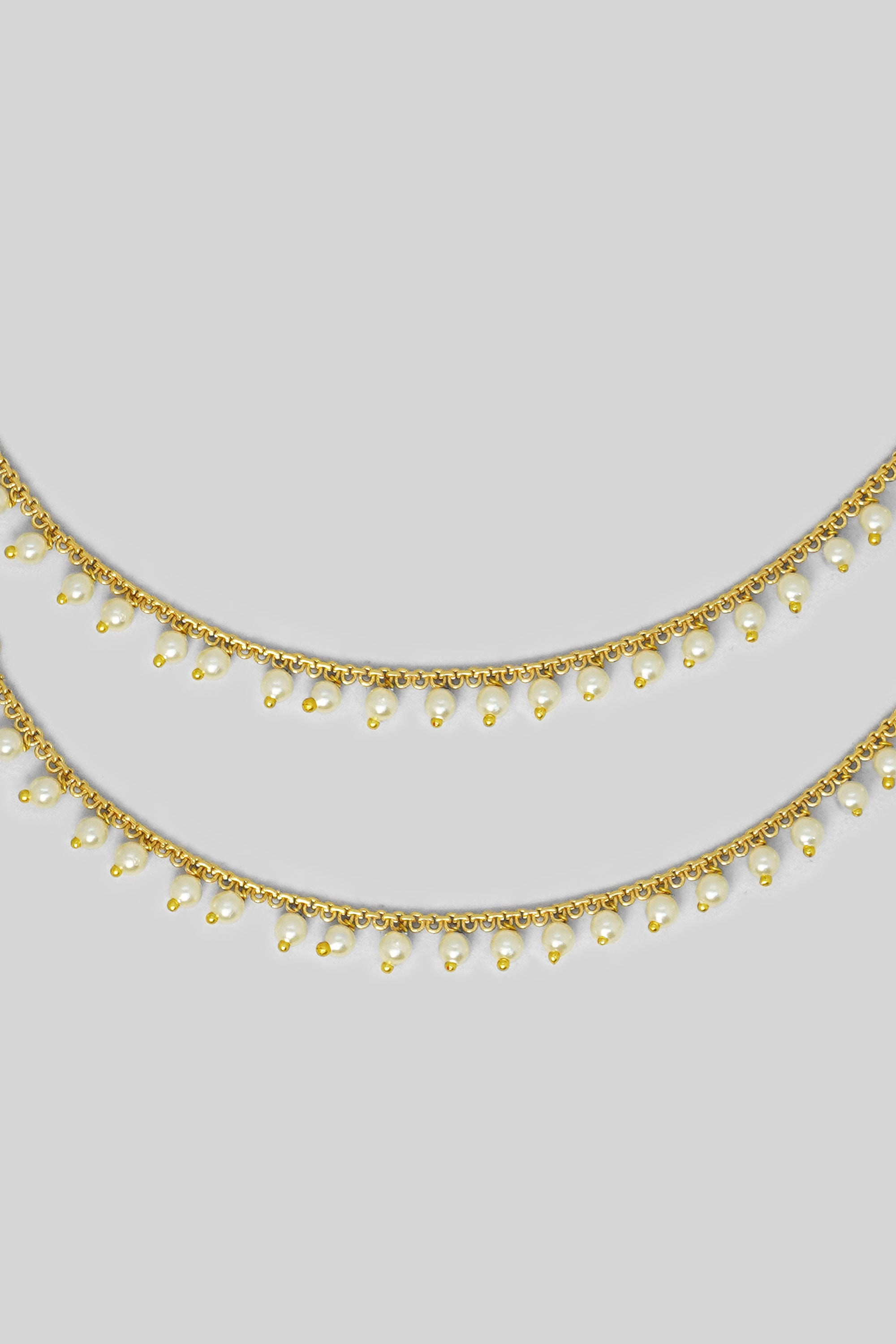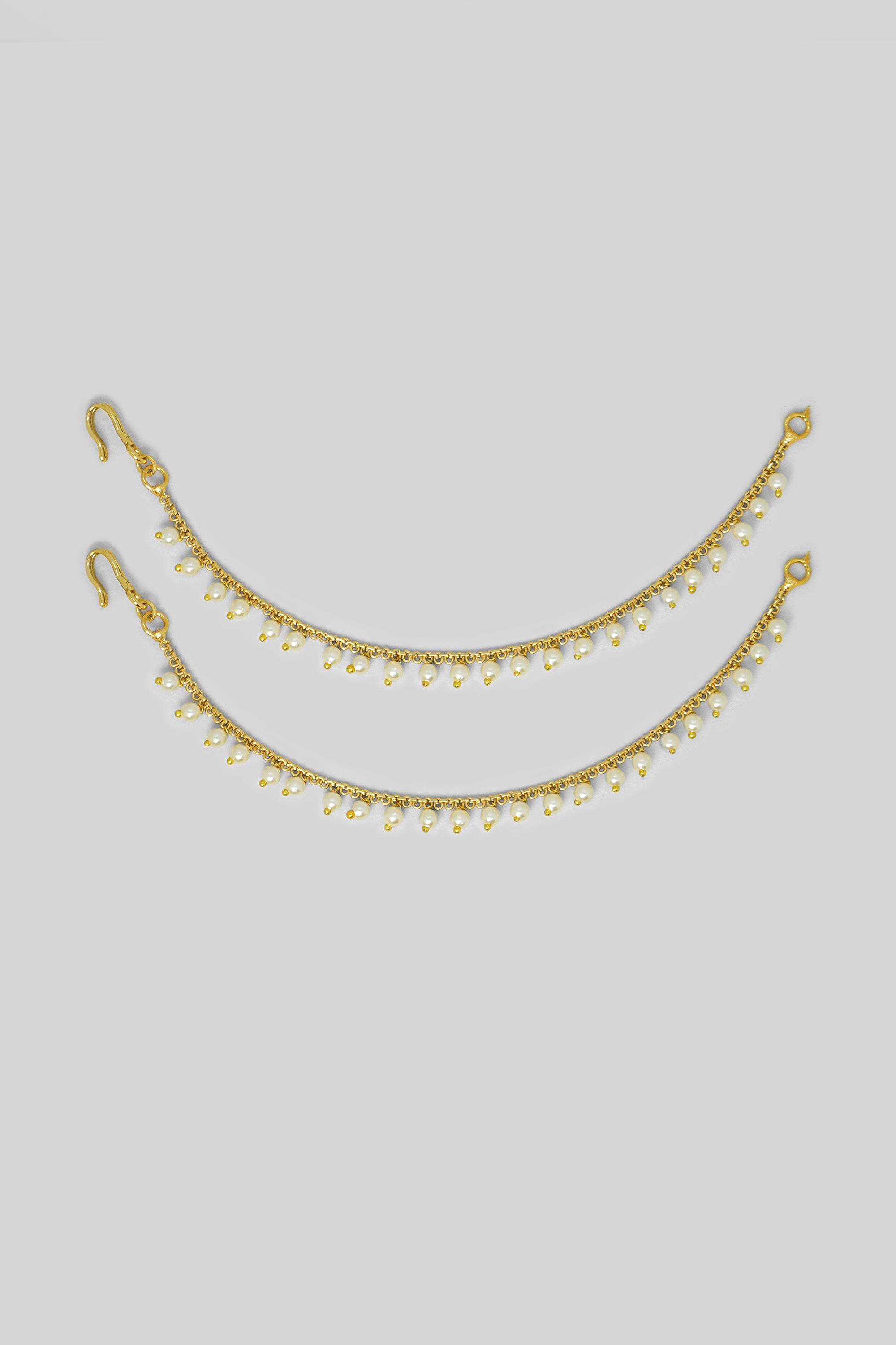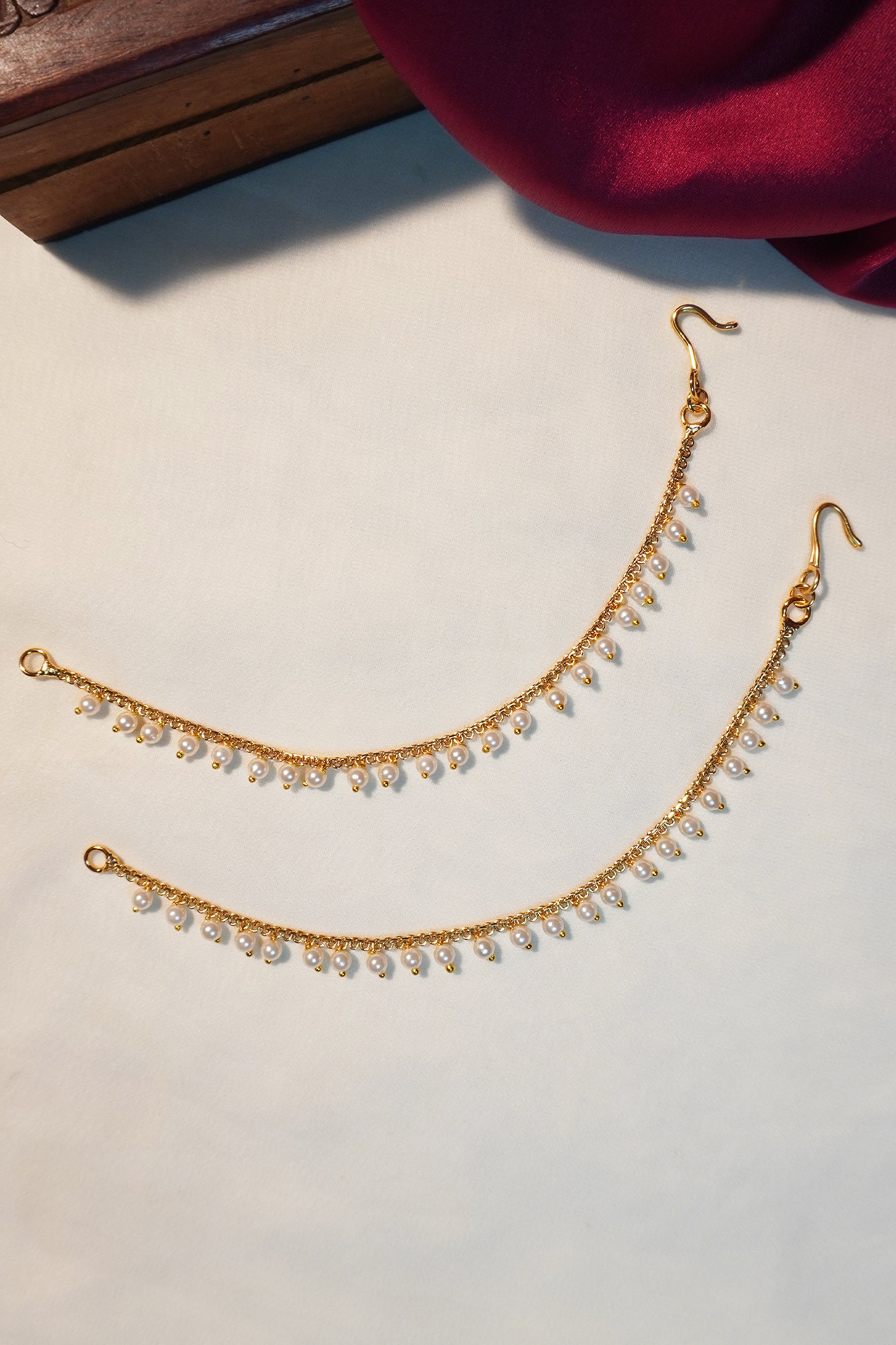 This beautiful piece of single-layered earring chain is what you want for your traditional outfit. It is highly polished with gold and is embellished with small pearls. Its simplicity can rule the entire look. It is as light-weighted as it seems.