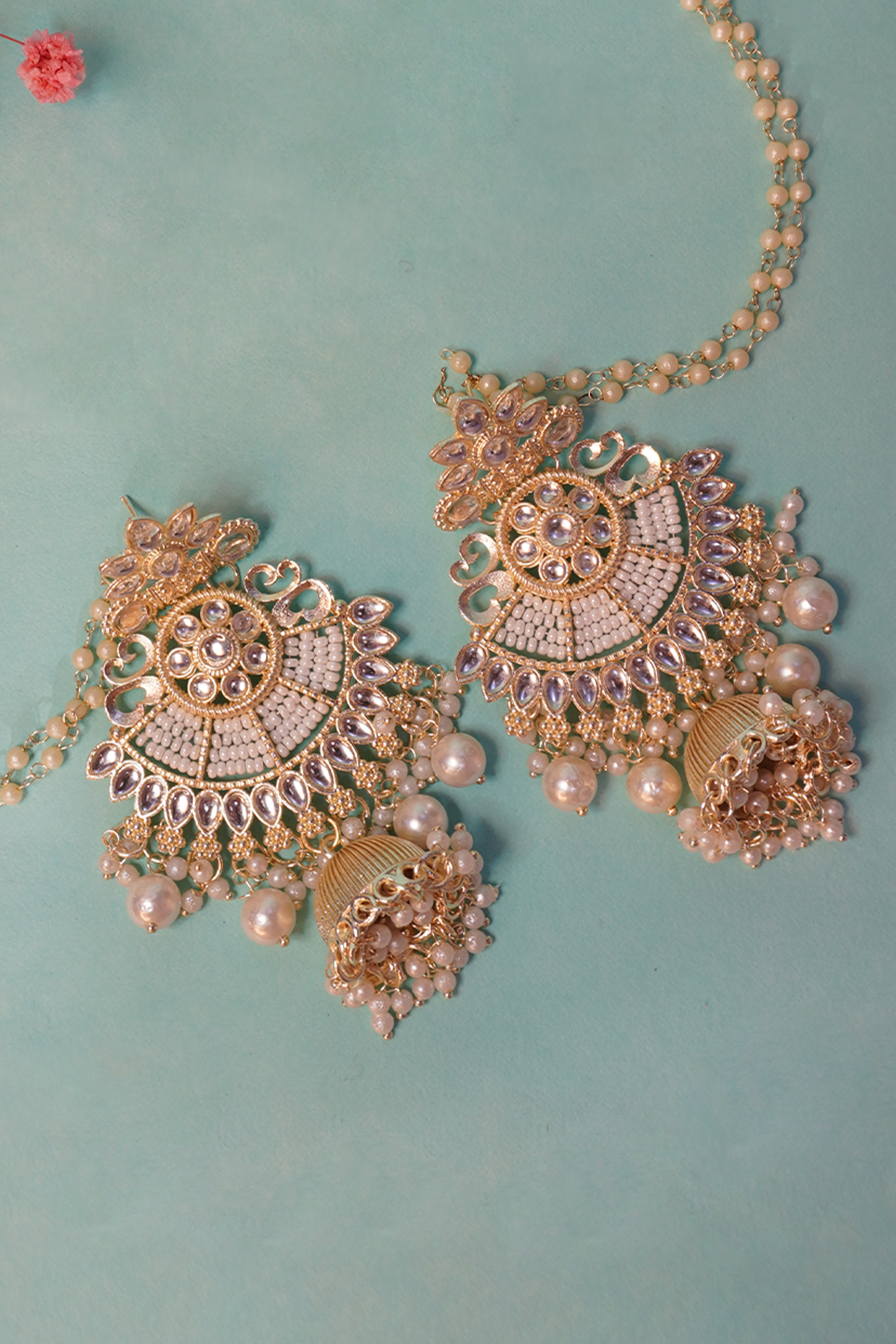 For a perfect ethnic and class and glam these earrings are here. This chandbalis will be the most incredible accessory you can ever have. It is beautifully studded with white stones. The addition of small as well as big white beads makes this piece the most stunning. It is more comfortable to adorn because of its lightweight. The body is highly polished with light gold. The bell in the bottom adds the traditional touch to make it perfect with all traditional outfits.