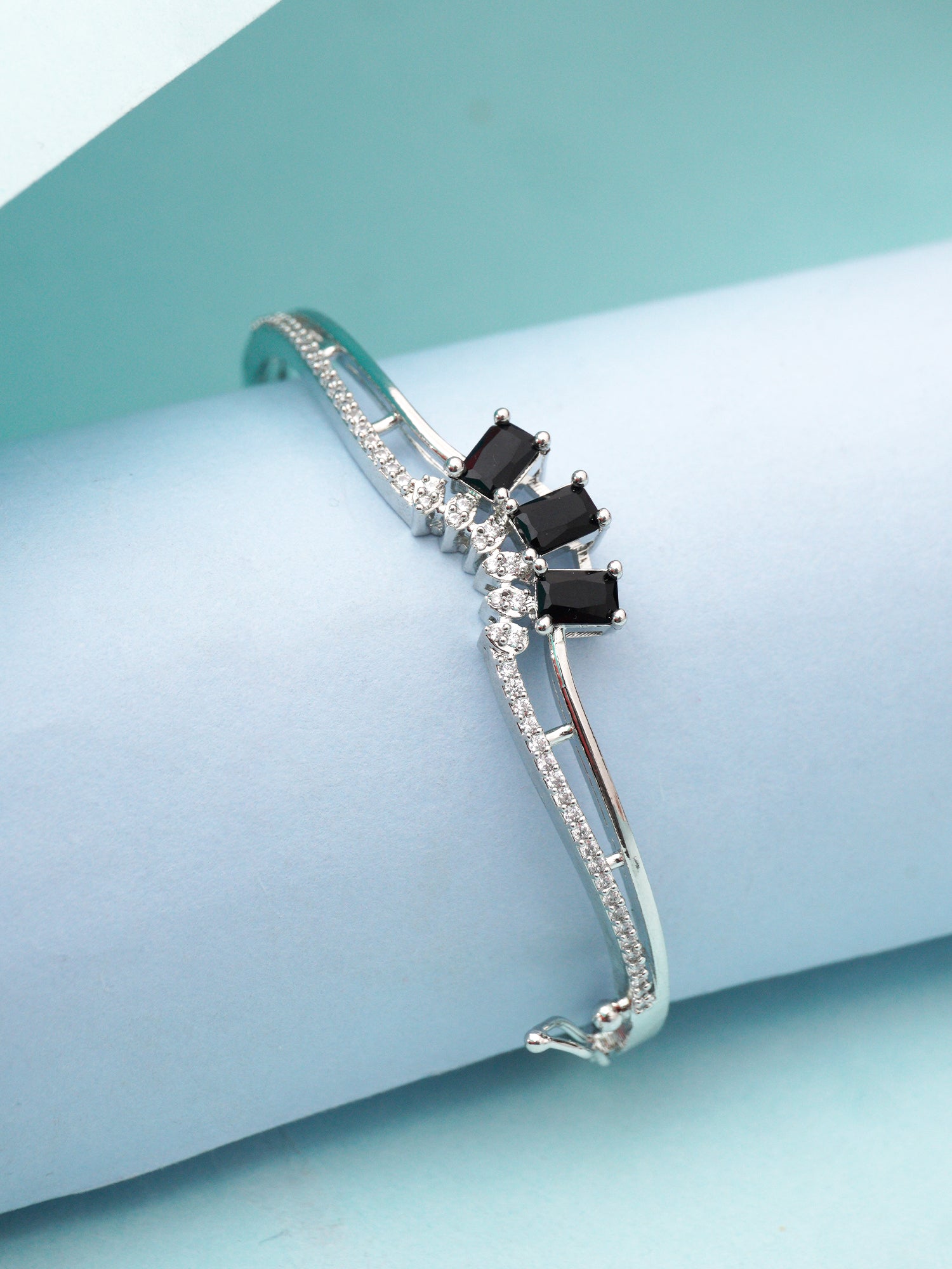 Pair this silver-plated American diamond zircon bangle with a sleek evening gown or an embellished saree for a refined, glamorous look. Wear it solo for an elegant statement or layer it with delicate bangles for a more dramatic effect. Complete the ensemble with matching zircon earrings and a subtle clutch for a sophisticated finish.