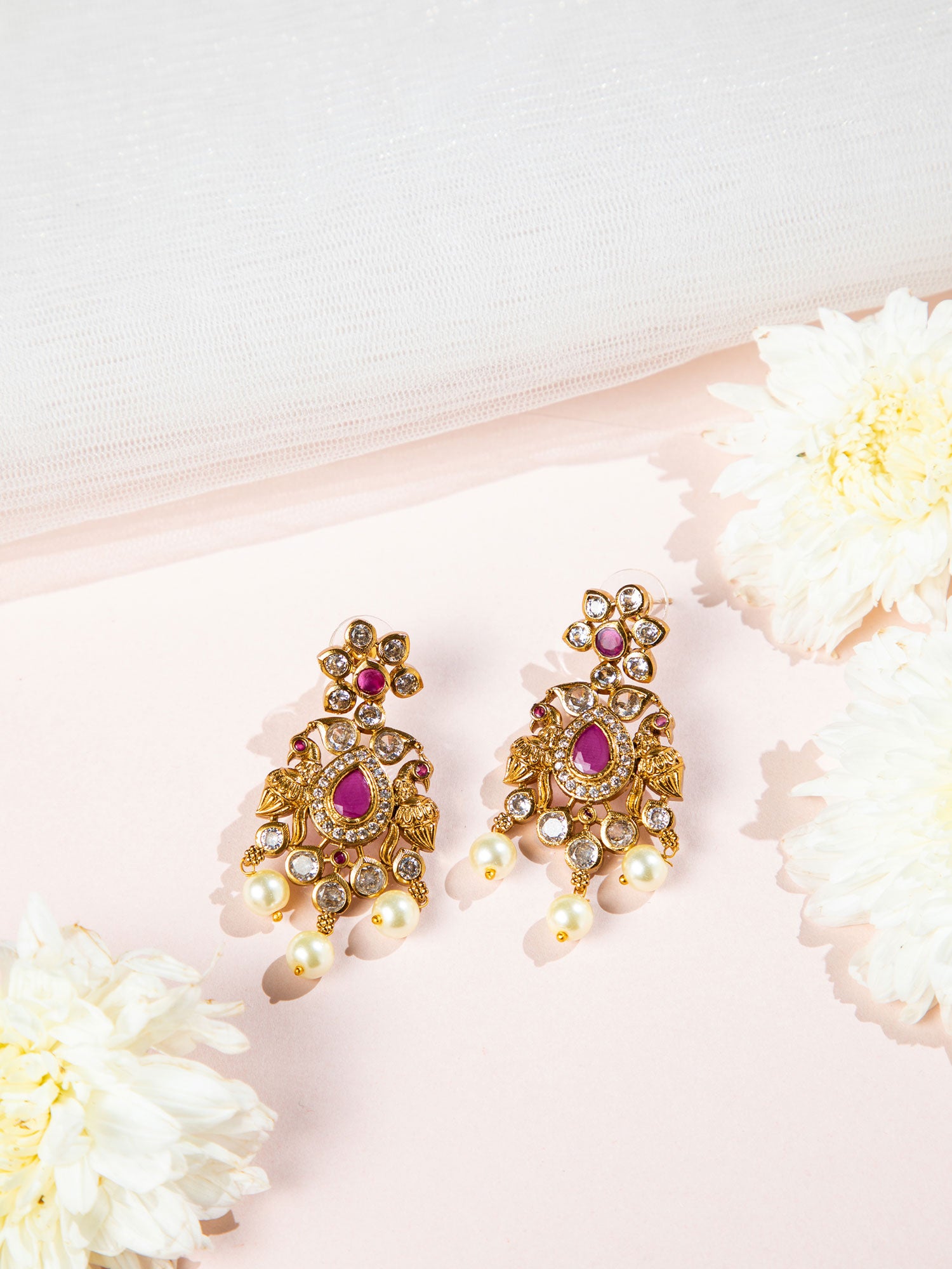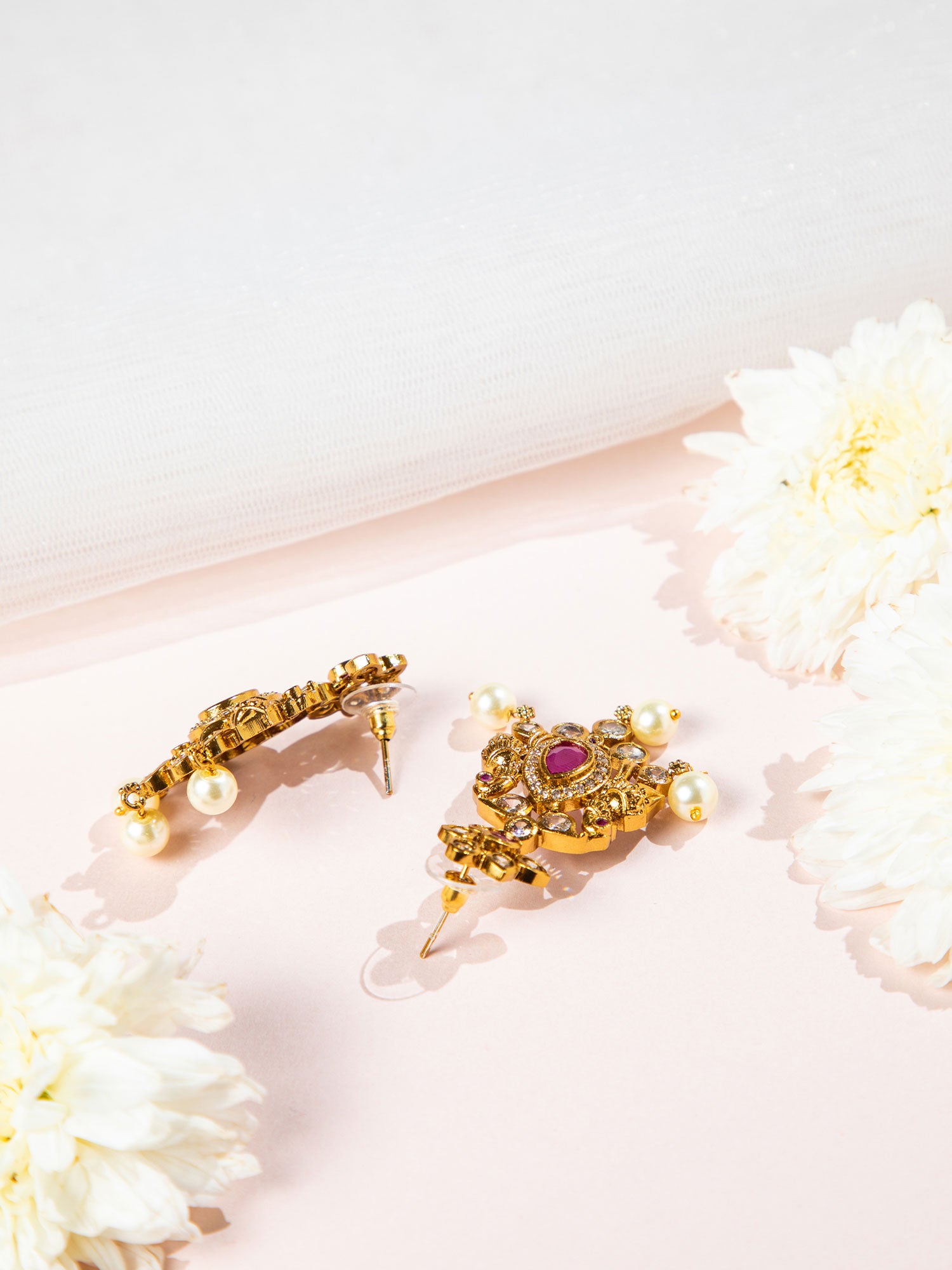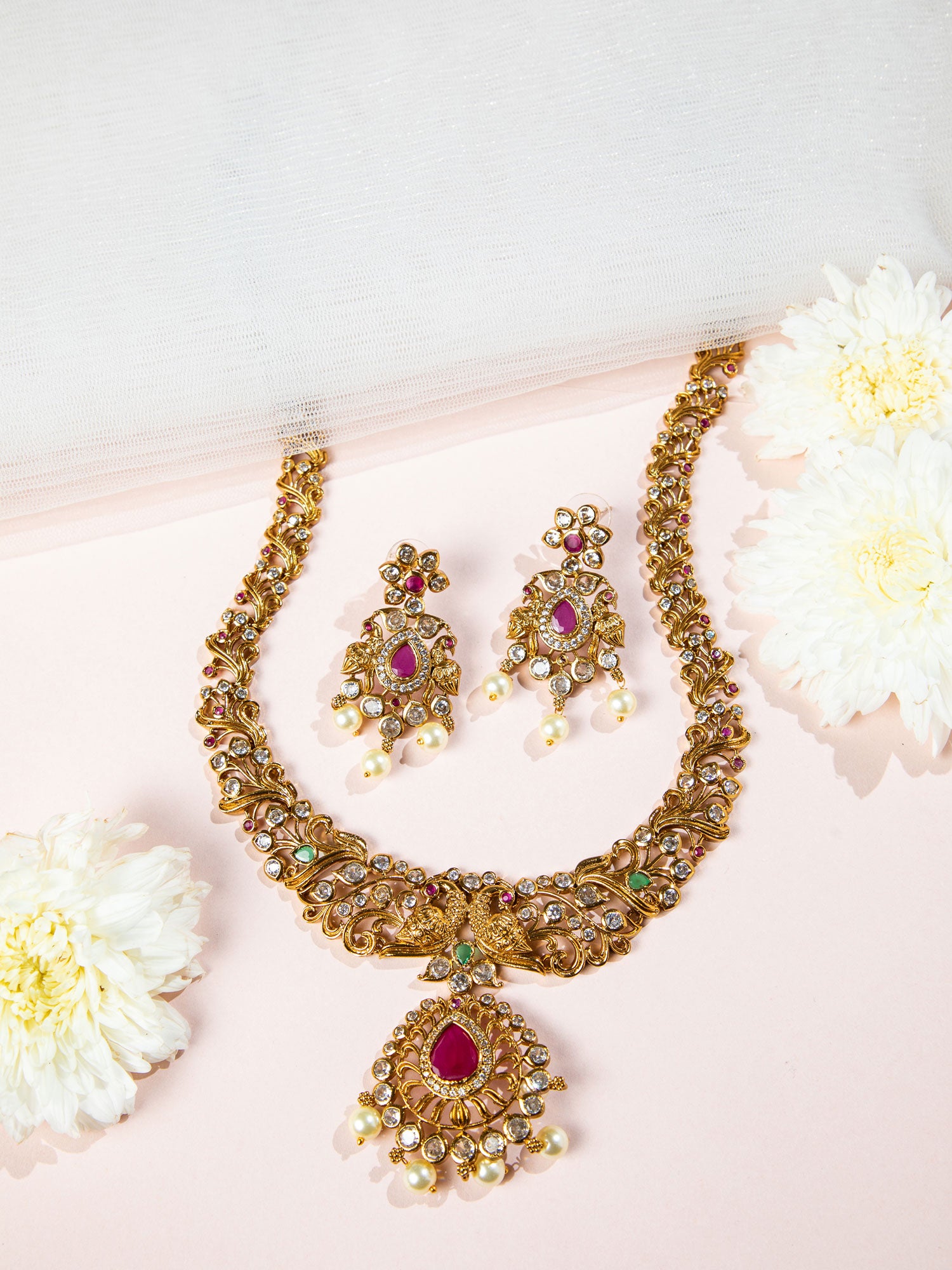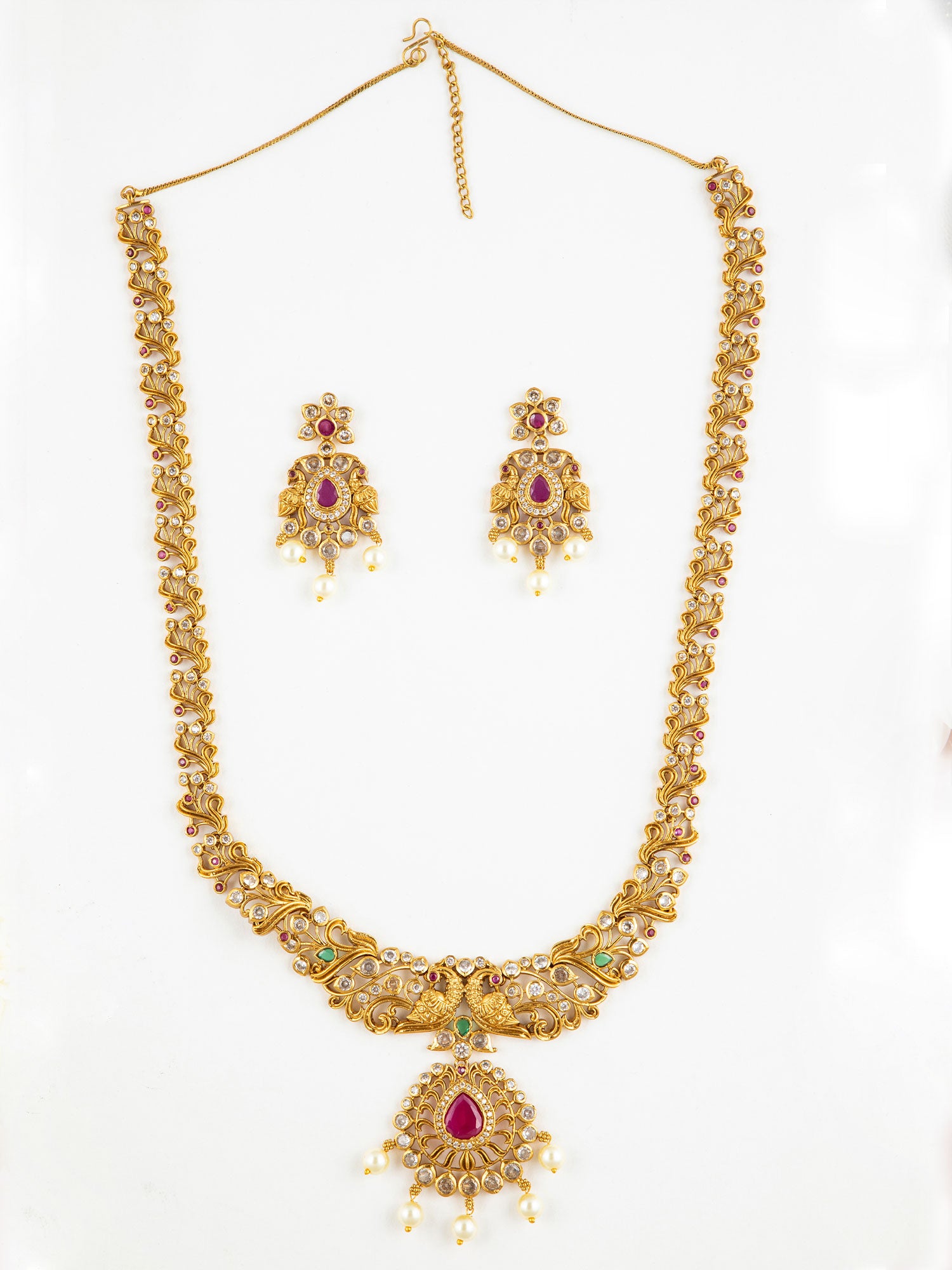 A gold-plated floral-inspired necklace featuring a central deep-rose (ruby-hued) teardrop stone, adorned with sparkling crystals and dangling pearls; matching earrings mirror the leafy motif. This ornate set elevates traditional elegance with a modern flair—perfect for weddings or festive celebrations.