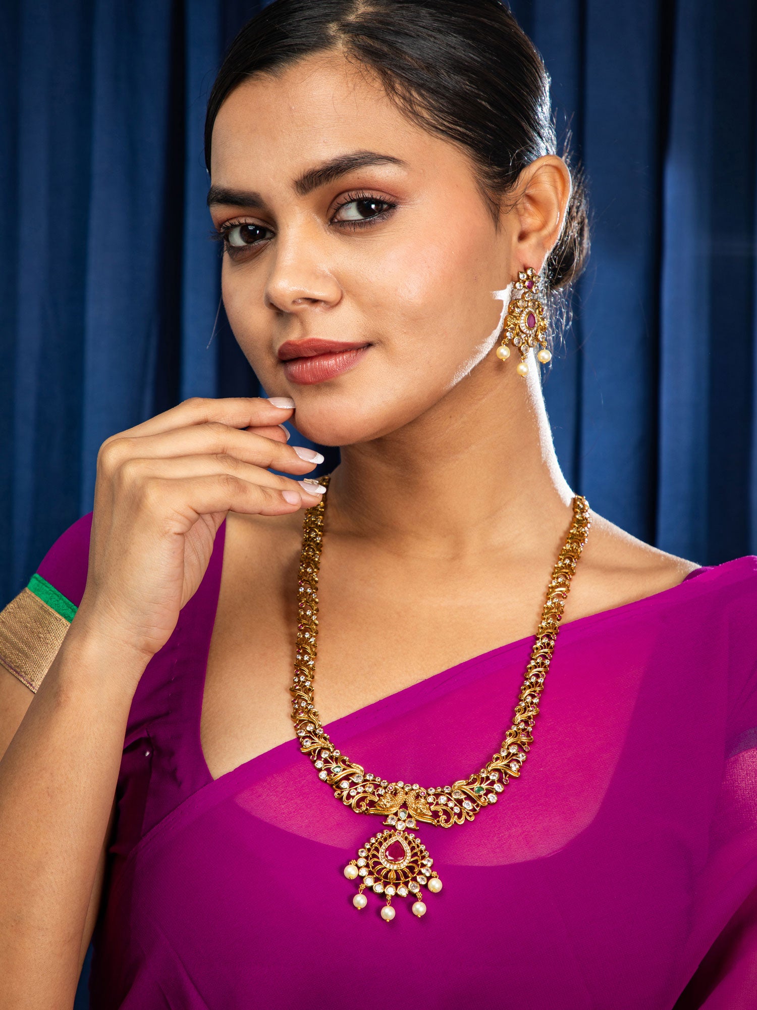 Complement with a deep-maroon or off-white saree or lehenga to enhance the ruby and pearl brilliance at your neckline.