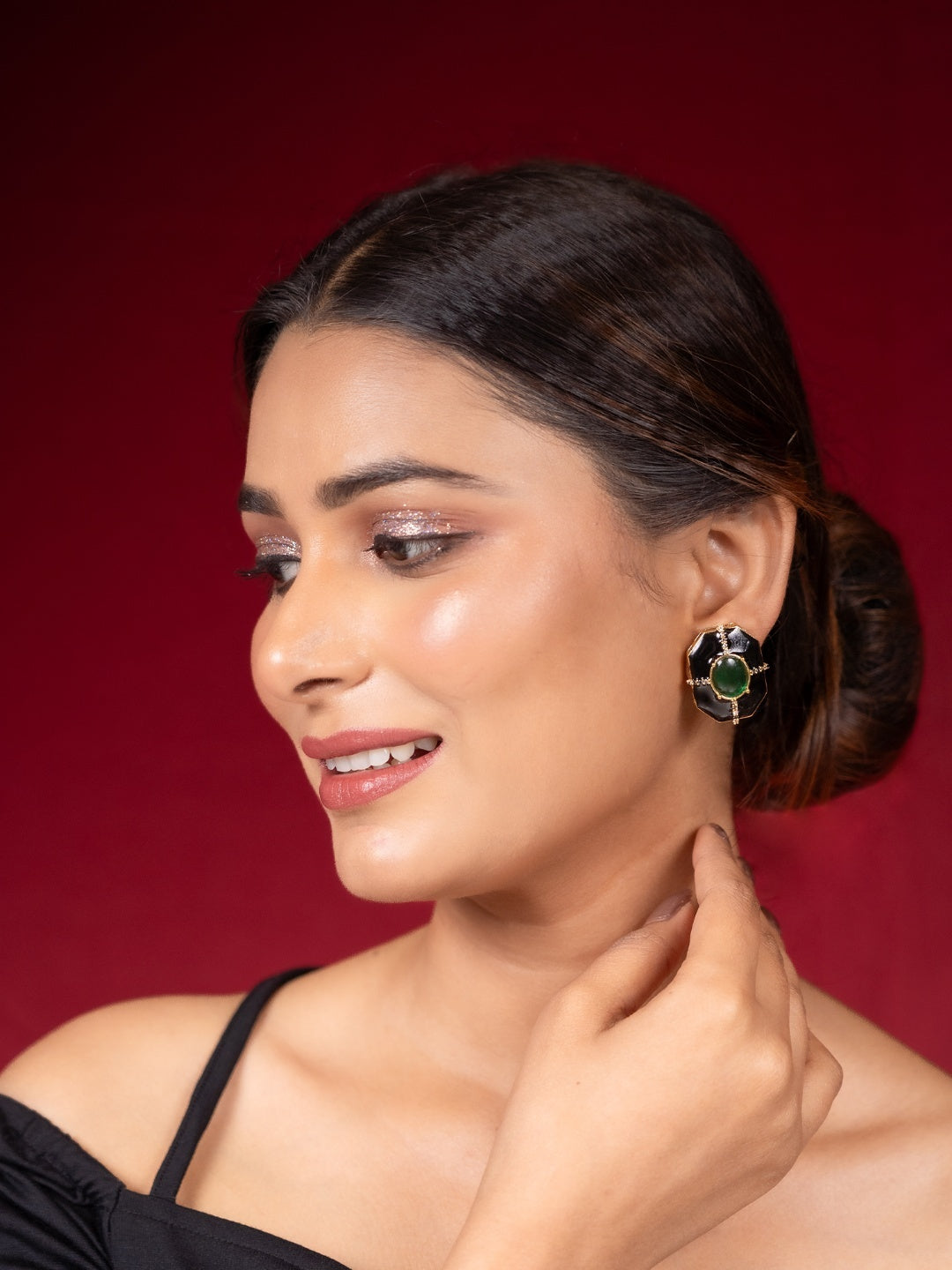 Pair these gold-plated black and green emerald stud earrings with a sleek black dress or an emerald green saree for a coordinated look. To highlight their elegance, style your hair in a chic updo or side-swept waves. Add a delicate gold bracelet or ring to complete your ensemble with effortless charm.