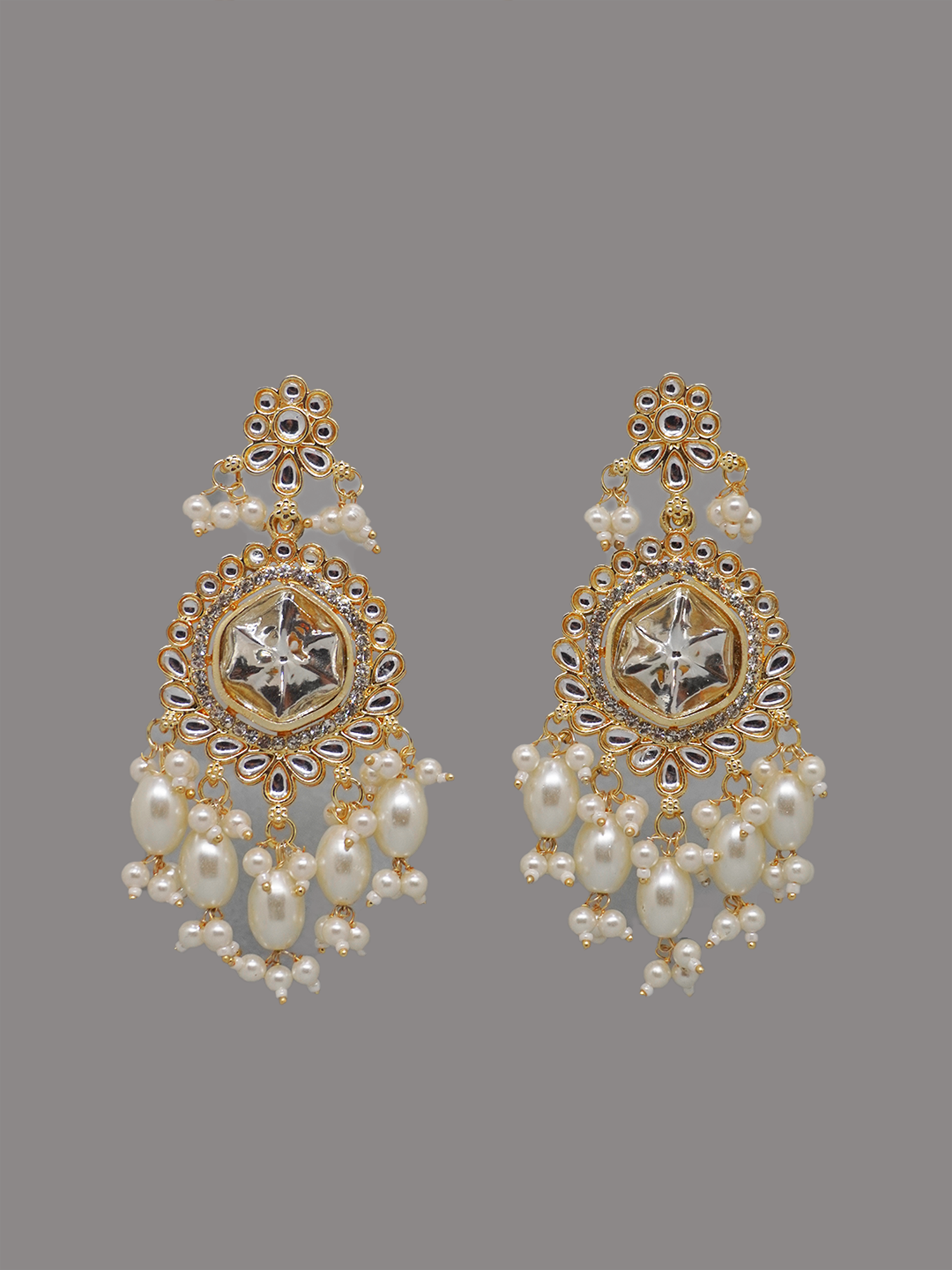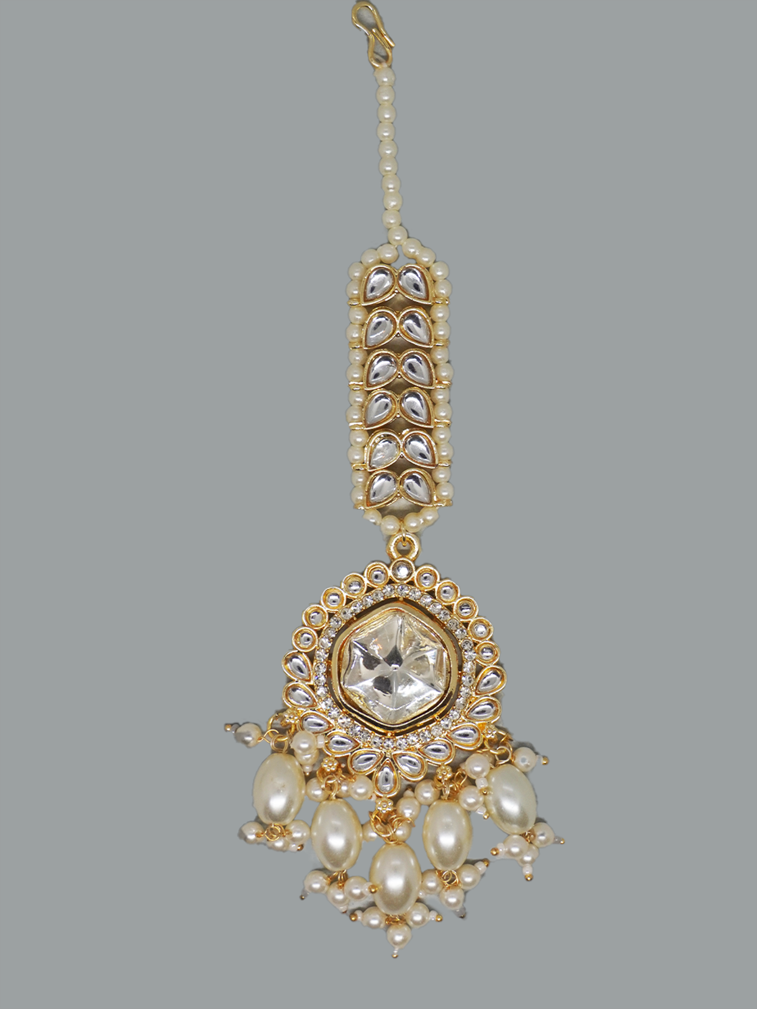 Indulge in elegance with this Gold-Plated Choker Necklace Set, featuring matching earrings and a maang-tikka adorned with Polki Kundan and White CZ Stones. Crafted from brass, the necklace boasts a stunning multilayered chain of pink and white faux pearls. Its choker dazzles with a mesmerizing polki design and faux white pearl accents. The long earrings and maang-tikka complete the ensemble, showcasing the latest in ethnic jewelry design.