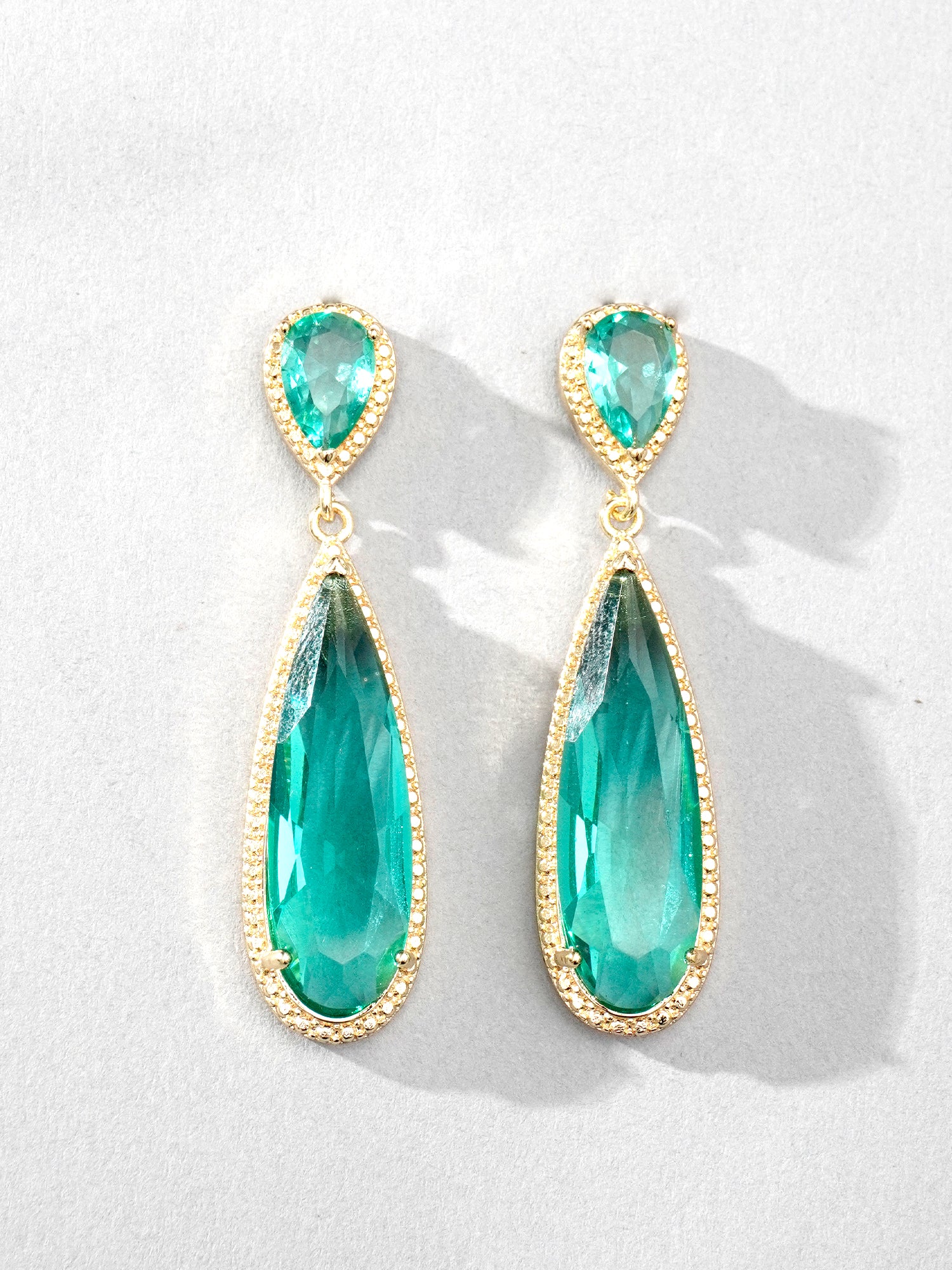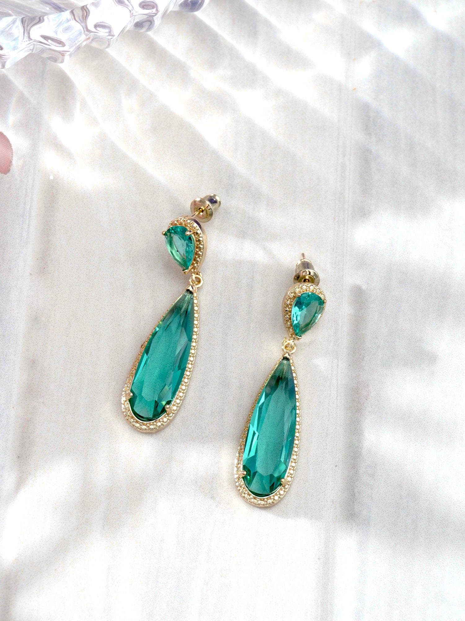 These gold-plated water drop earrings with green accents are perfect for adding a touch of elegance to your outfits. For a chic daytime look, pair them with a crisp white blouse and tailored jeans to let the earrings shine as a statement piece. For evening events, consider wearing them with a deep green or gold gown to create a harmonious and sophisticated look. Style your hair in soft waves or an elegant updo to highlight the earrings, and keep your makeup fresh with a natural glow and a soft pink lip.