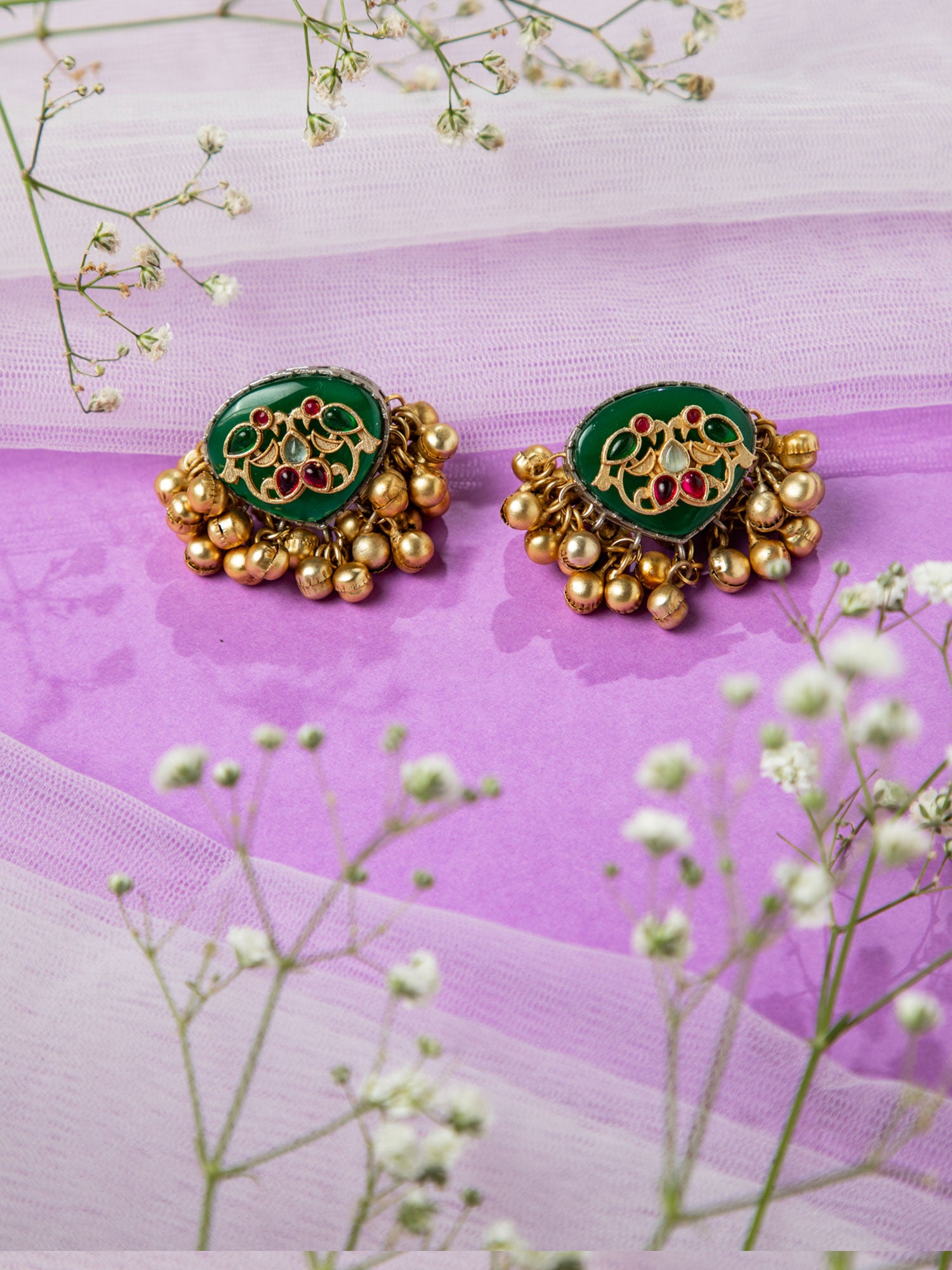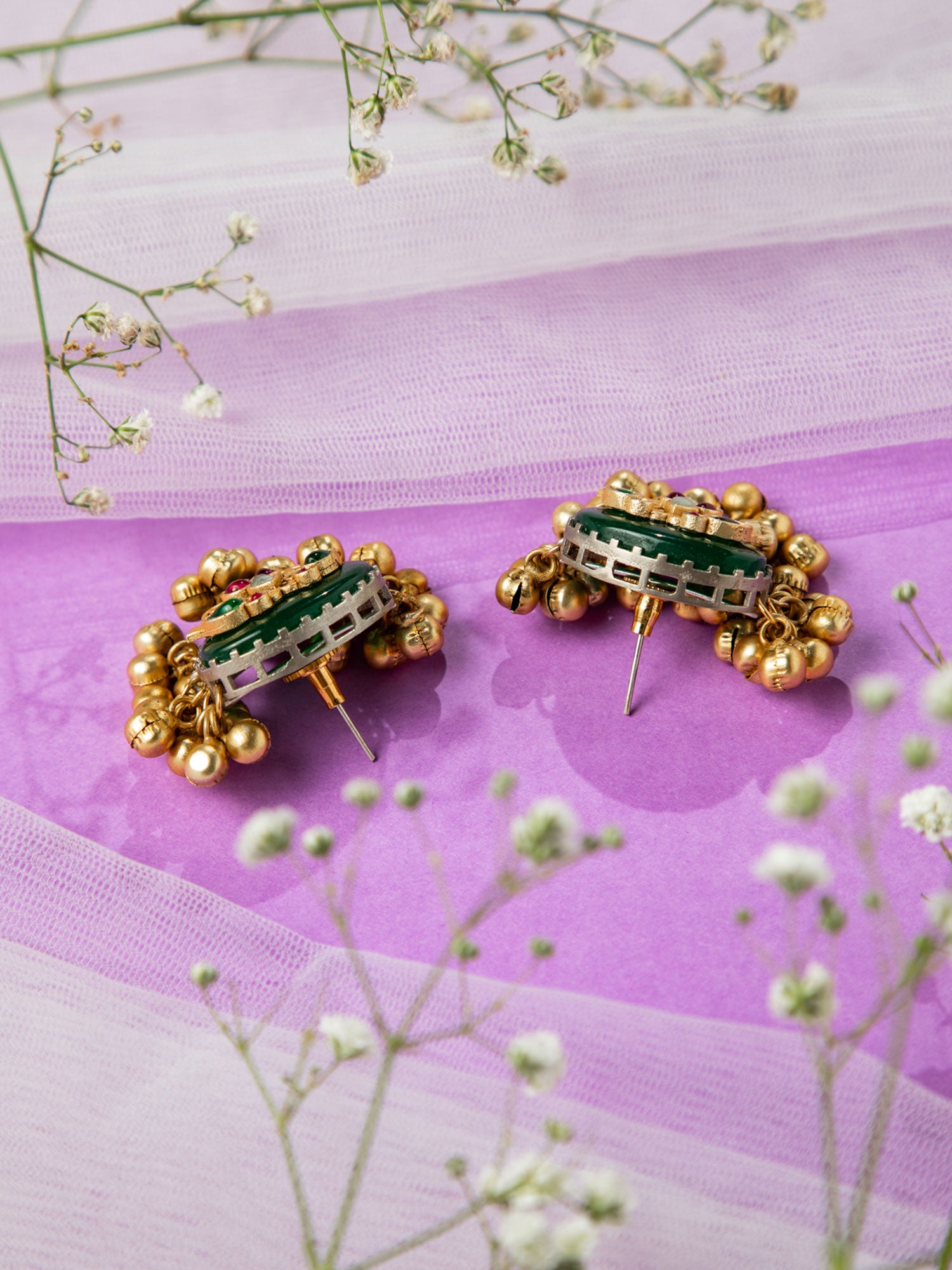 Mesmerizing gold-plated earrings featuring a large green stone with ruby and emerald accents. Adorned with gold-plated metal pearls, this floral-inspired design is handcrafted by local artisans. A must-have for parties, festivals, or functions, offering a modern, elegant touch.