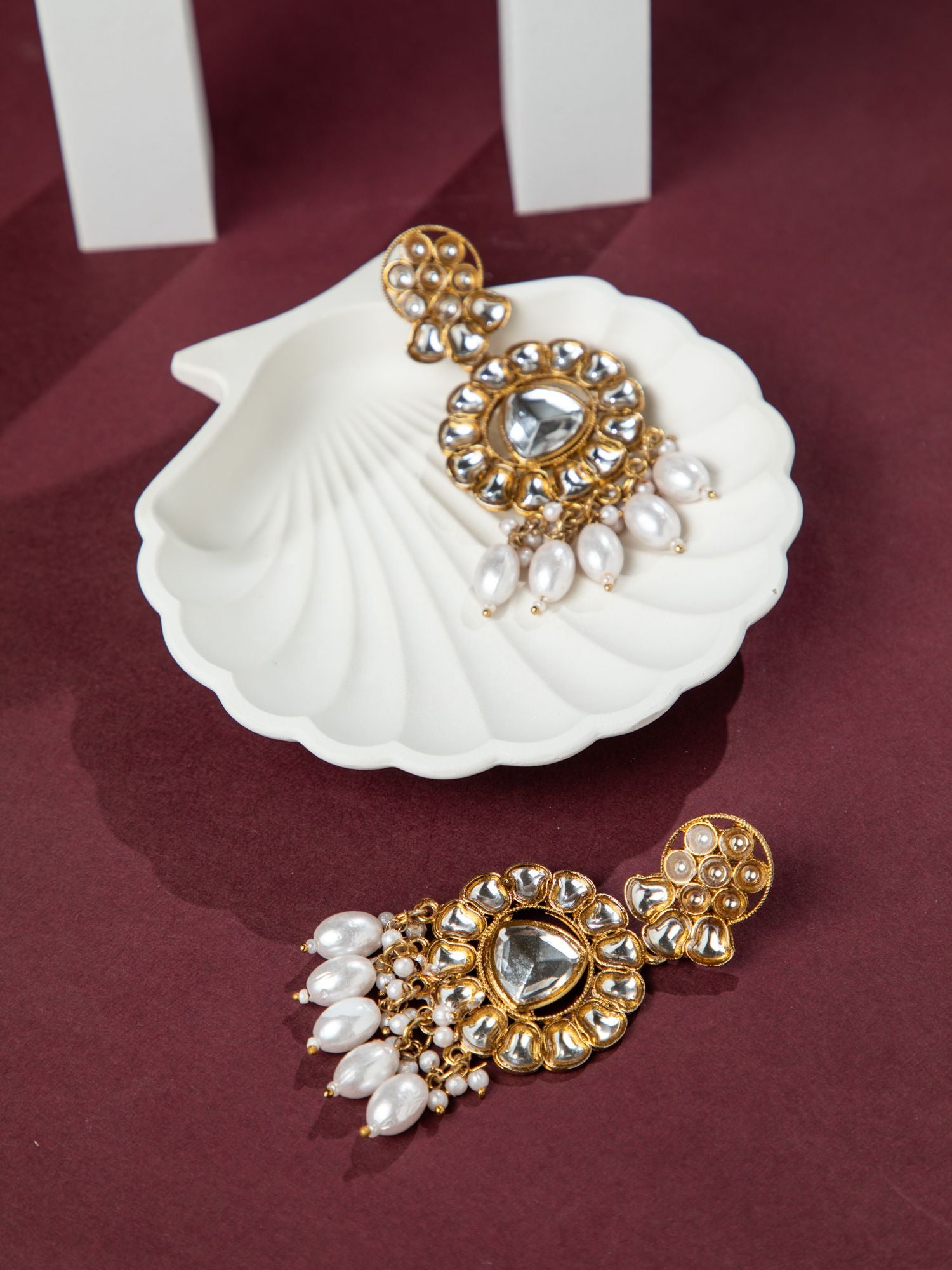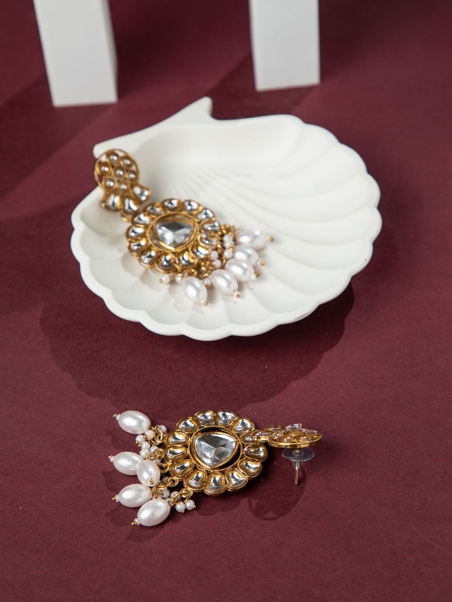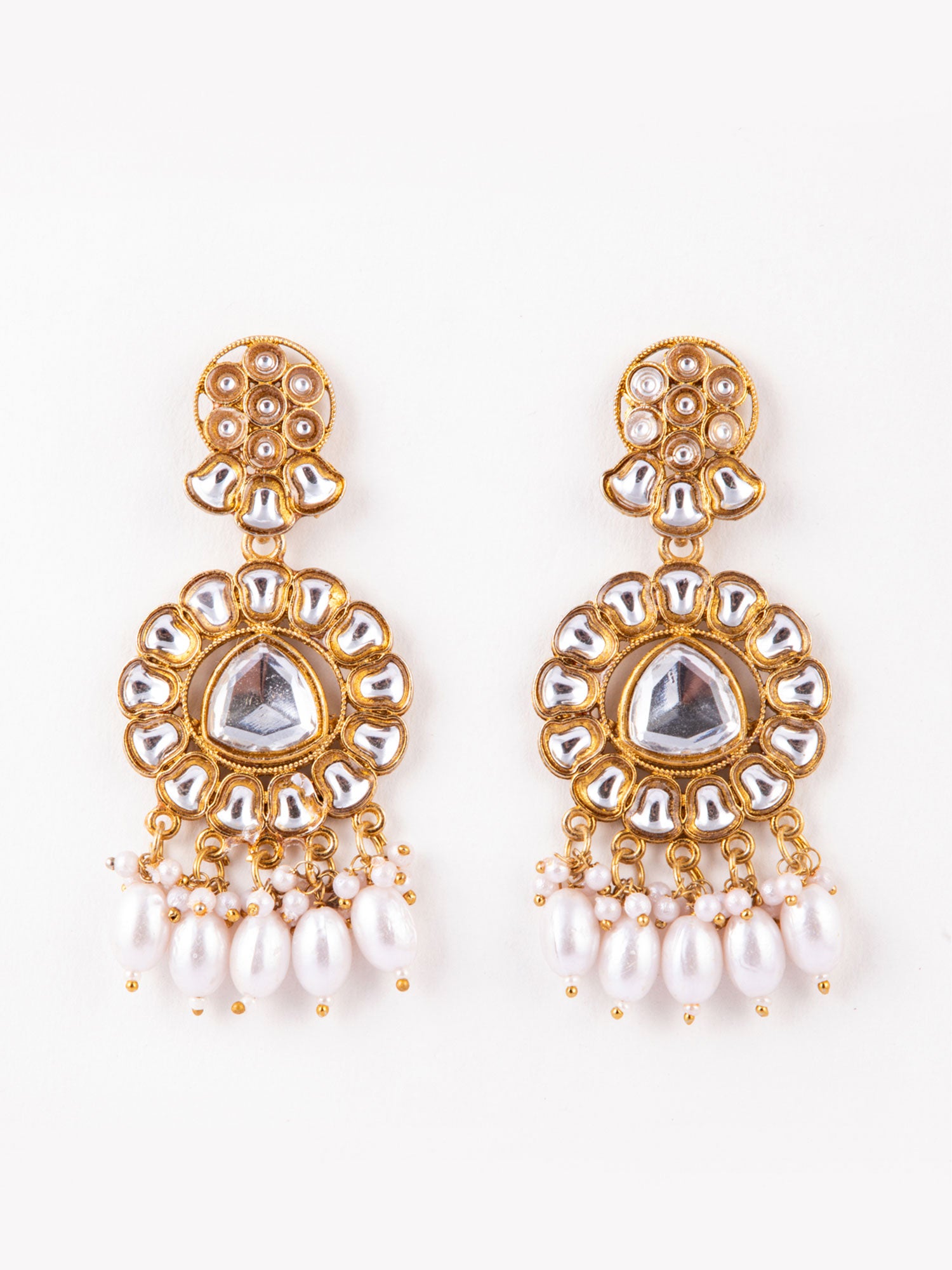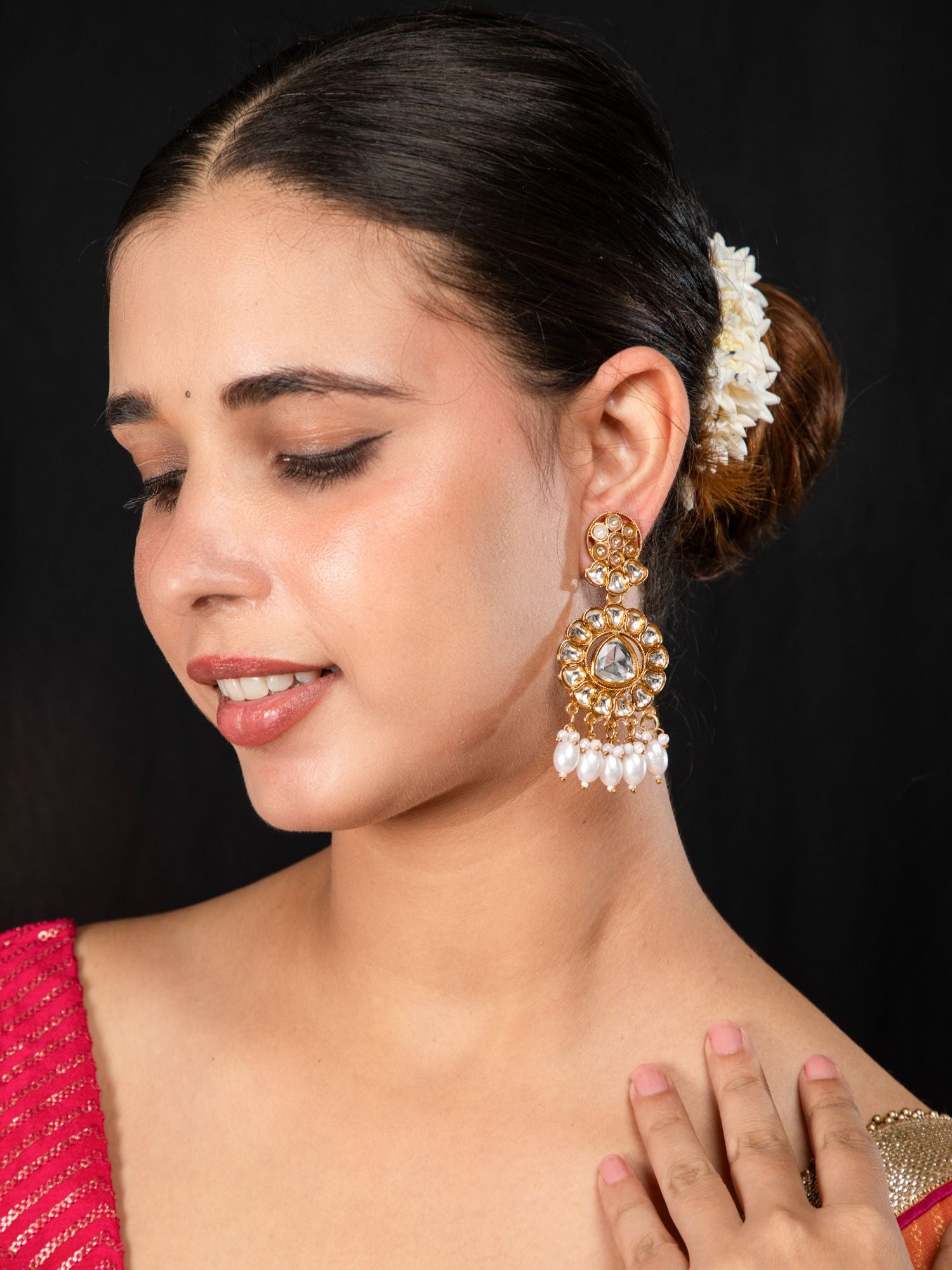 Gold Plated Long Dangler Earrings with White Kundan and Faux Pearls