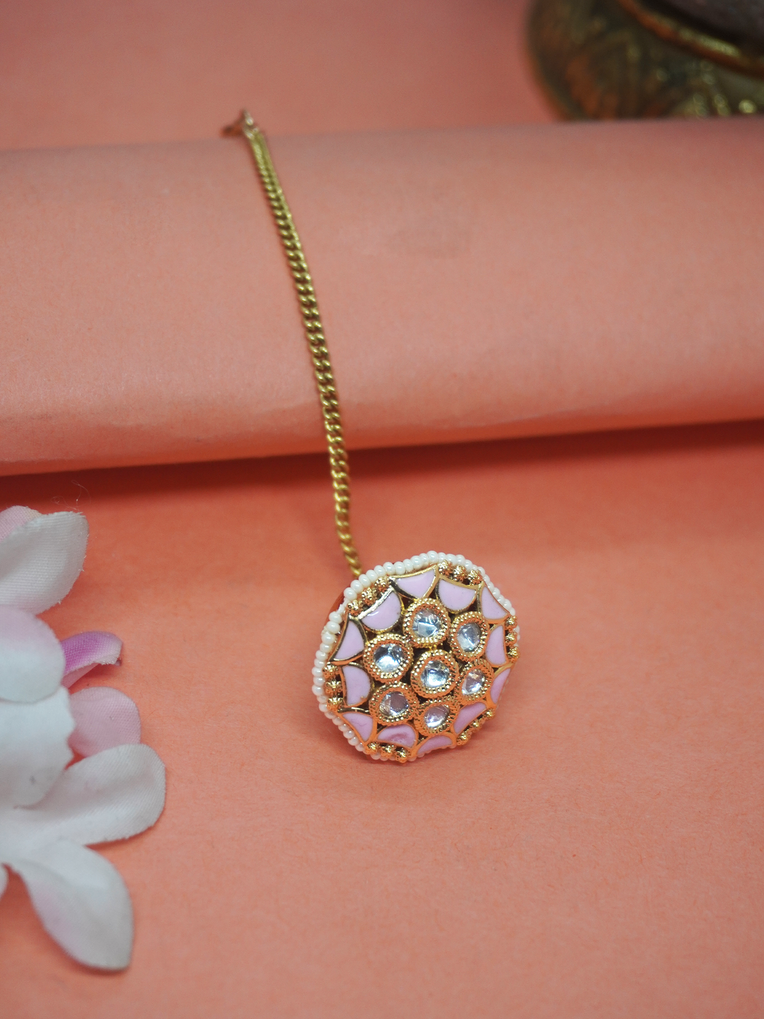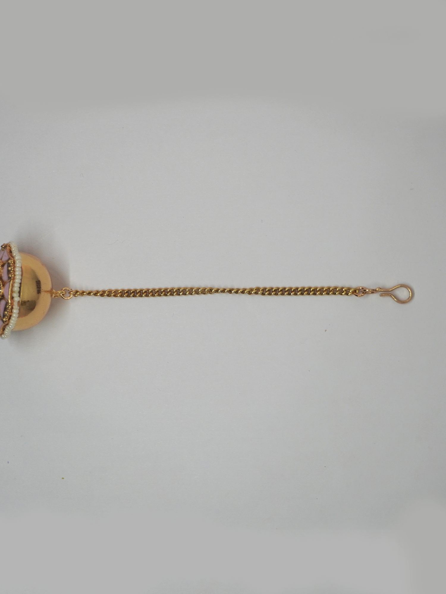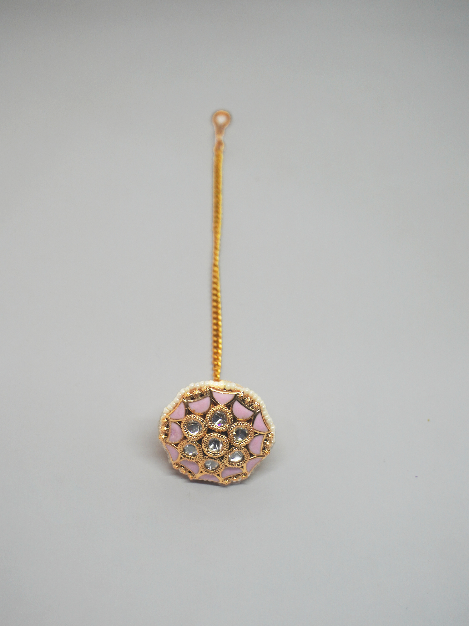 Elevate your look with our stunning Gold Plated Mang Tikka featuring small white faux pearls, layers of pink crescent designs, white CZ stones, and a central red ruby stone. Handcrafted by local artisans, this mesmerizing piece blends traditional charm with contemporary elegance, perfect for daily wear or special occasions.