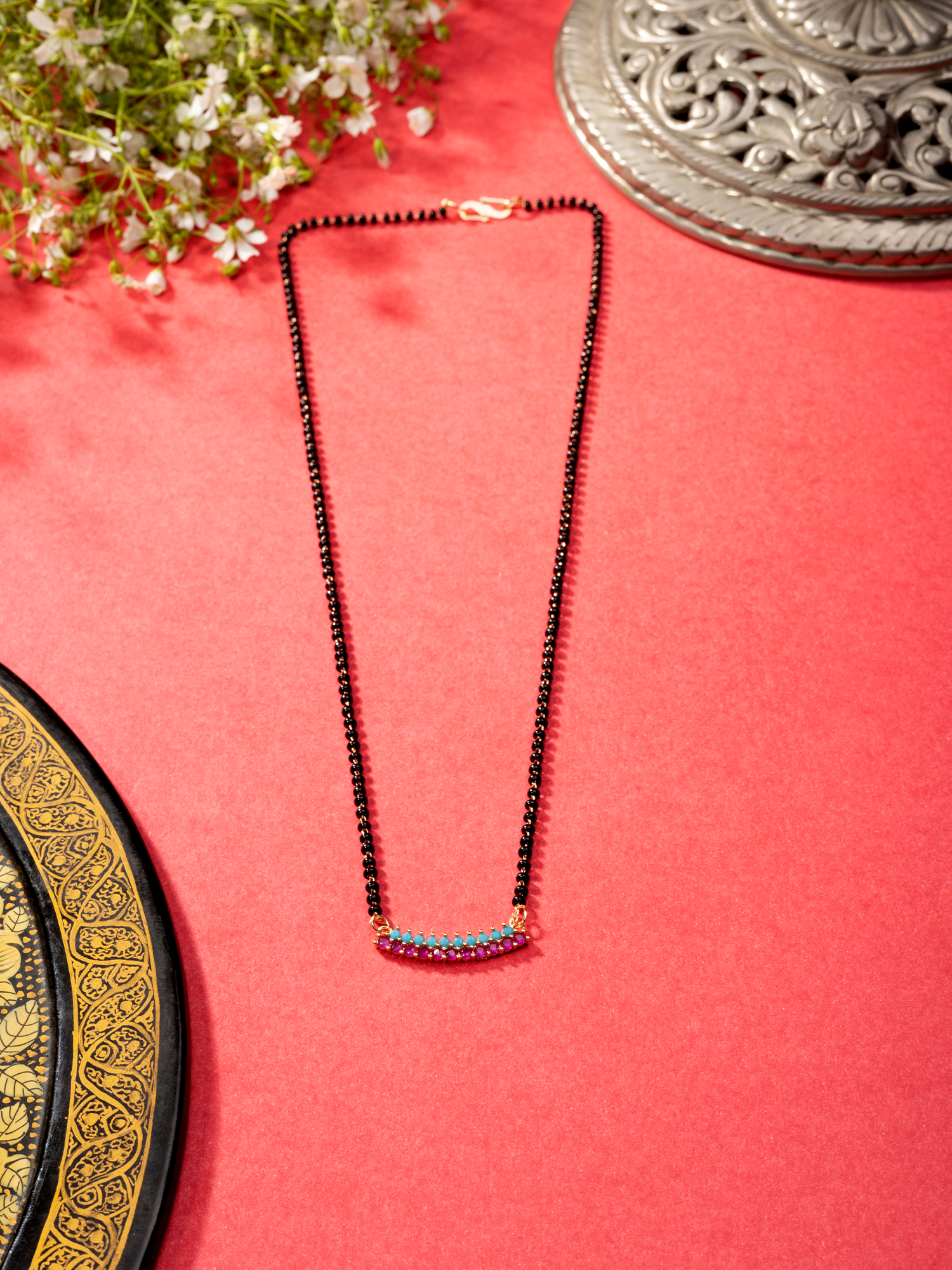 Discover elegance with our captivating Gold Plated Mangalsutra, featuring black beads and a stunning pendant adorned with blue and pink stones. Handmade by skilled local artisans, this stylish piece boasts a contemporary design, perfect for both casual wear and special occasions. Its anti-tarnish property ensures lasting shine. Embrace versatile elegance with this beautiful mangalsutra, meticulously crafted with love and expertise for your everyday and party ensembles.