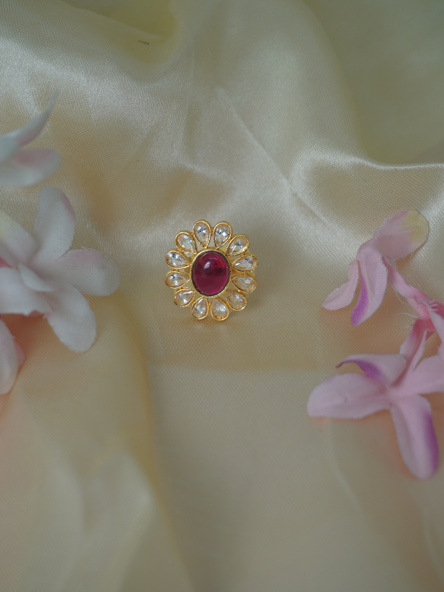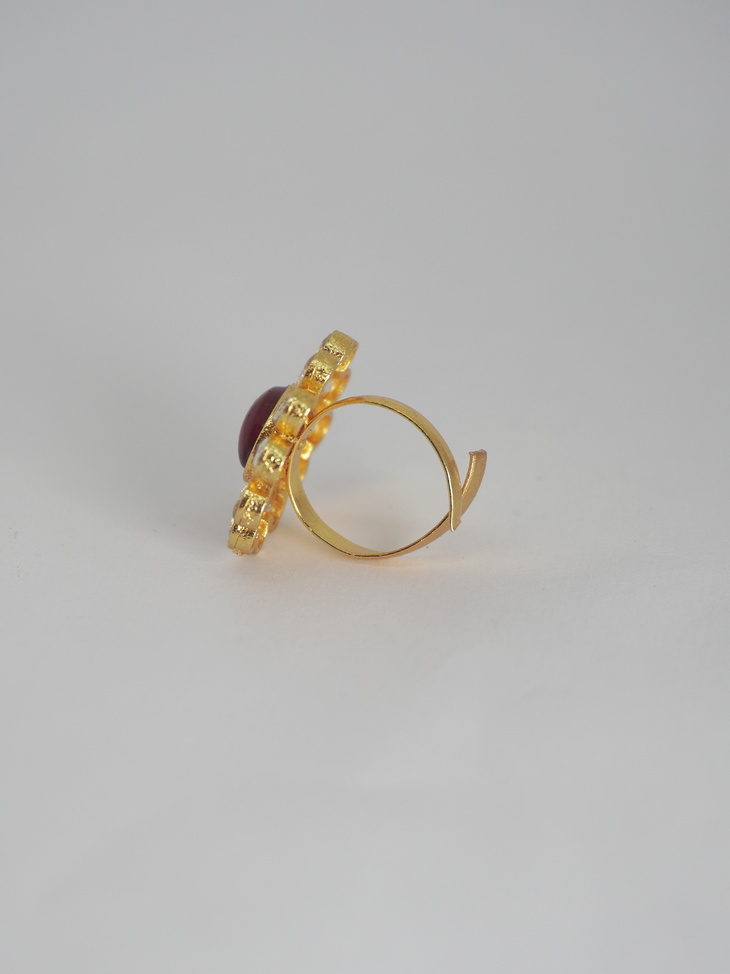 Mesmerize with this gold-plated, oval-shaped ring. Featuring a red ruby-colored stone encircled by water drop kundans, this modern design is handcrafted by local artisans. Perfect for both daily and party wear, showcasing the latest in elegance.