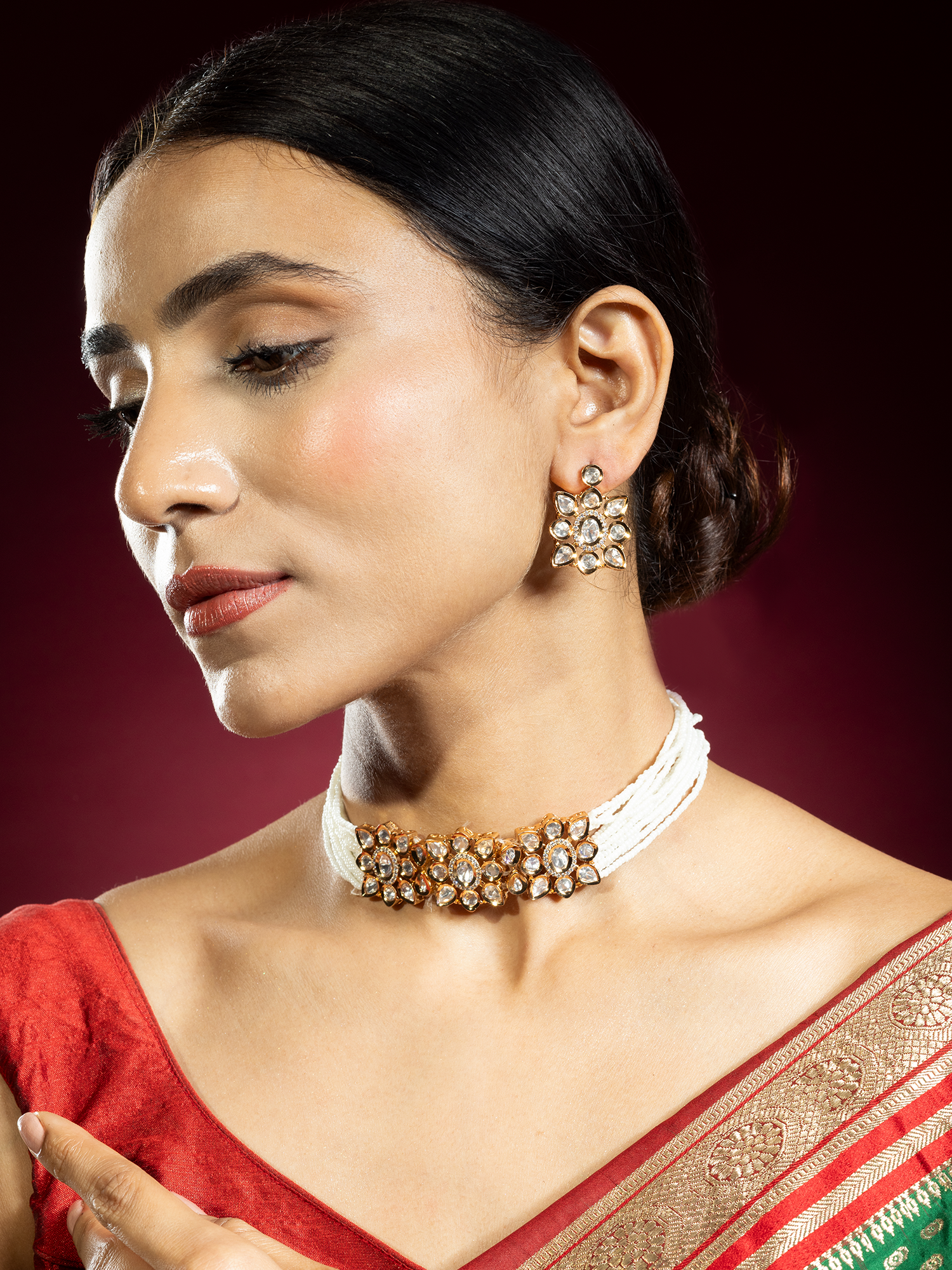 Gold Plated Pearl and Kundan Floral Necklace Set