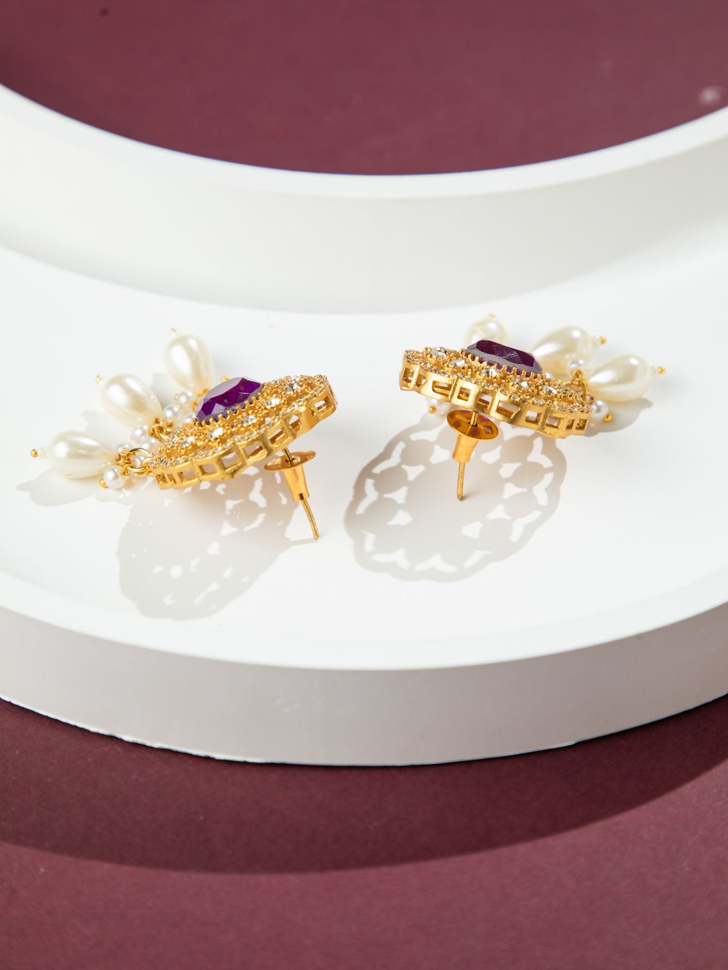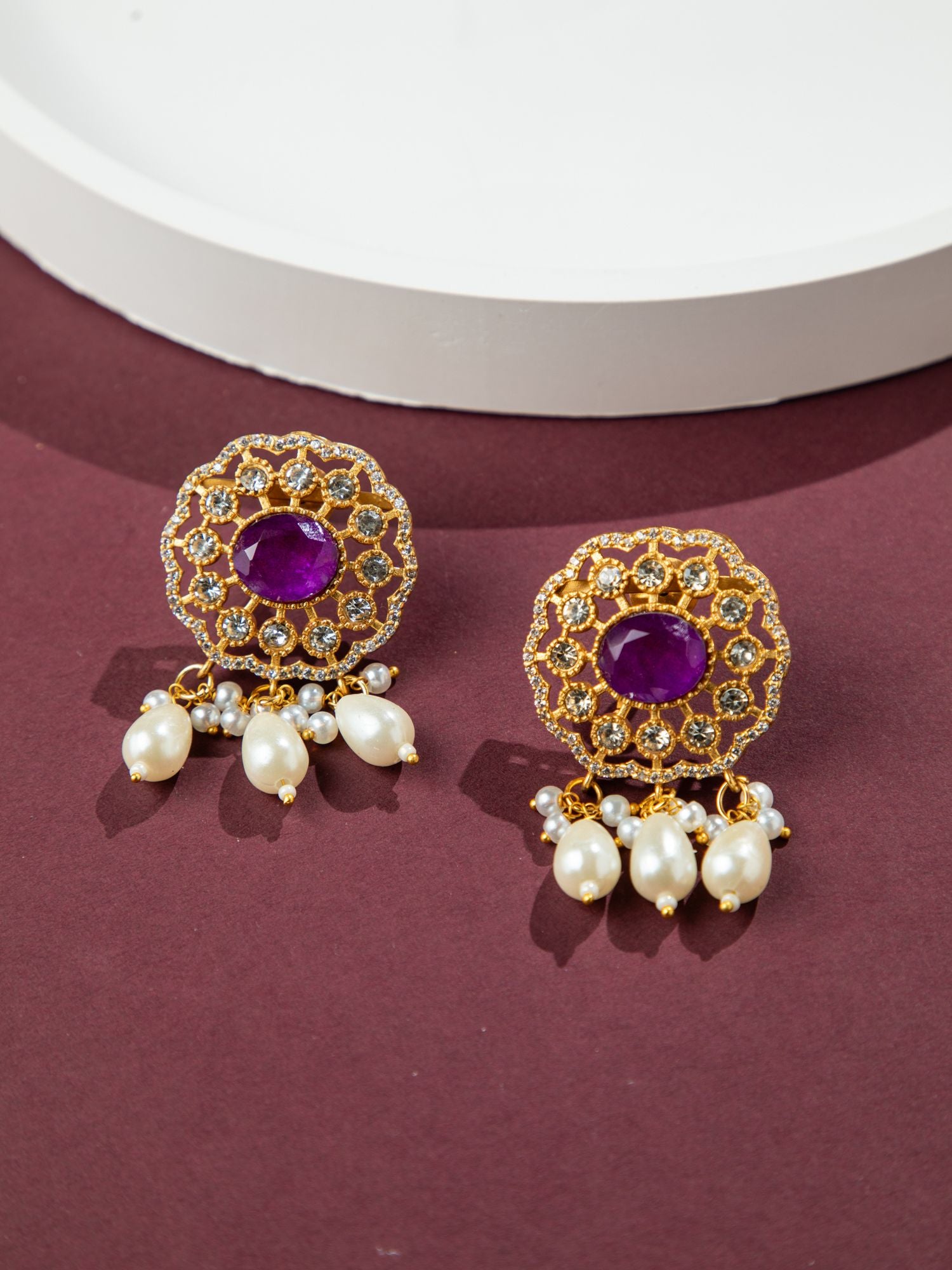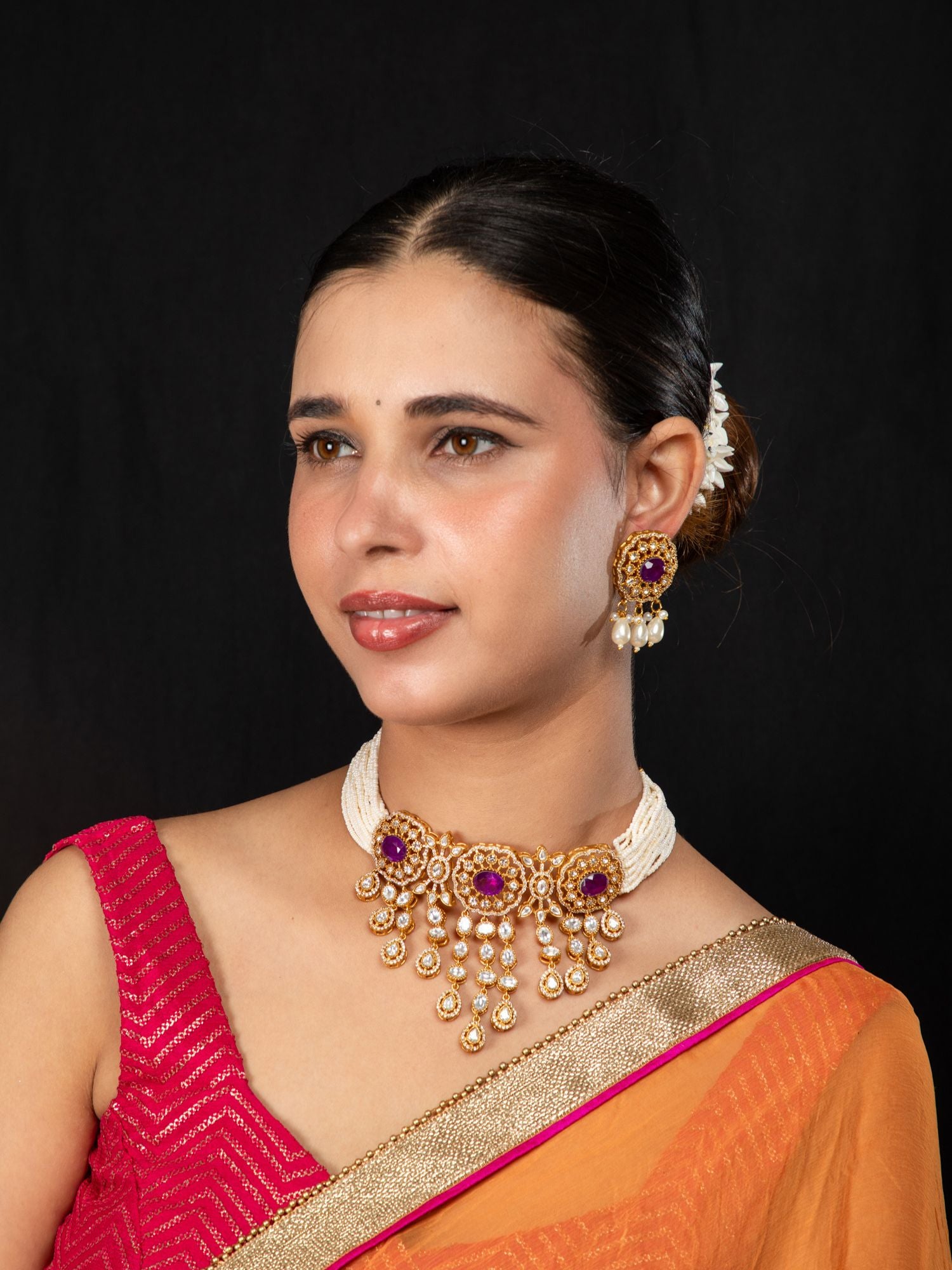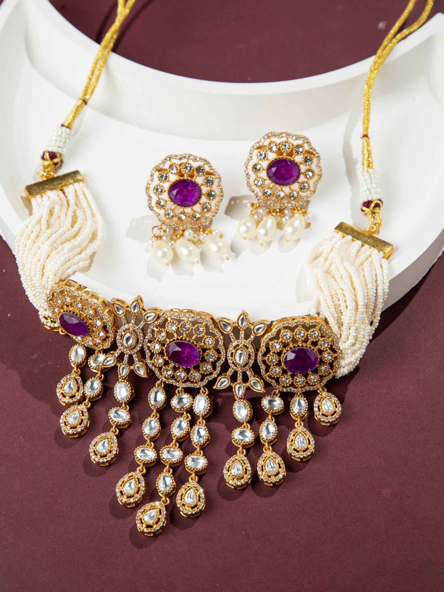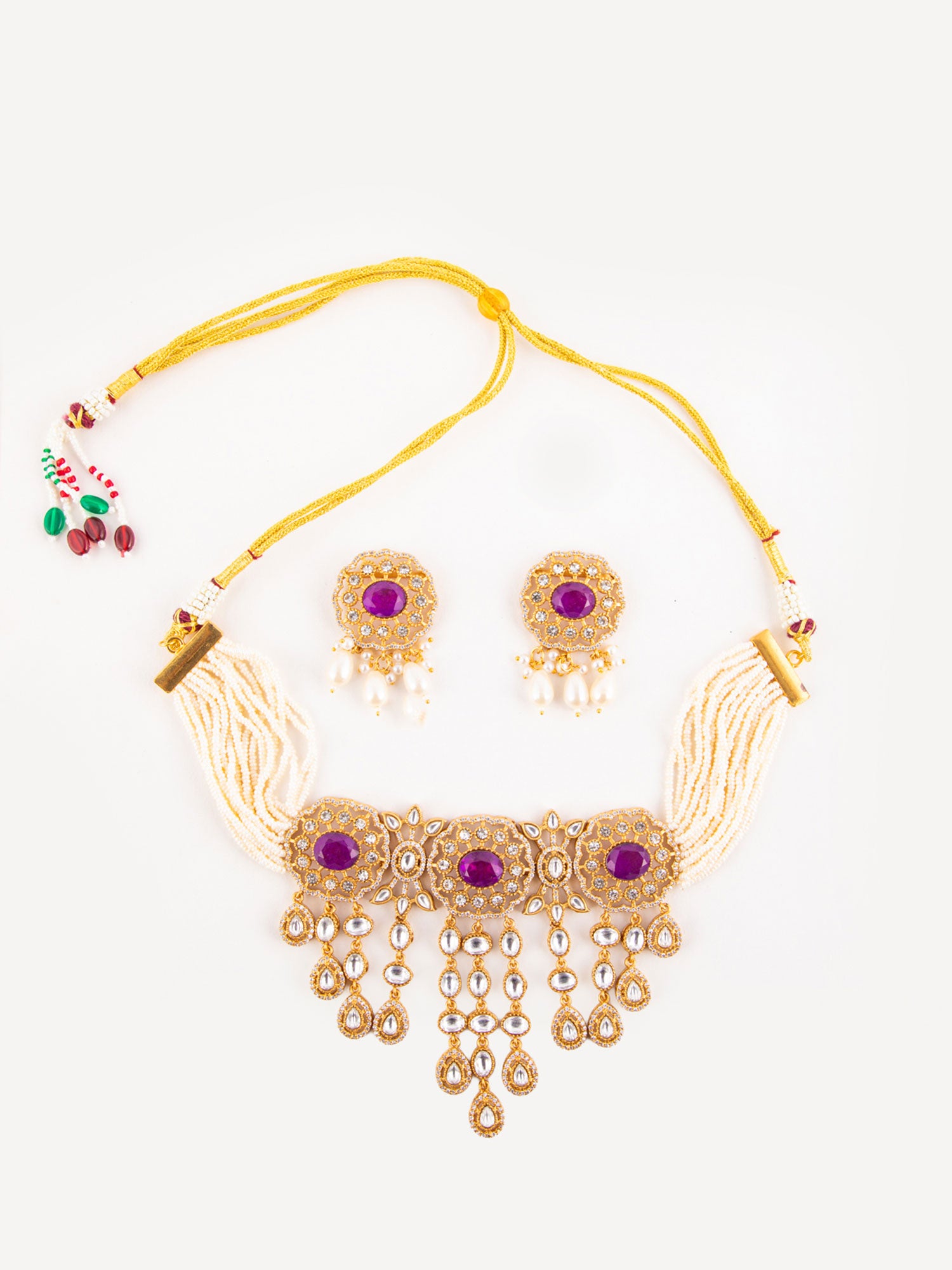 Gold Plated Rajwadi Choker Necklace and Earrings Set with White Kundan, CZ Stones, Pink Stones and Faux Pearls