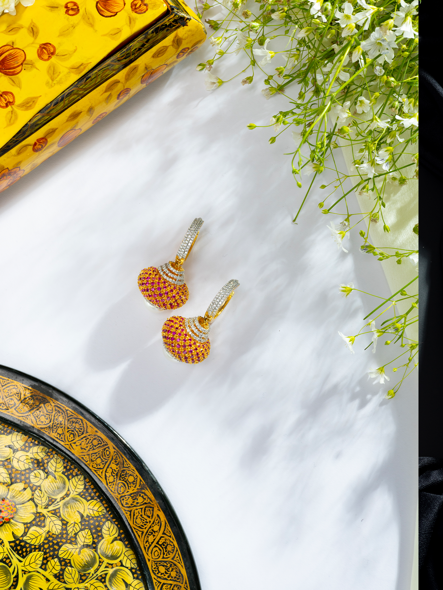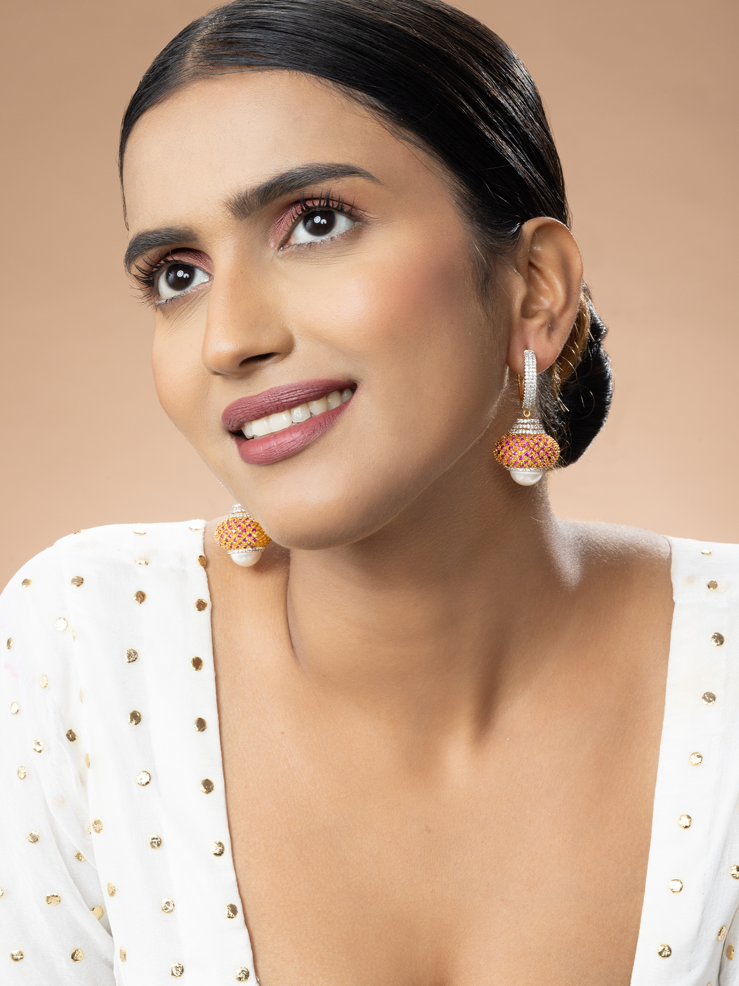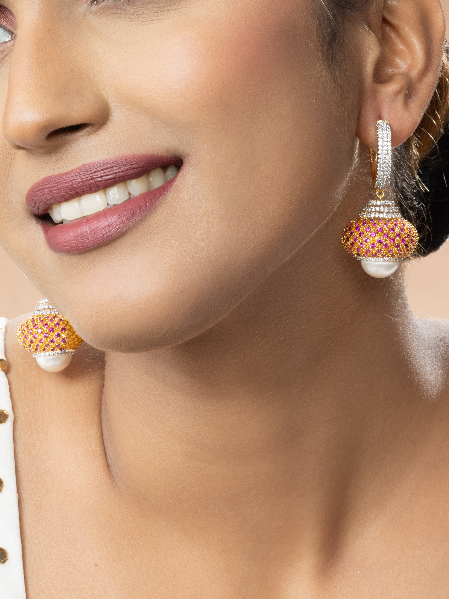 Elevate your style by pairing the Gold Plated Round Earrings with a pastel ensemble, allowing the AAA+ Grade White and Pink Zircon (CZ) stones to shine. The addition of pearls adds a touch of elegance, making these earrings perfect for weddings or parties.