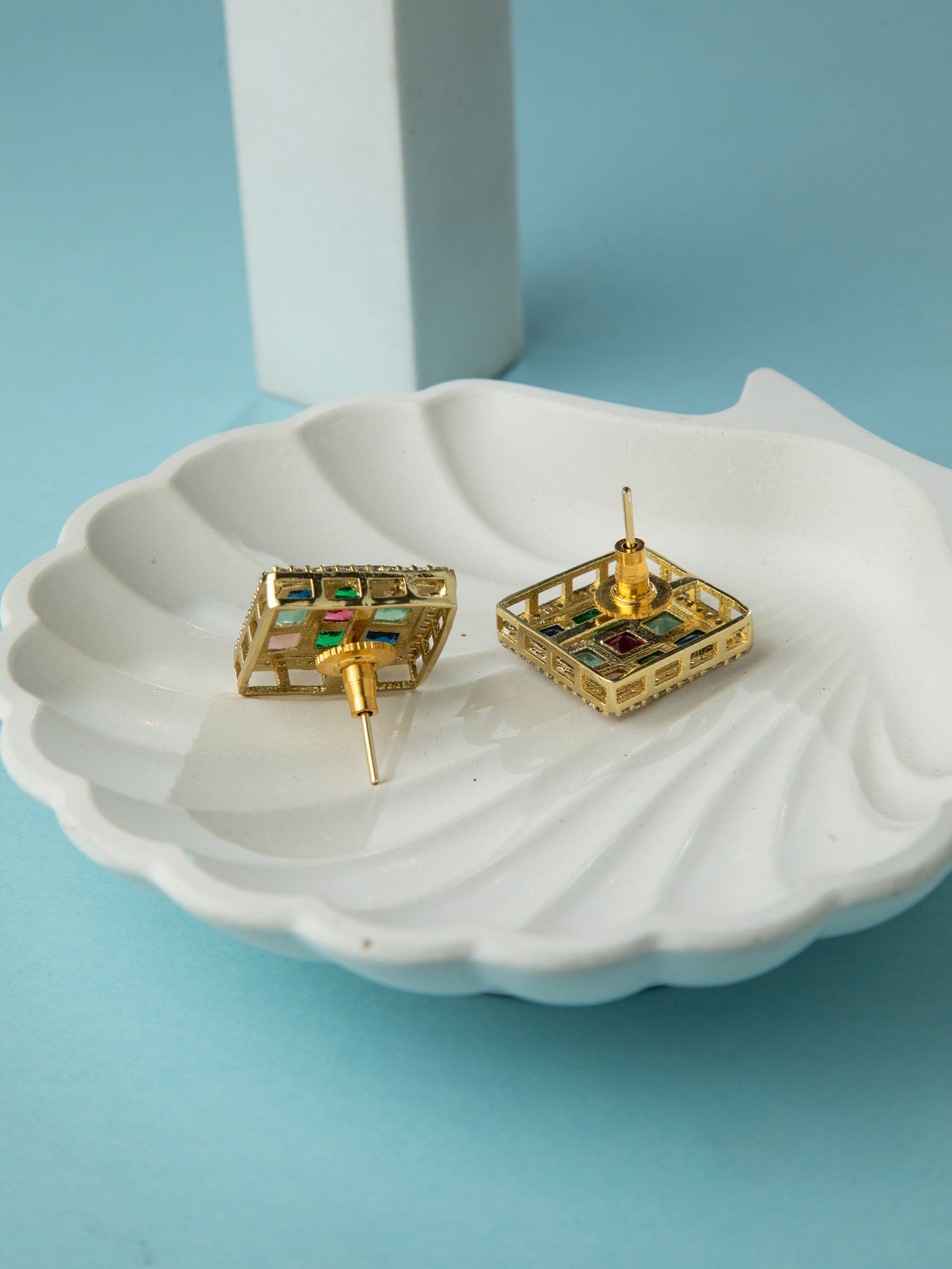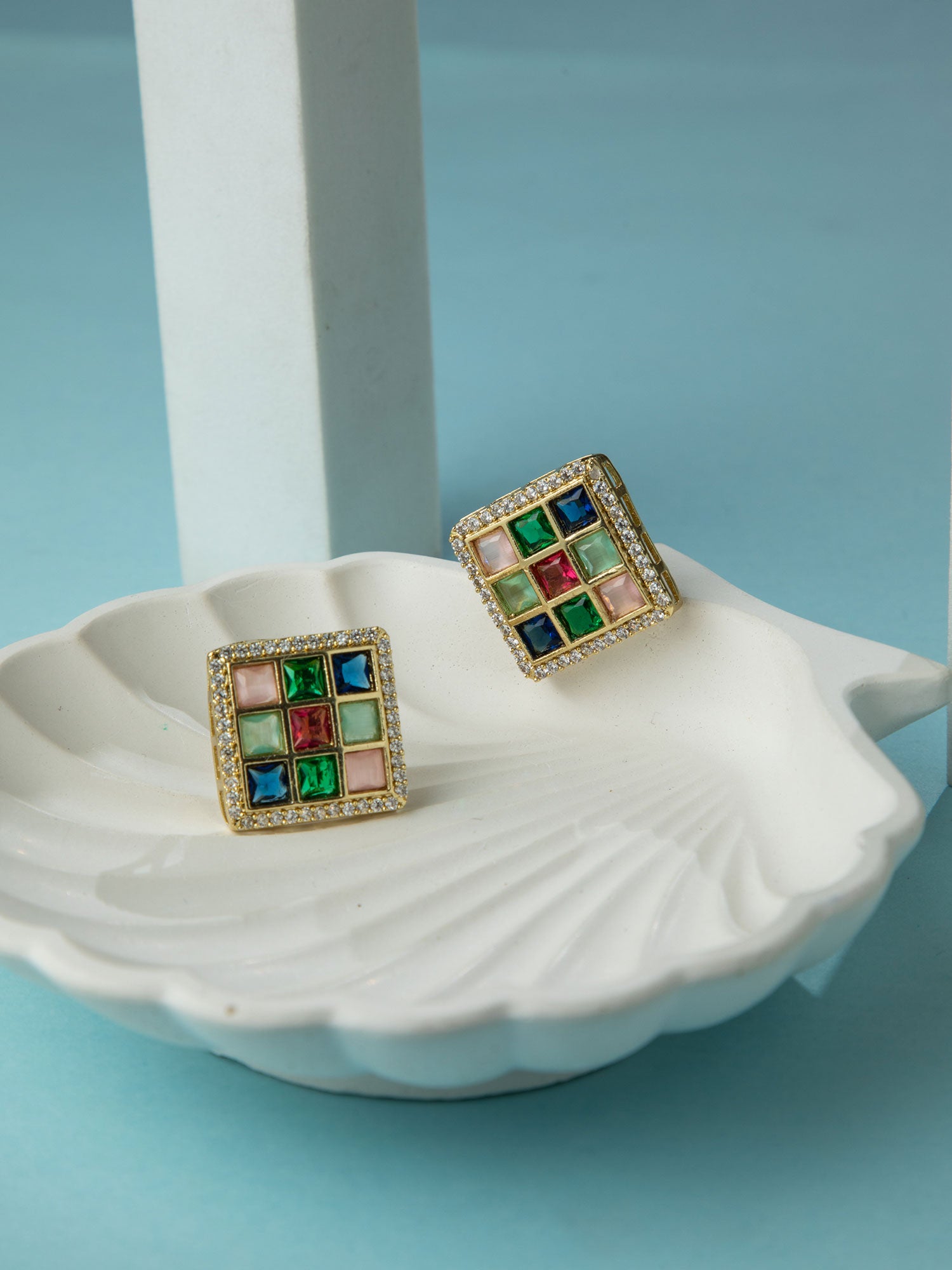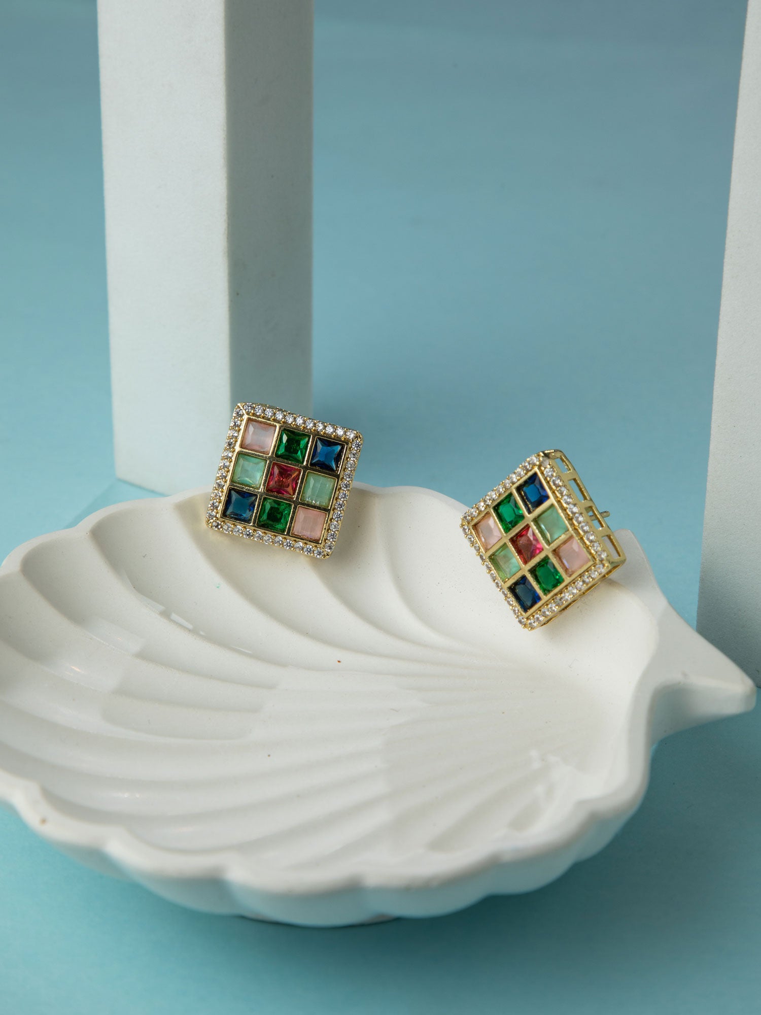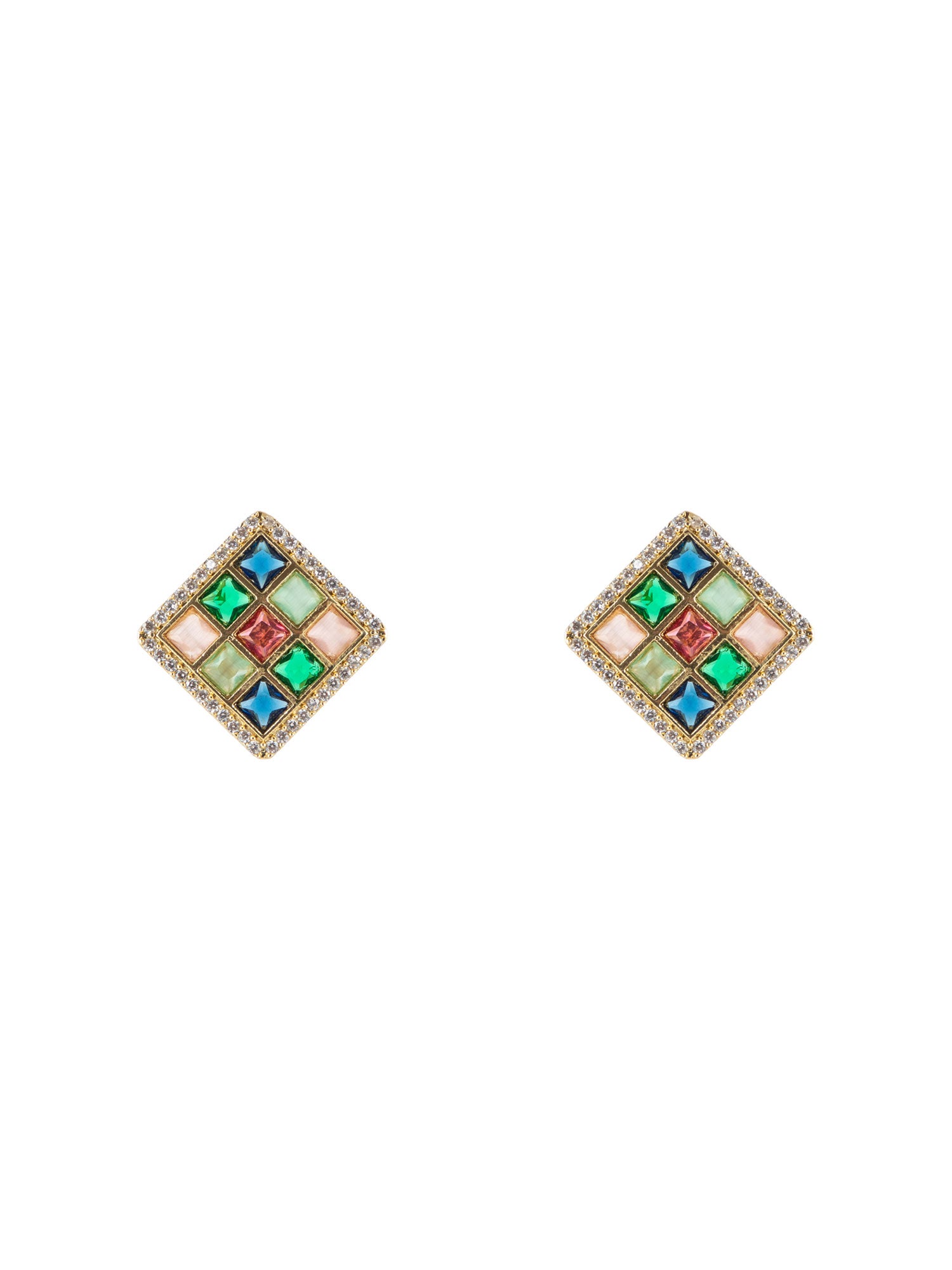 Gold Plated Square Navratan Earrings with White CZ Stones