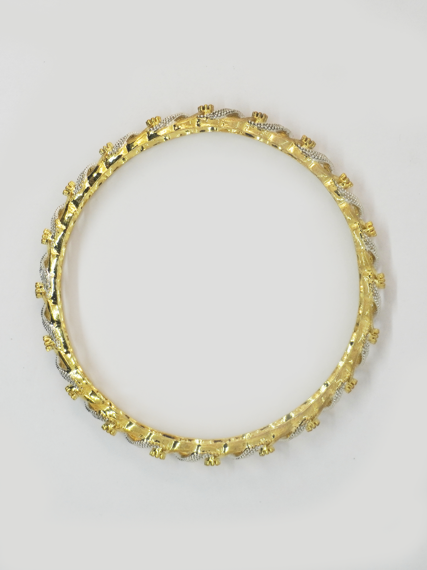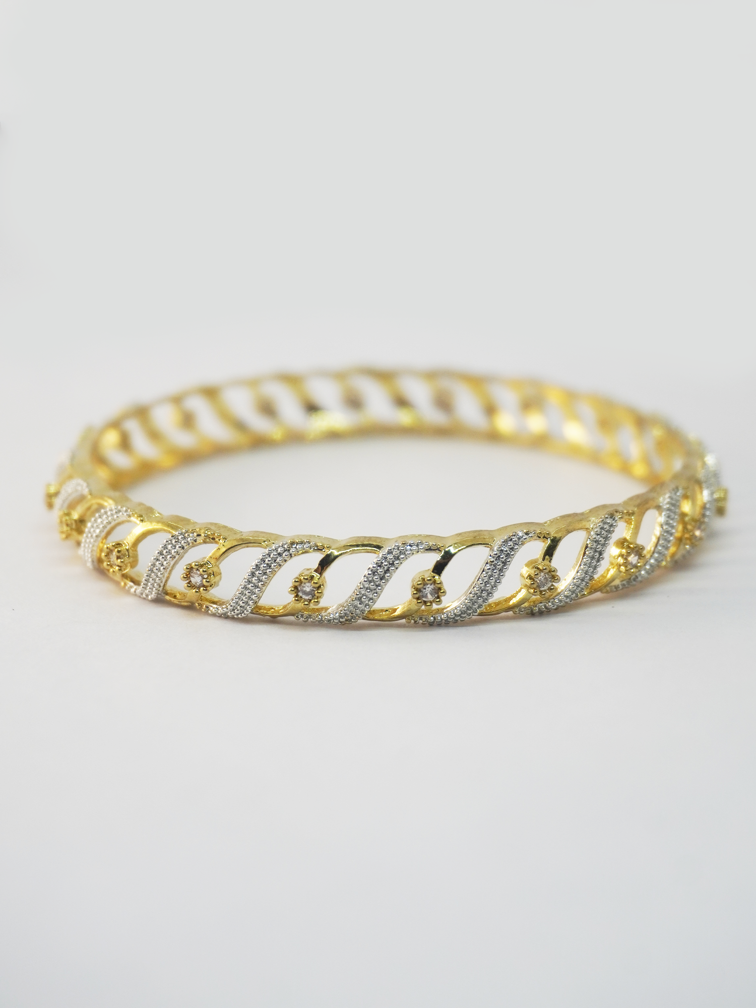 Introducing a pair of gold-plated bangles adorned with white AD stones in a beautiful floral design. Handcrafted by local artisans, these bangles showcase the latest in jewelry design, suitable for both daily wear and parties. Their intricate floral pattern and sparkling stones add elegance and charm to any outfit, making them a versatile and timeless accessory.