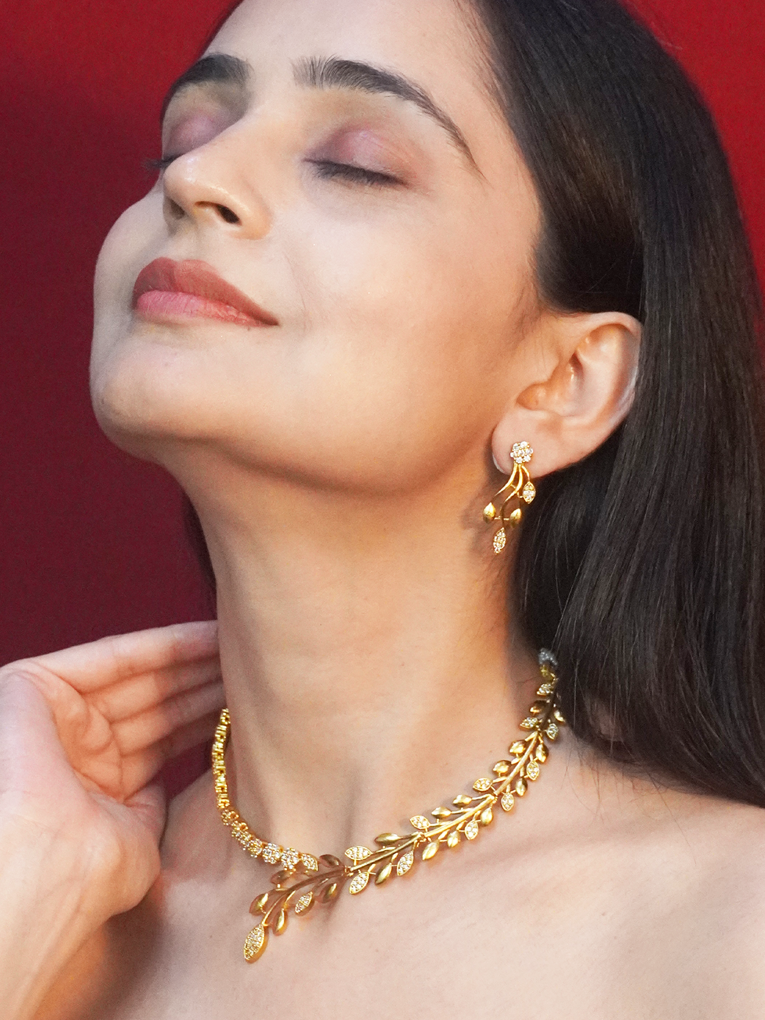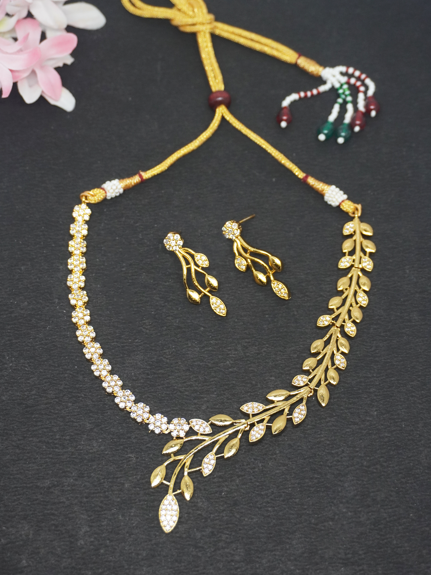 Gold Plated White American Diamond Floral Necklace and Earrings Set