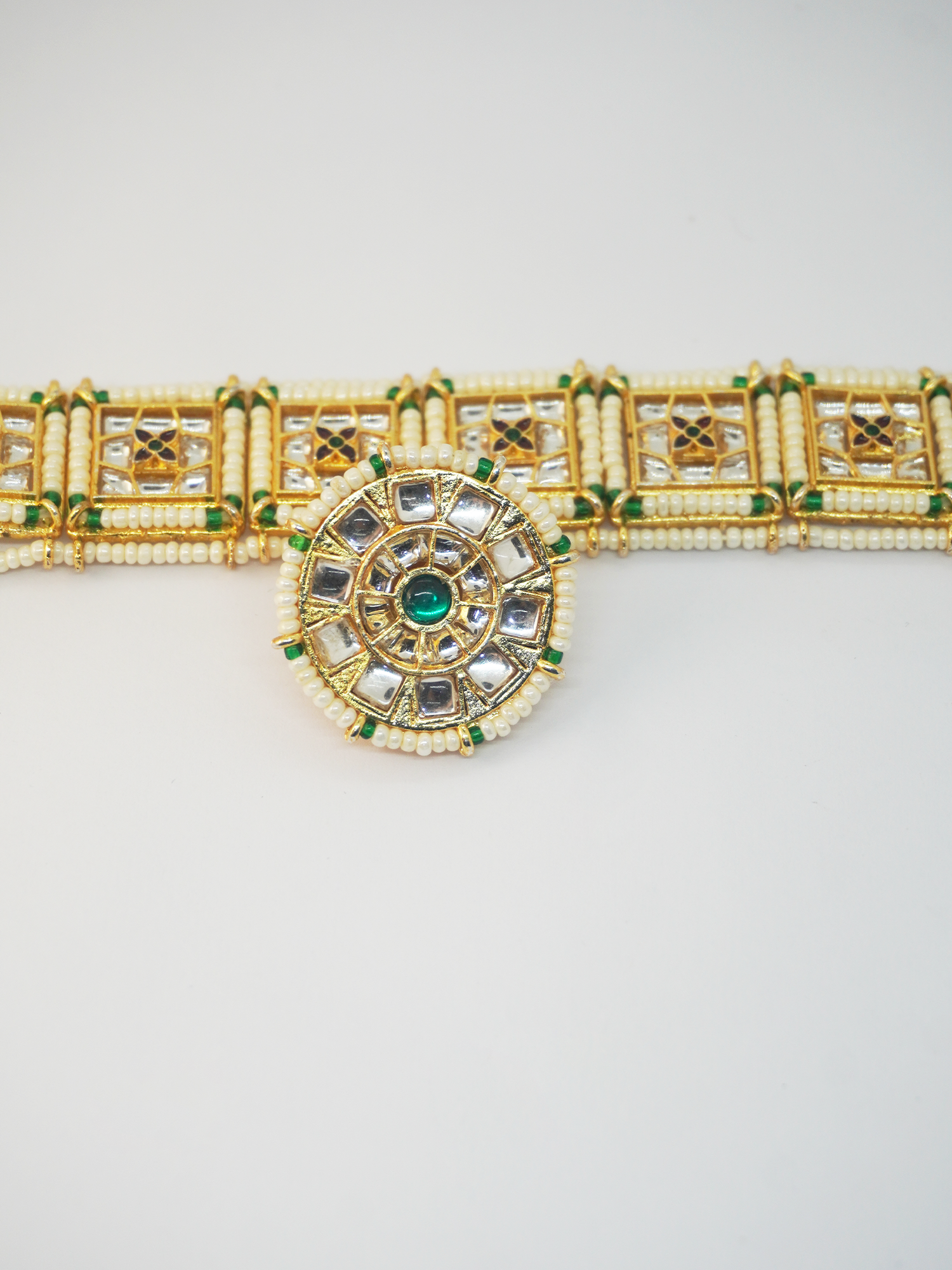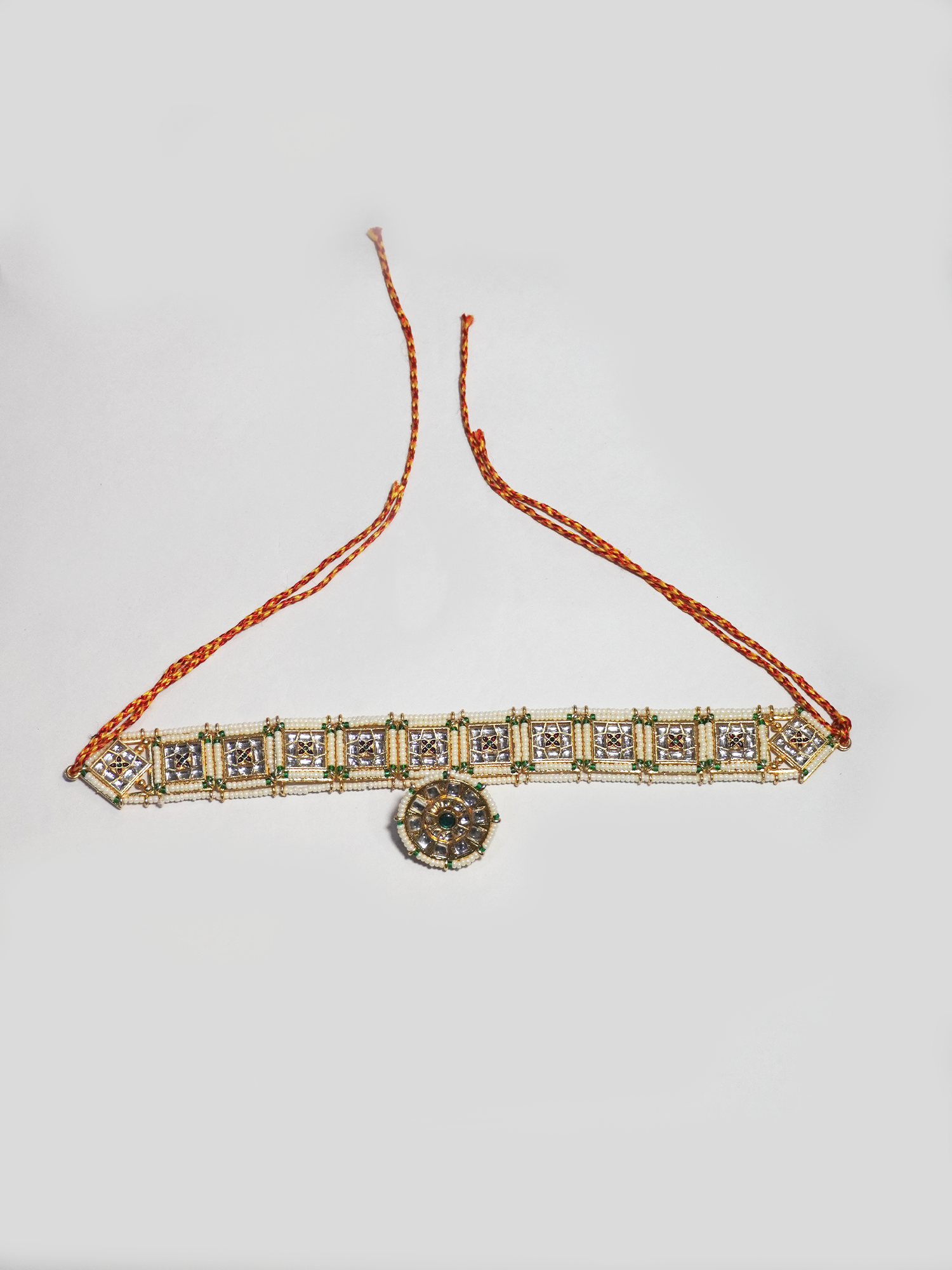 Introducing the Gold-Plated White Kundan Head Matha Patti, a traditional masterpiece crafted by hand. This headpiece features intricate gold plating adorned with white and green stones, complemented by faux pearls and beaded accents. Its traditional design is highlighted by extended threads on both sides, making it a perfect choice for adding elegance to special occasions.