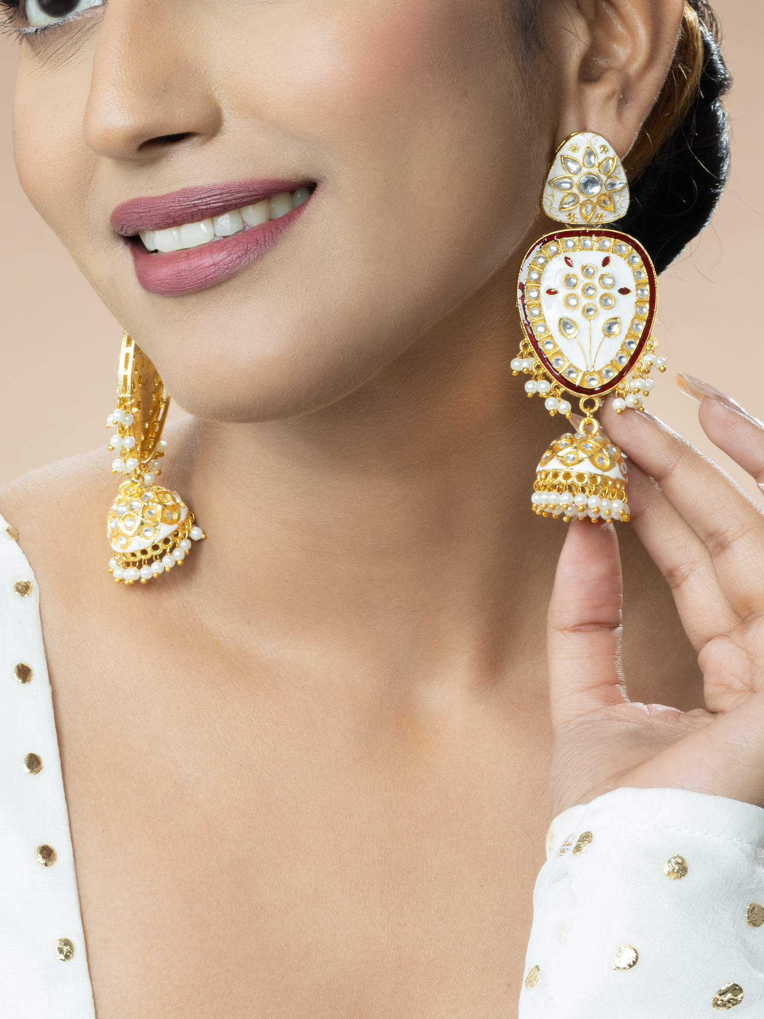 Adorn yourself with the allure of tradition in our handcrafted Meenakari Earring Set. These Gold-Plated White Meenakari Long Earrings feature a captivating floral design embellished with Kundan, offering an ethnic charm. The Jhumka, adorned with Kundan and pearls, adds a touch of opulence to these festival and function-ready earrings. Meticulously handcrafted by local artisans, this masterpiece seamlessly blends cultural richness with contemporary elegance, making it a must-have in your collection of ethnic jewelry.