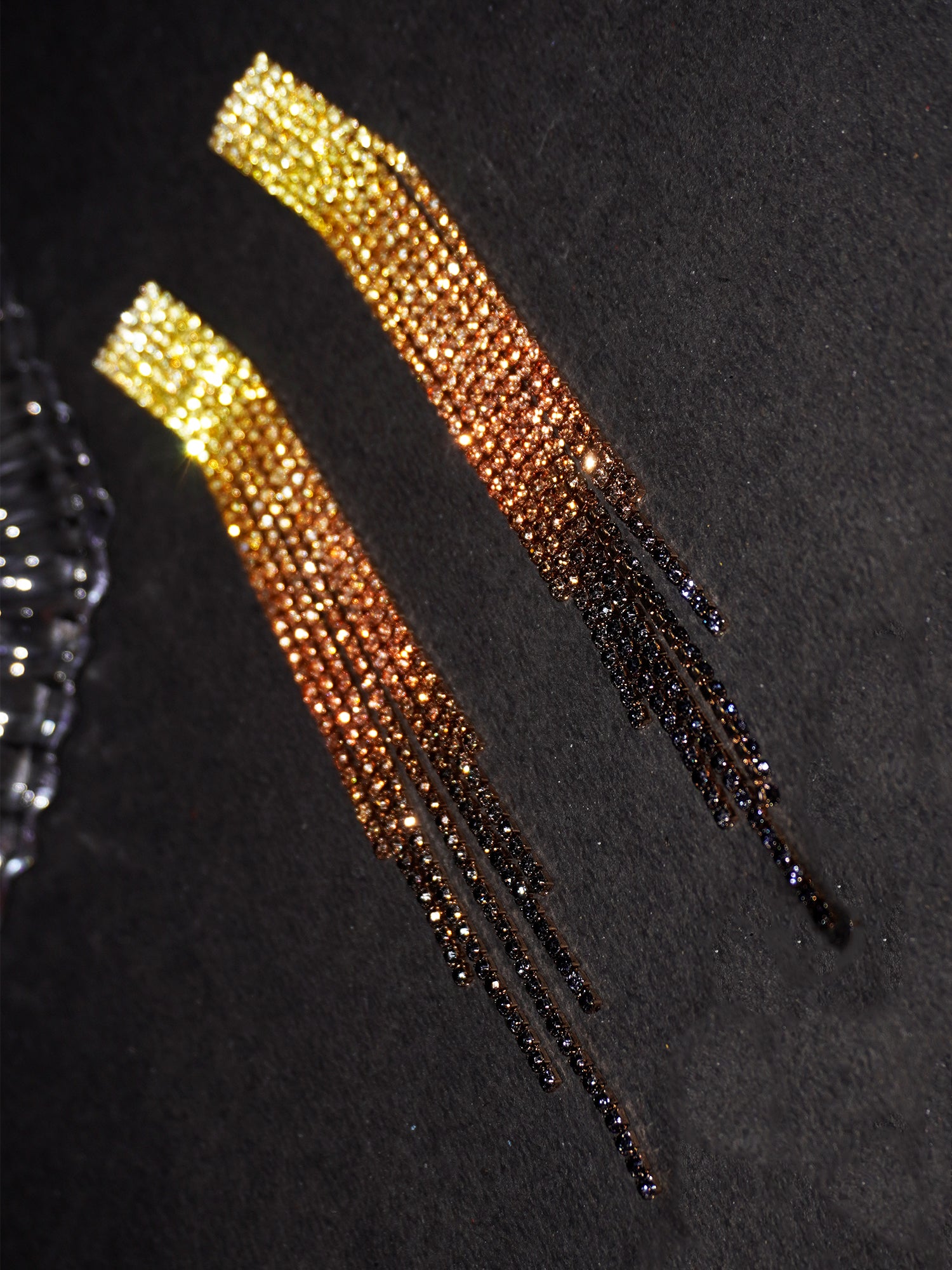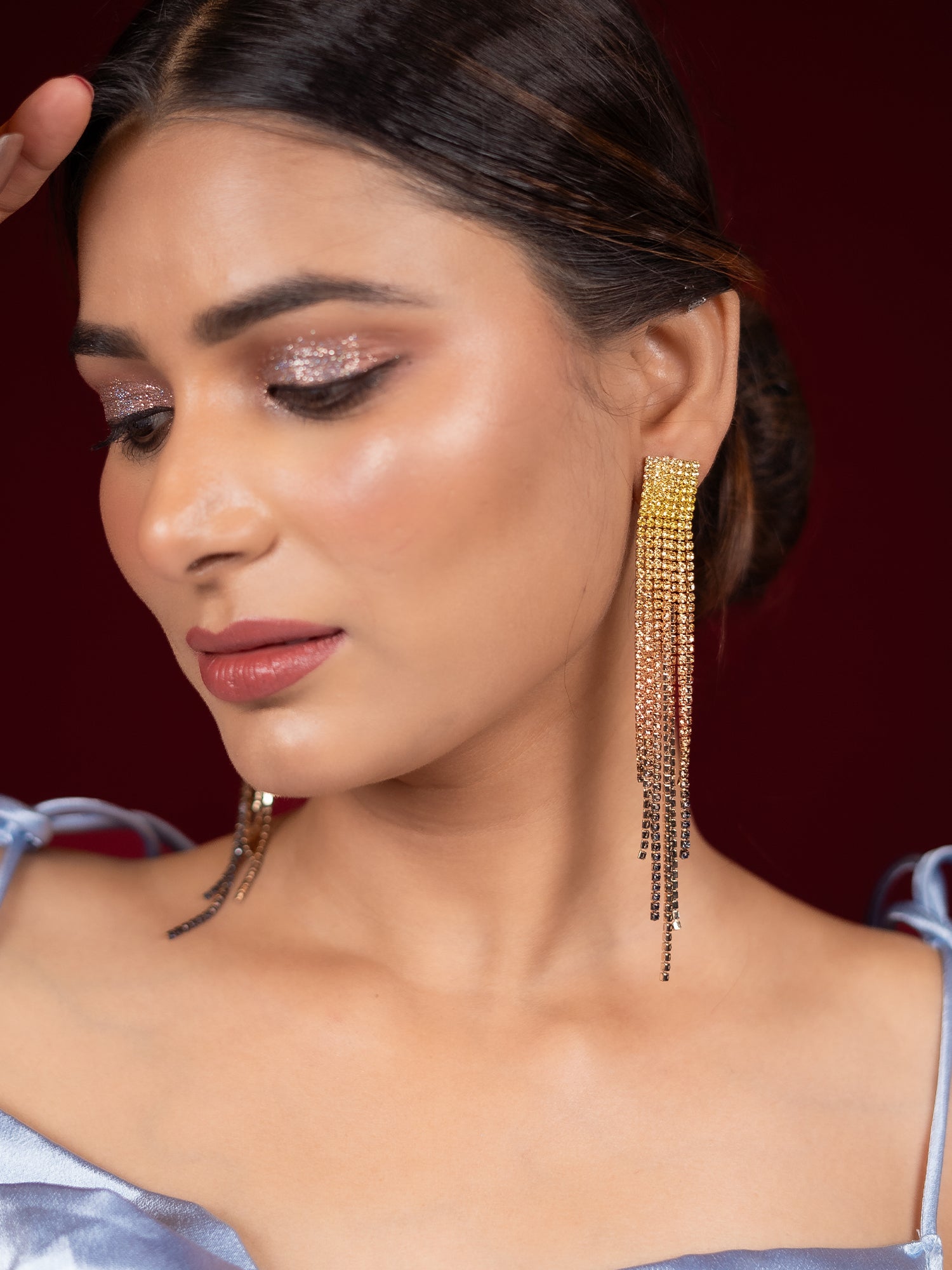 Add a touch of glamour to your look with these golden multi-color rhinestone dangler earrings, designed to sparkle with every movement. The cascading design features vibrant multi-color rhinestones, creating a dazzling play of light and color. Set in a golden finish, these earrings exude elegance and charm, making them perfect for festive occasions, parties, and evening events. Pair them with both traditional and contemporary outfits for a statement look that stands out effortlessly.