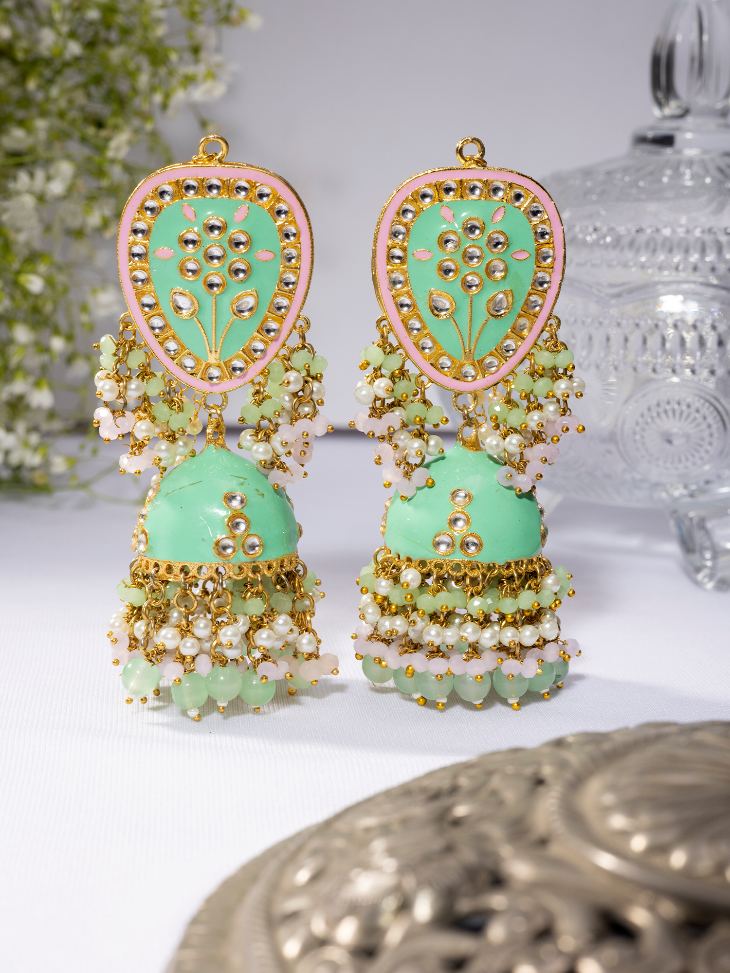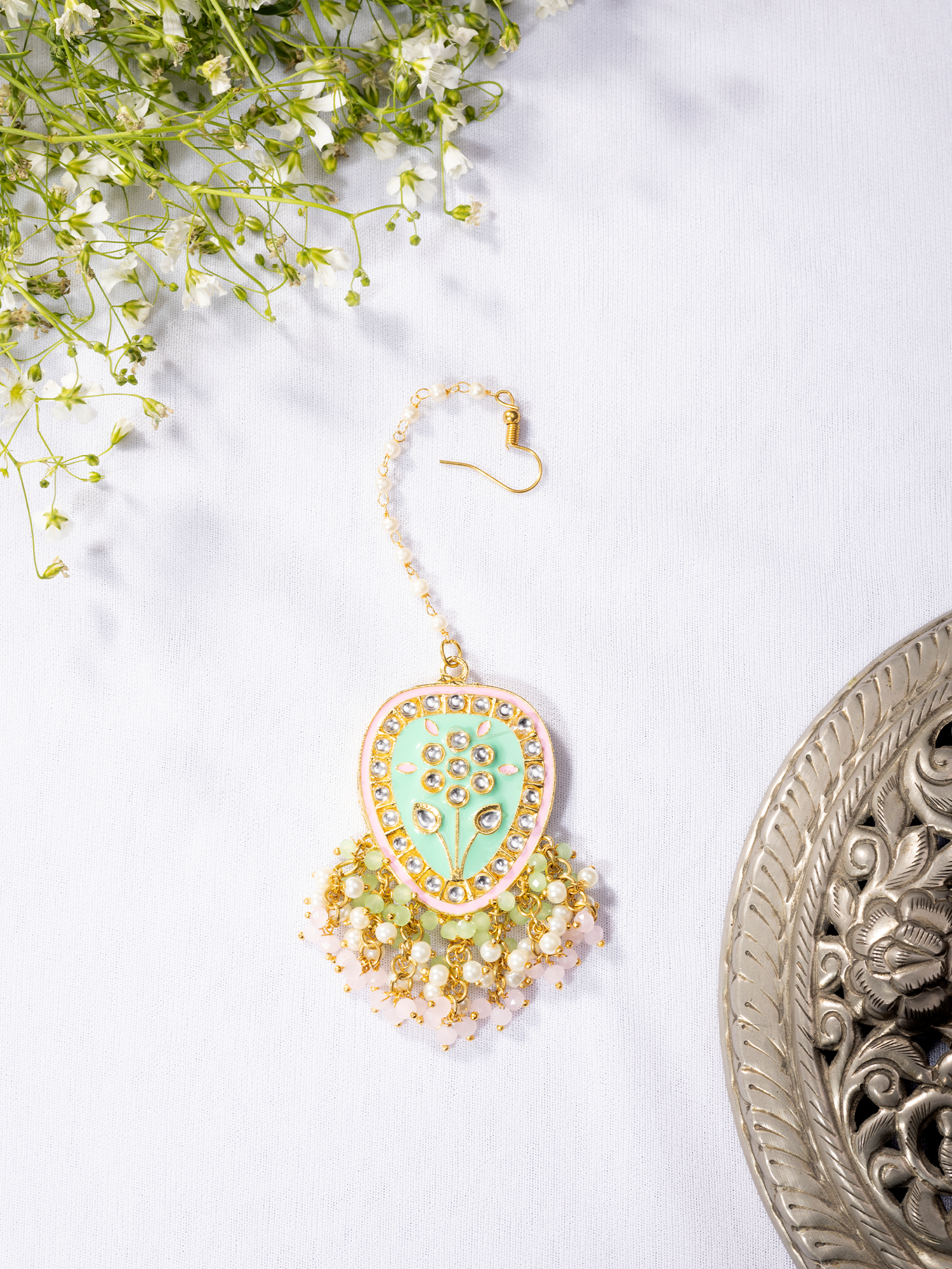 Pair this exquisite Traditional Green Floral Meenakari Jhumka and Maang-Teeka Set with a vibrant silk saree or lehenga for a stunning ethnic look. Opt for a sleek bun hairstyle to showcase the intricate detailing of the maang teeka. Complete your ensemble with minimal makeup and traditional accessories for a perfect balance.