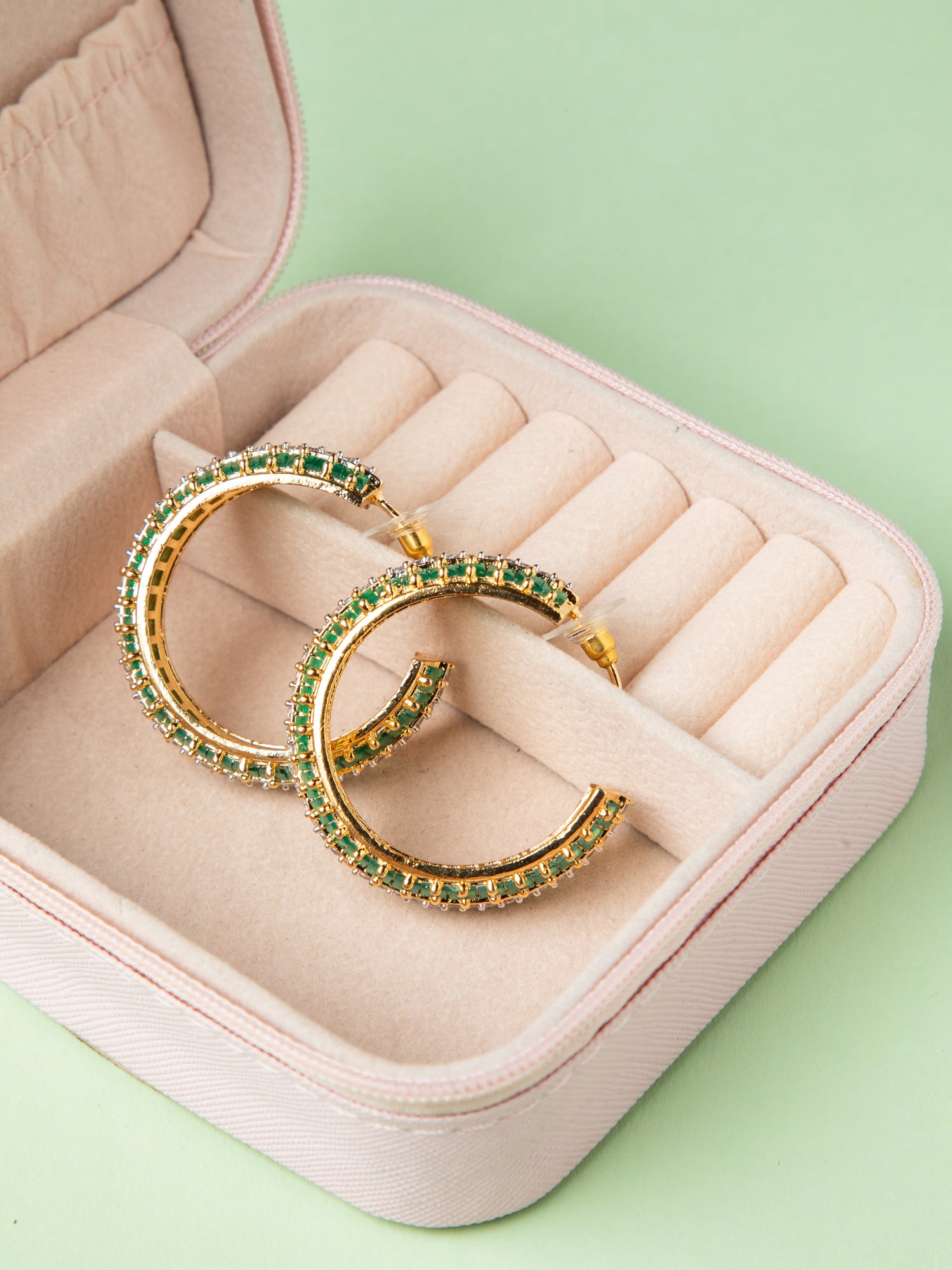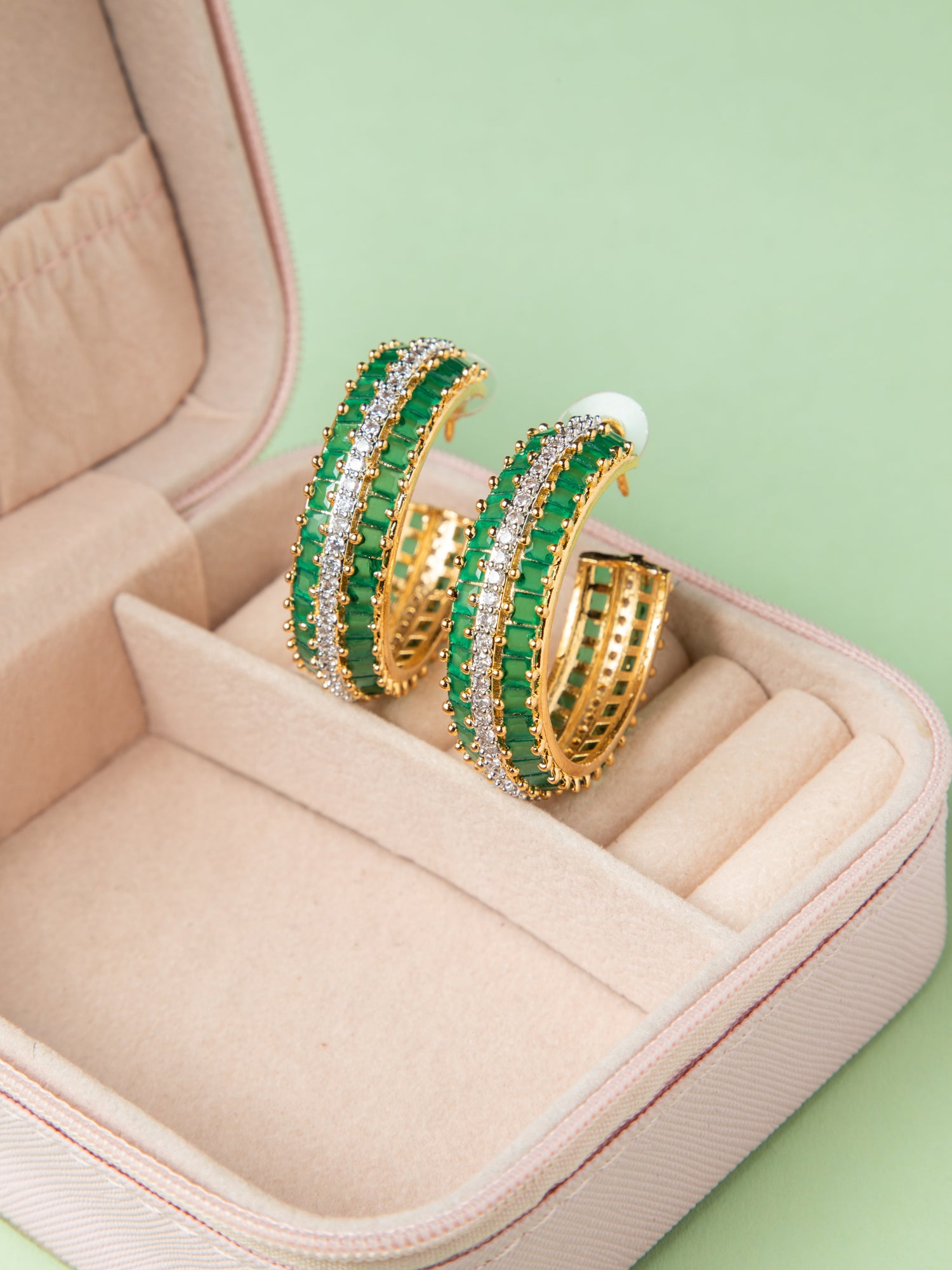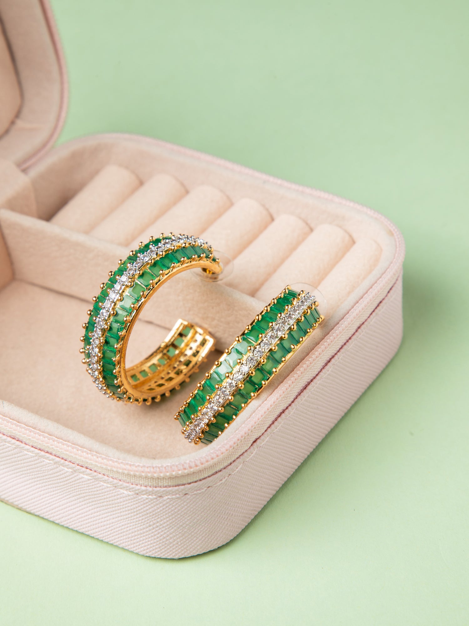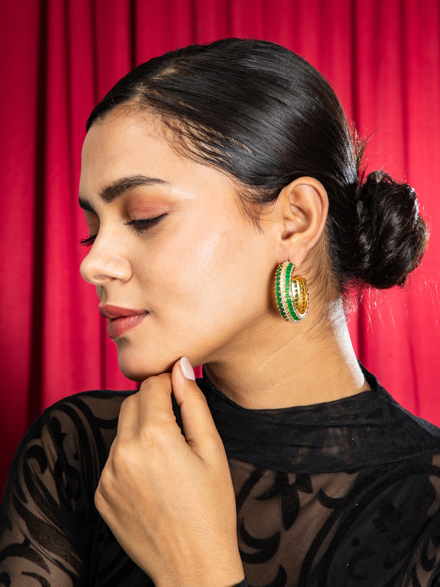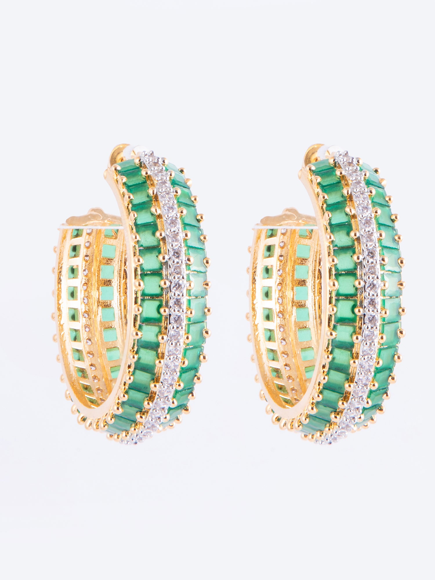 Make a bold statement with these 24K gold plated big round earrings, adorned with green stones and sparkling white AD stones. A dazzling pick from the latest collection for festive occasions.