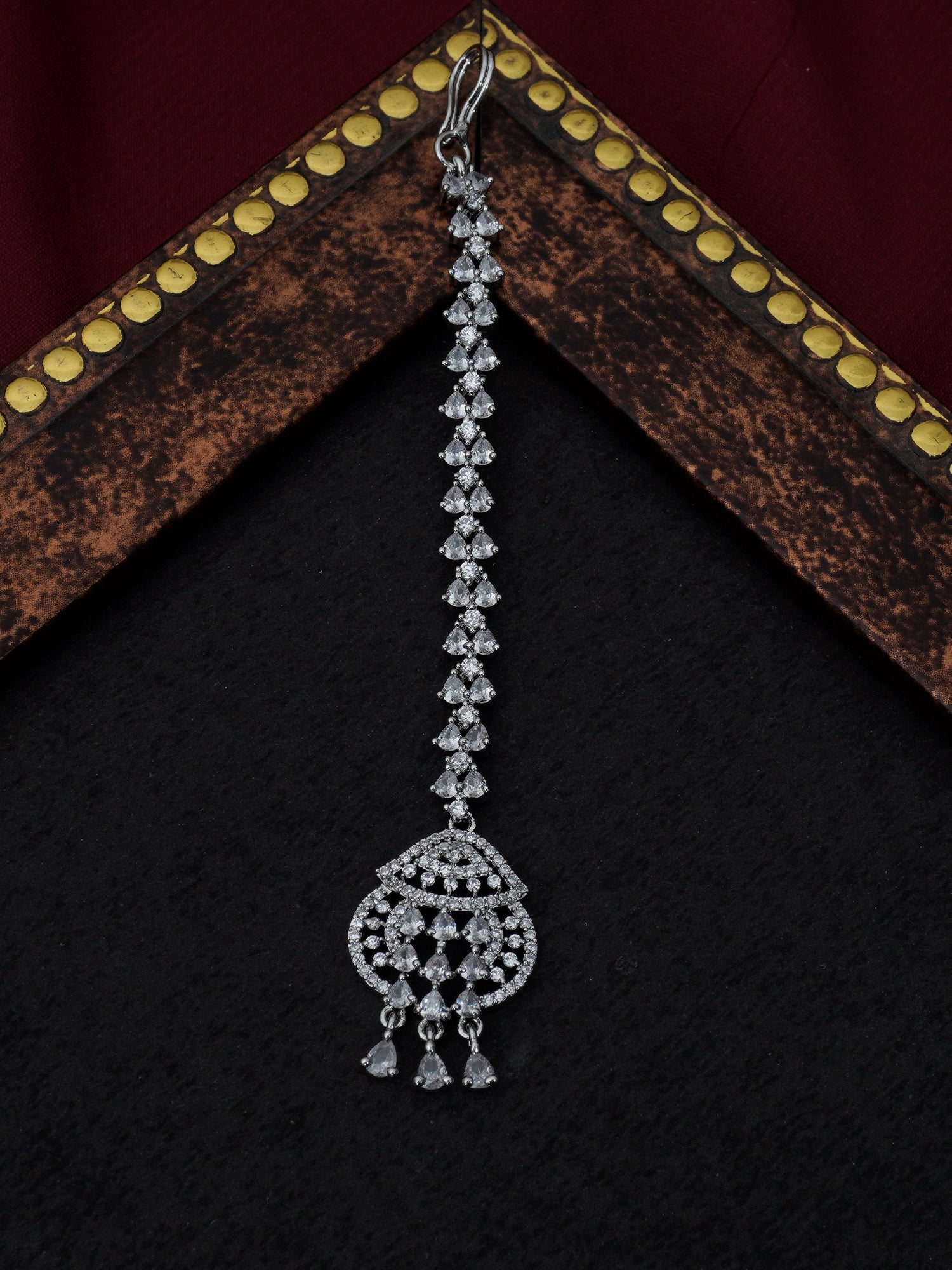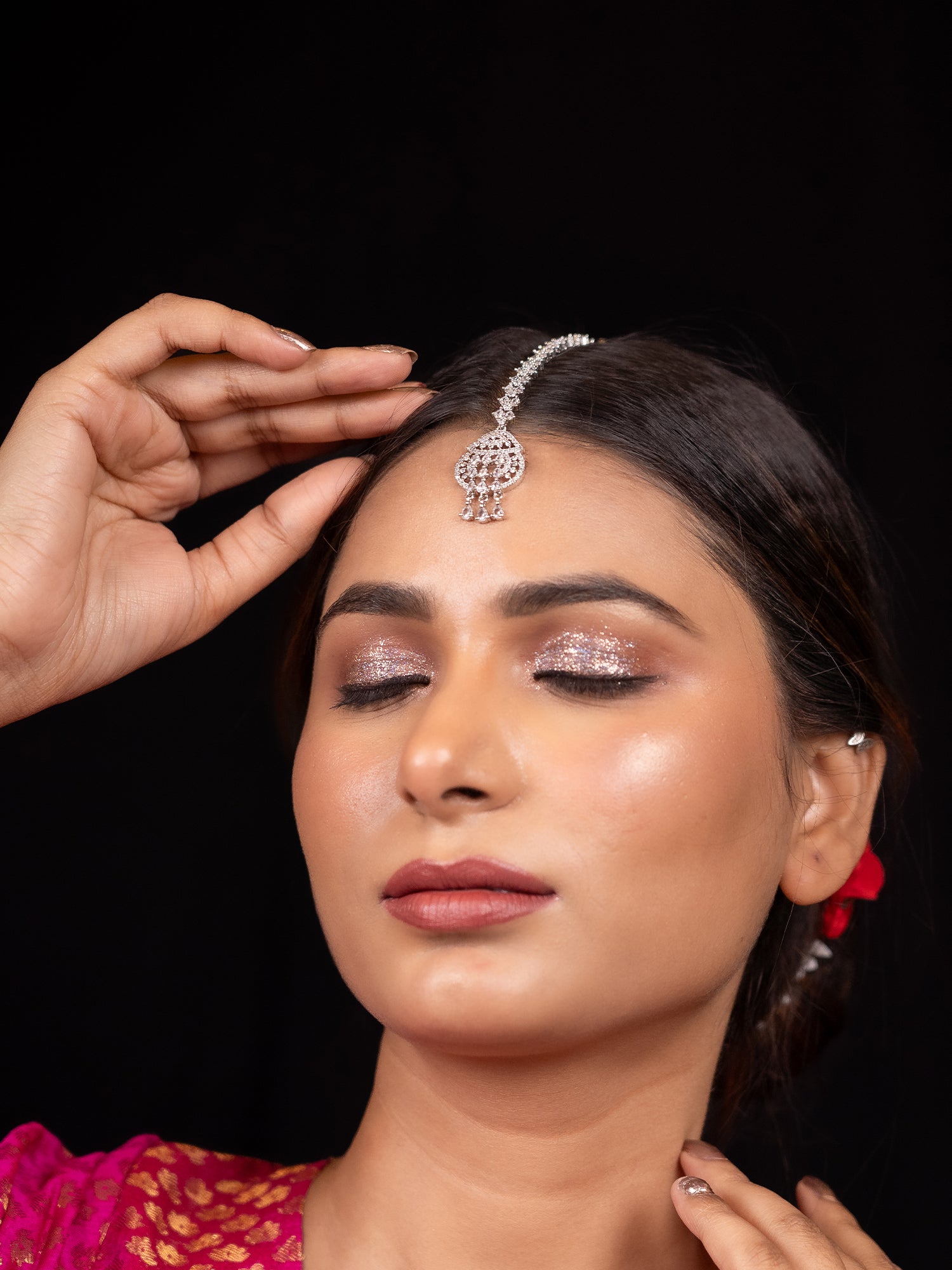 Pair this luxury American diamond mangtikka with a traditional bridal lehenga or saree to complete your regal look. For an elegant touch, style your hair in a sleek bun or high ponytail to allow the mangtikka to take center stage. Complement with delicate earrings and minimal makeup to highlight the intricate design.