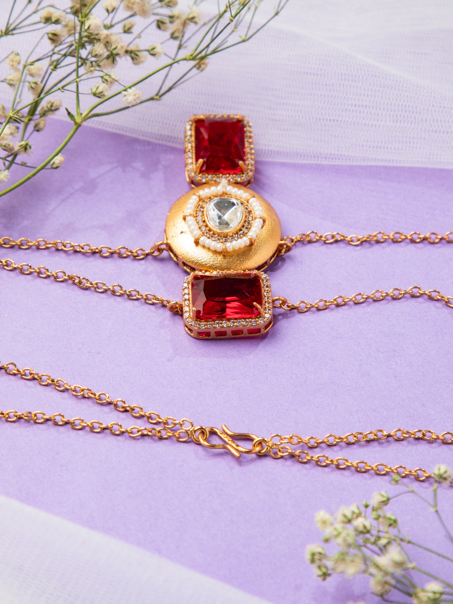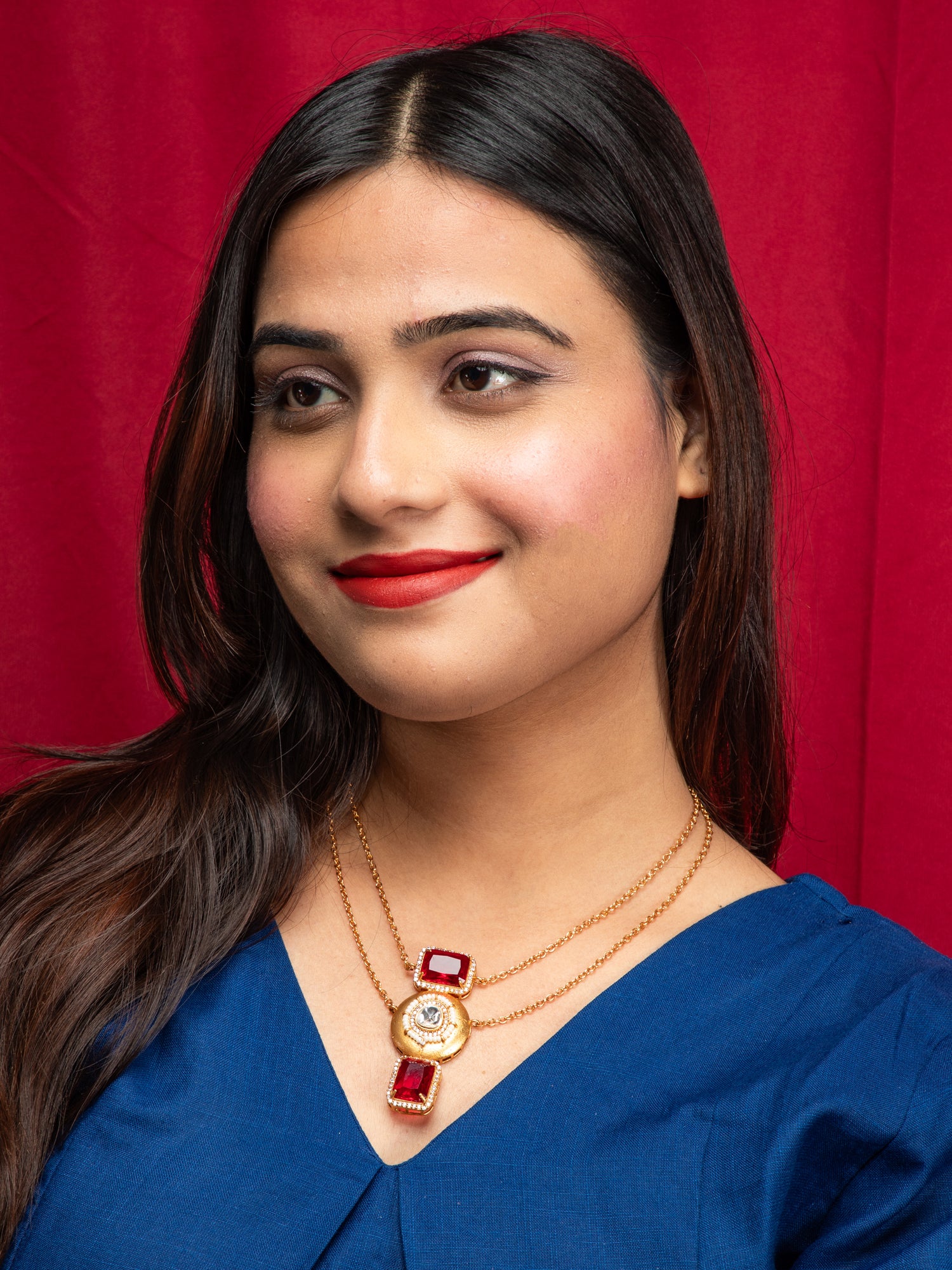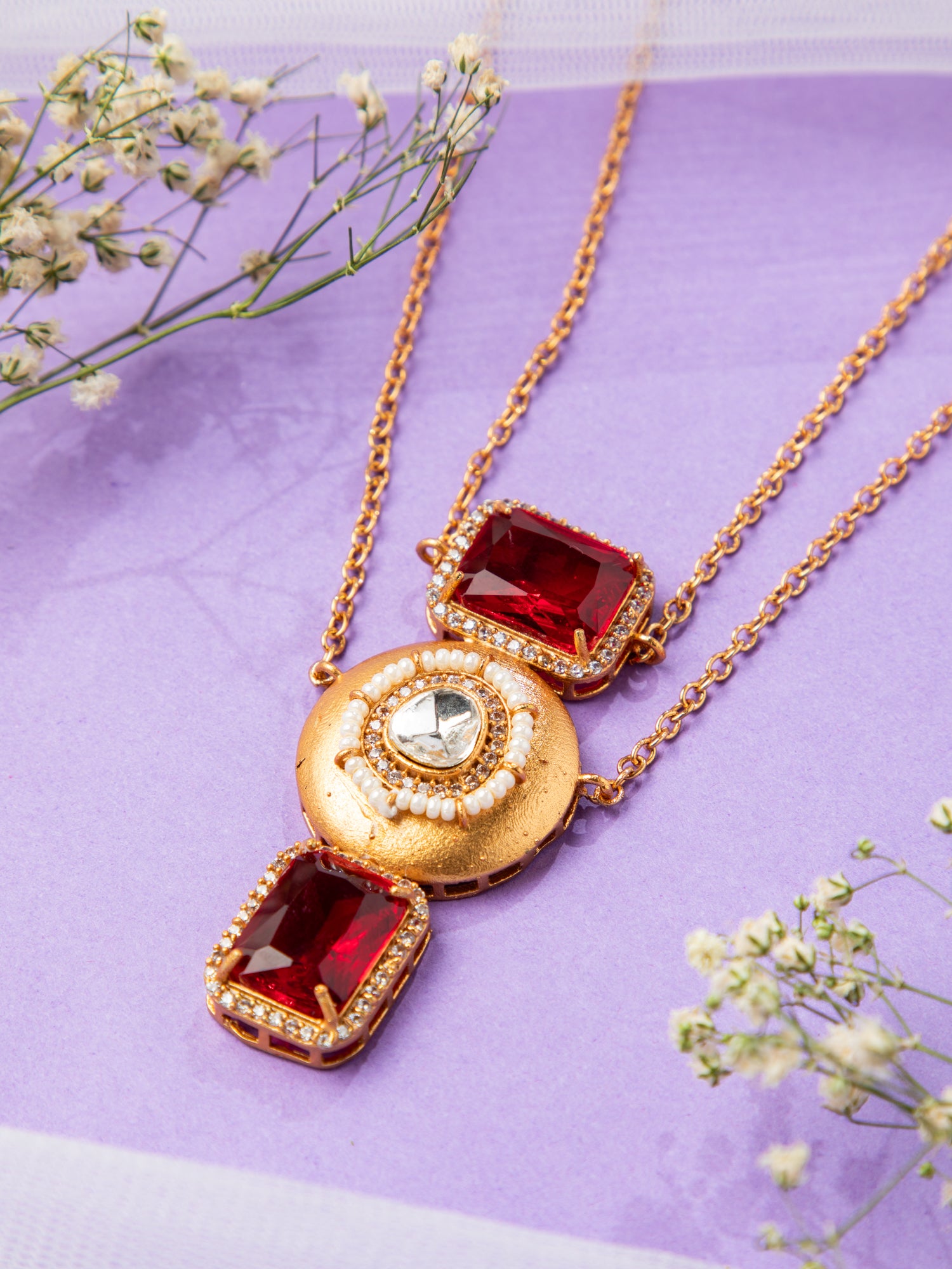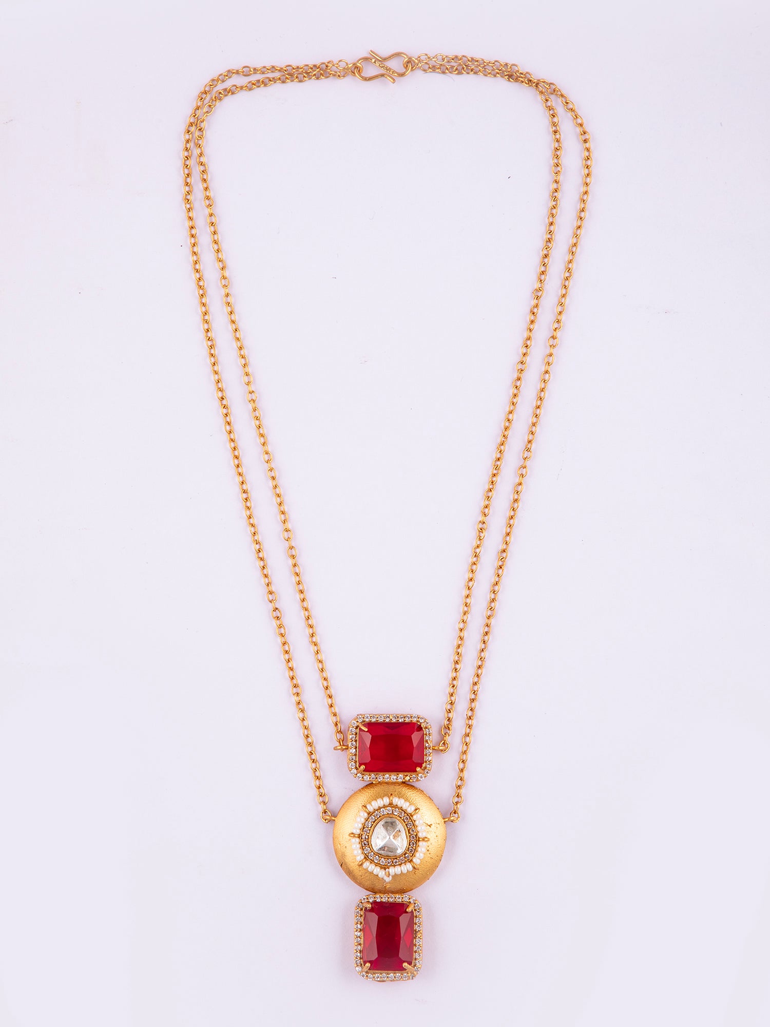 Double-layered Matte Finish Gold Plated Necklace featuring a long pendant with ruby red and white Kundan stones, surrounded by sparkling white CZ stones. Its mesmerizing and unique design makes it ideal for ethnic and festive wear, adding timeless elegance.