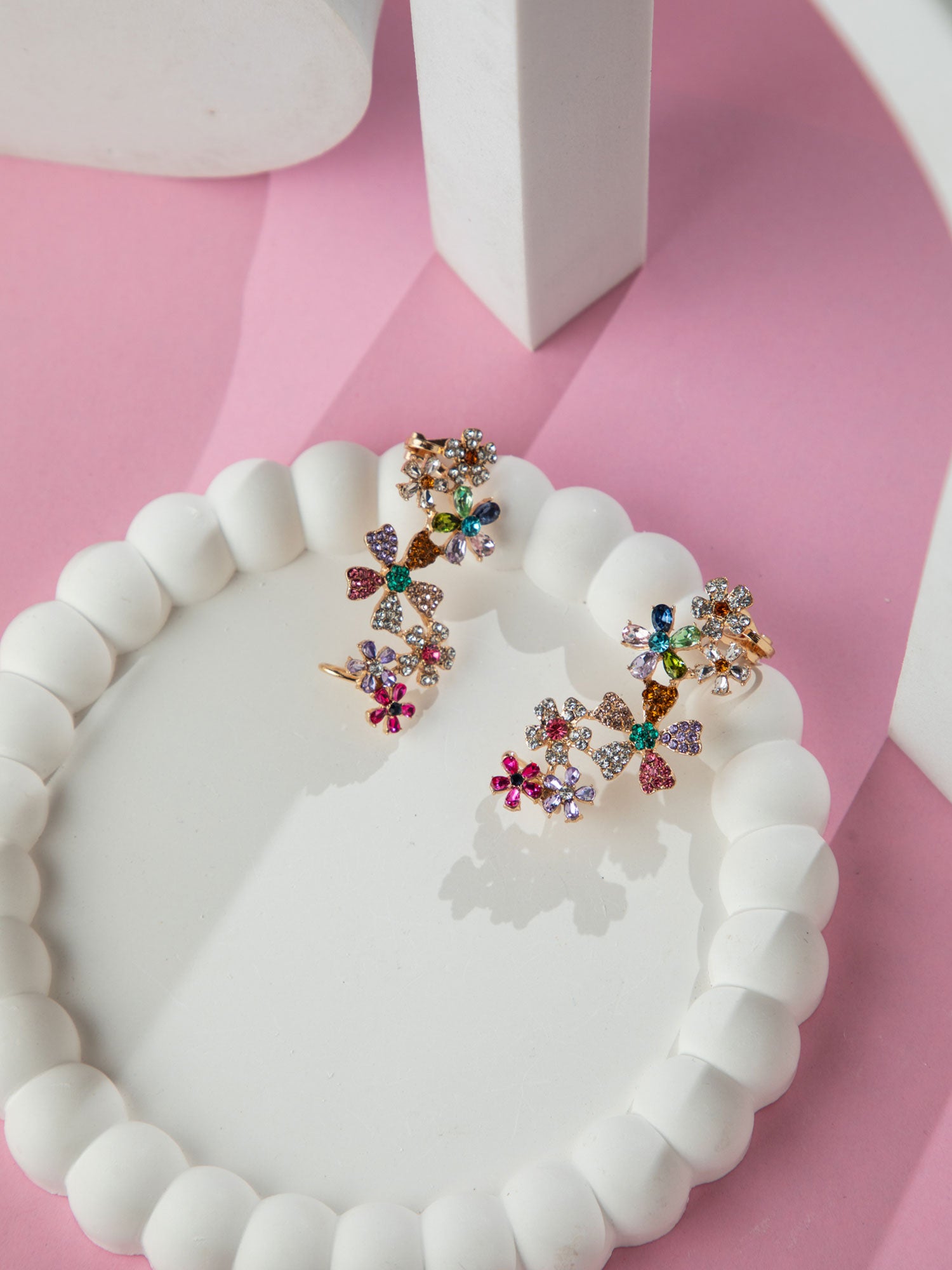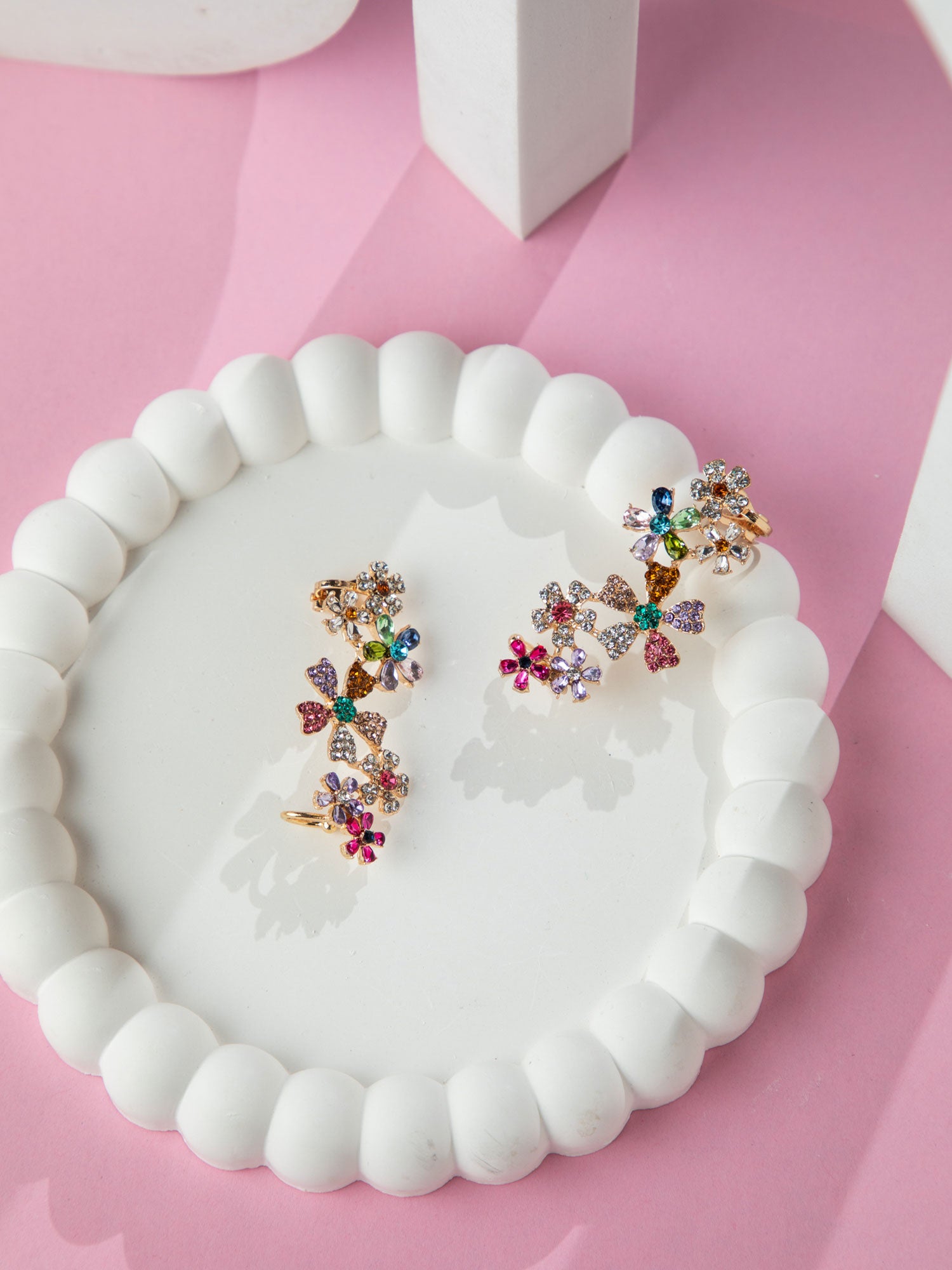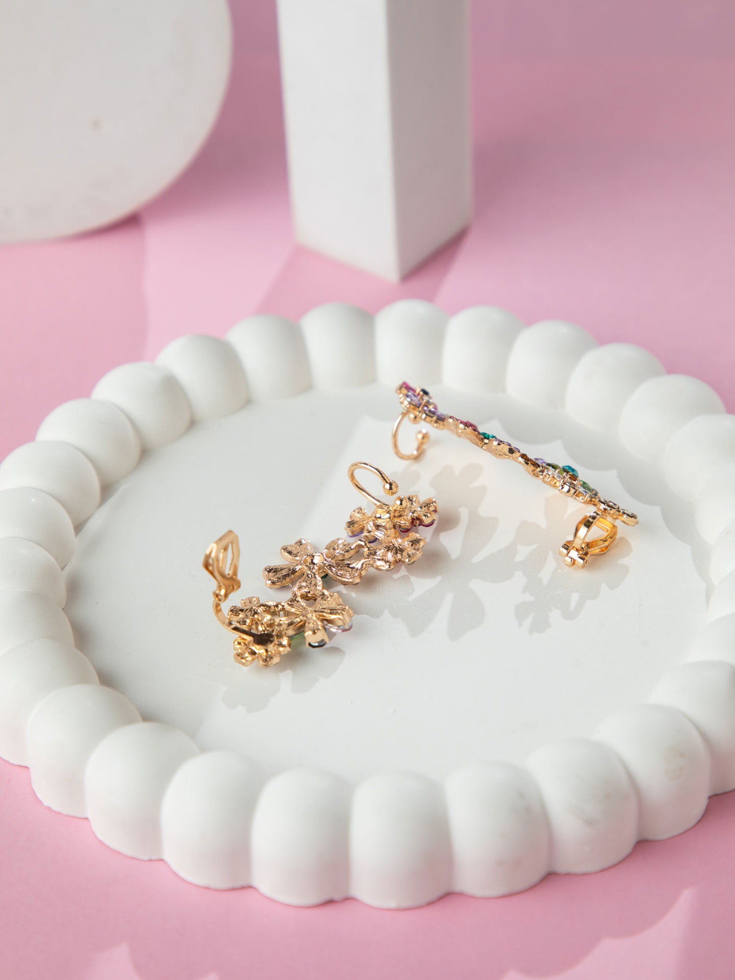 Matte Gold Plated Floral Design Earcuff Earrings with Multicolor Stones