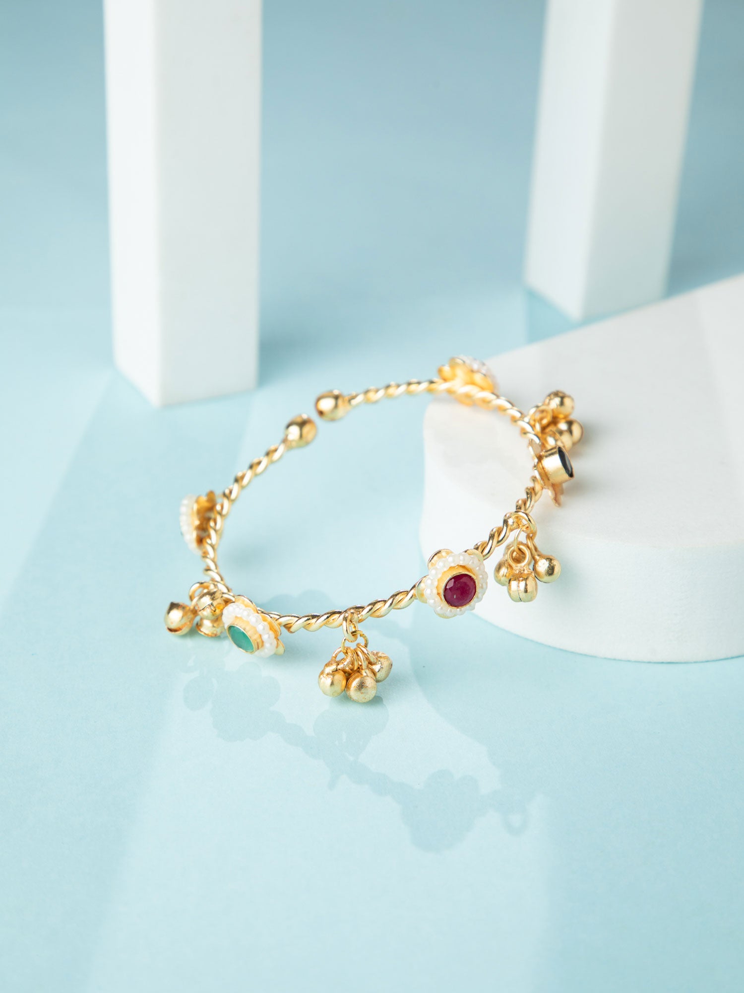 Matte Gold Plated Floral Kada Bangle with Multicolor Stones and Ghungroos