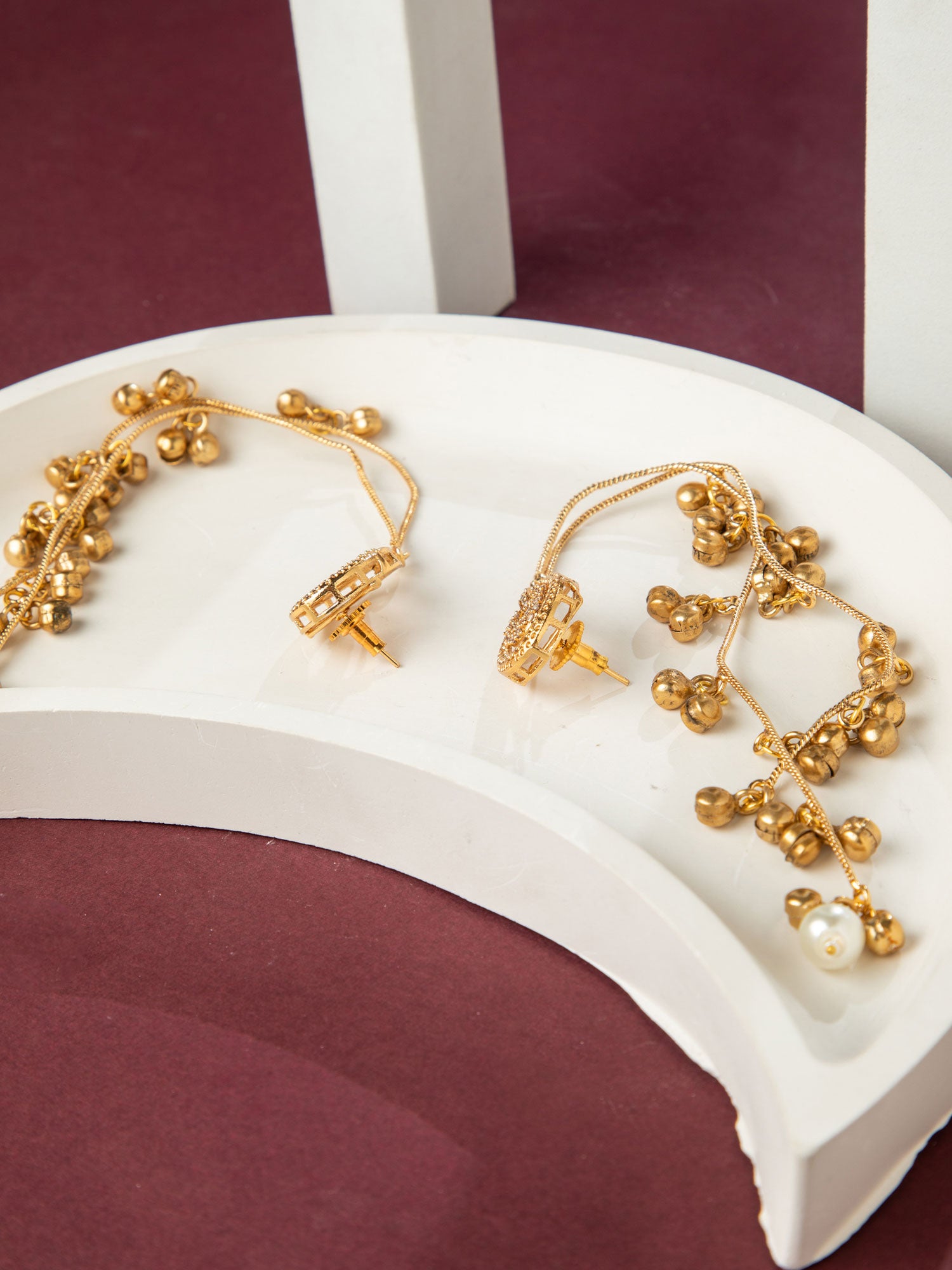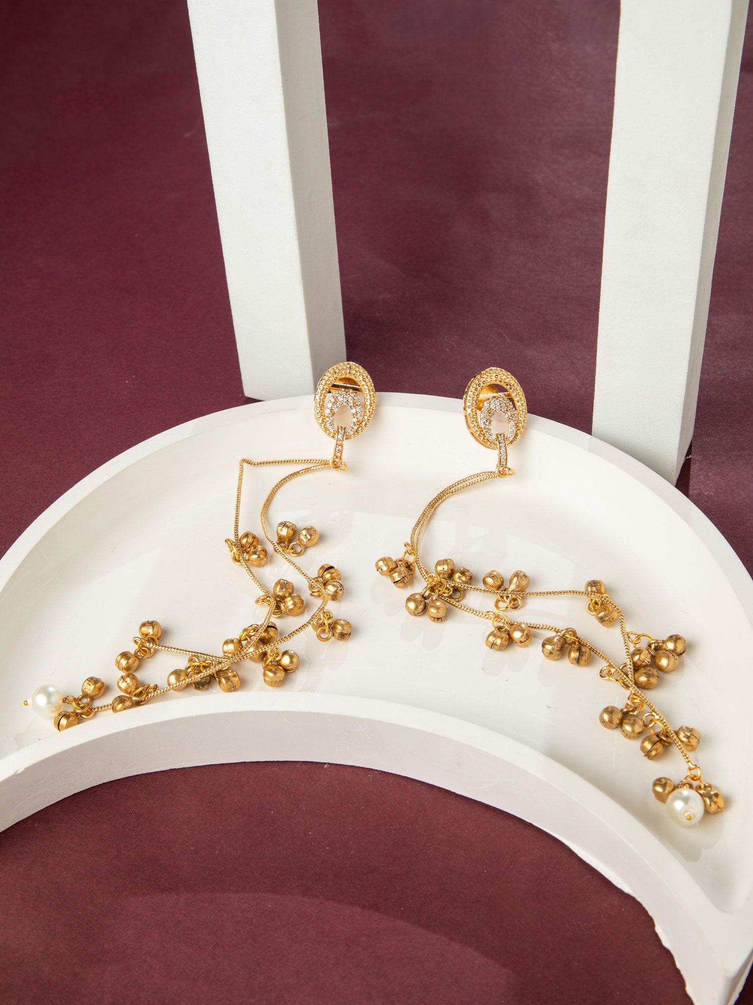 Matte Gold Plated Kashmiri Long Earrings with Ghunghroo and White AD Stones