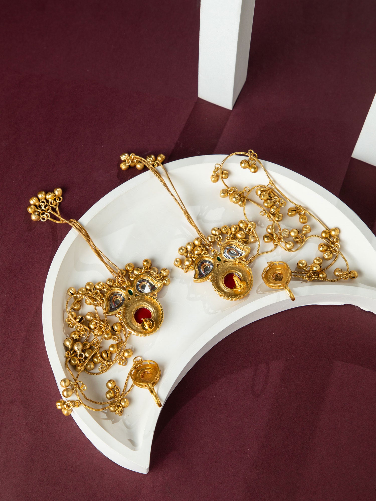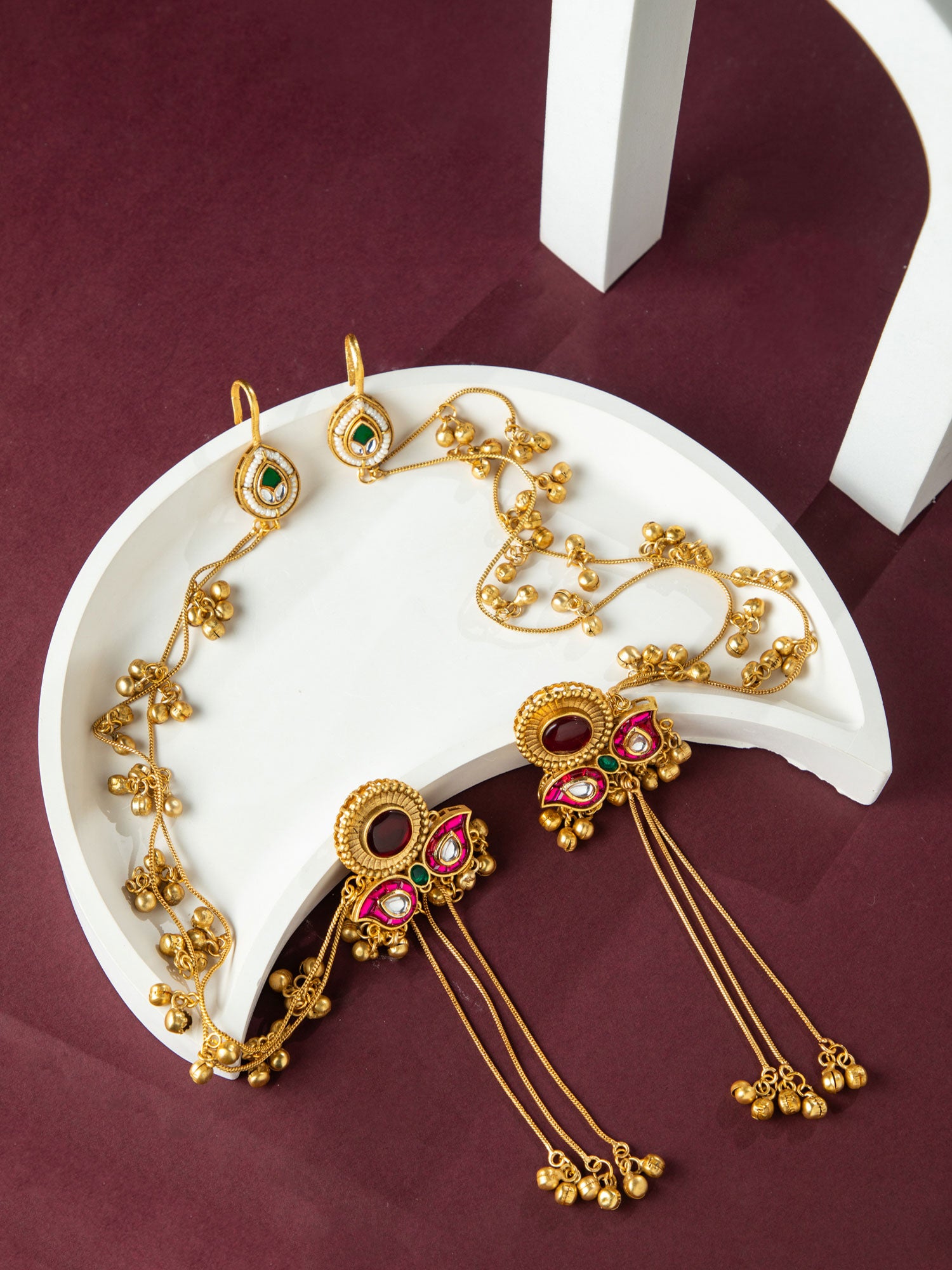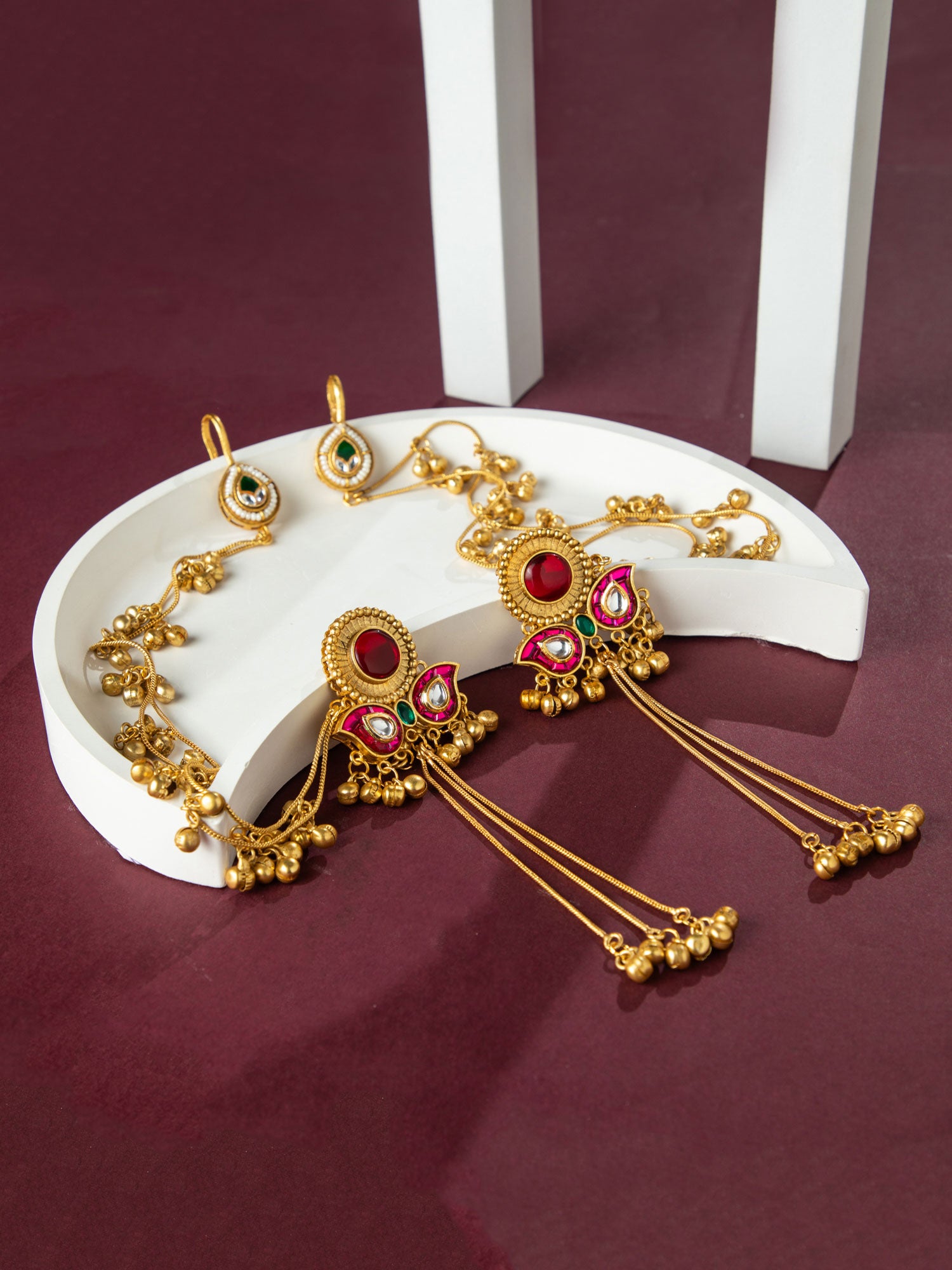 Matte Gold Plated Kundan and Ruby Kashmiri Earrings with Ear Chain
