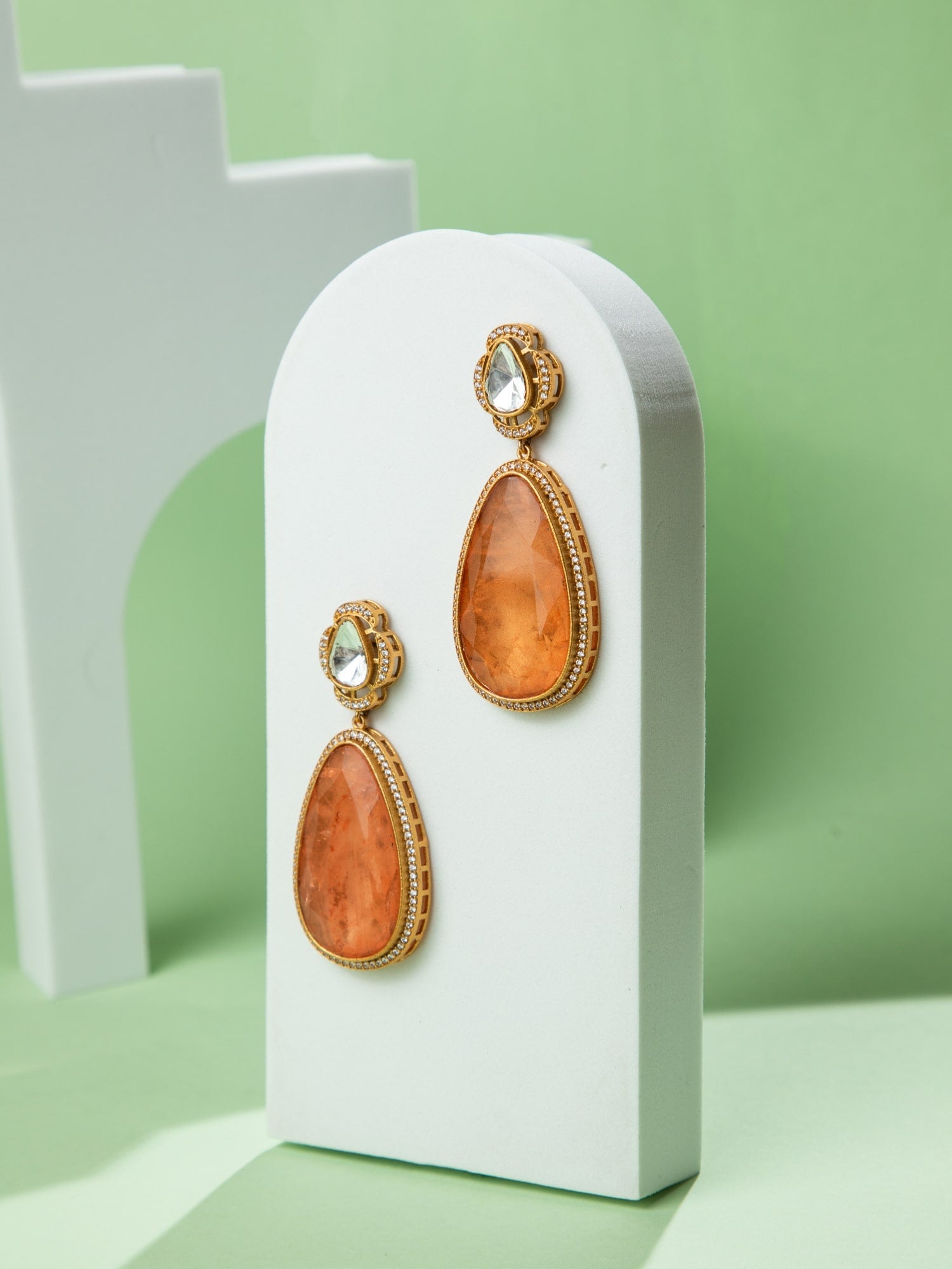 Matte Gold Plated Long Earrings with Orange Onyx, White CZ and Kundan Stones