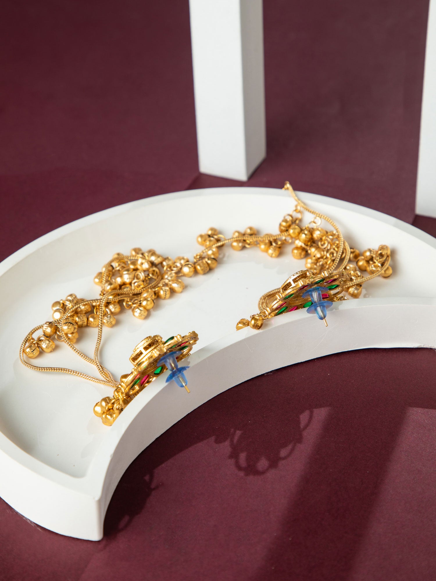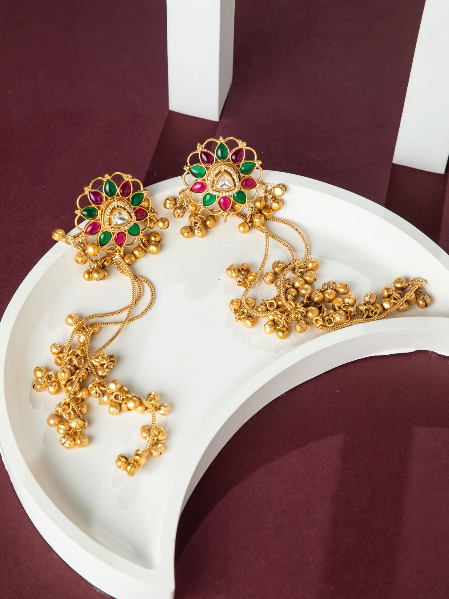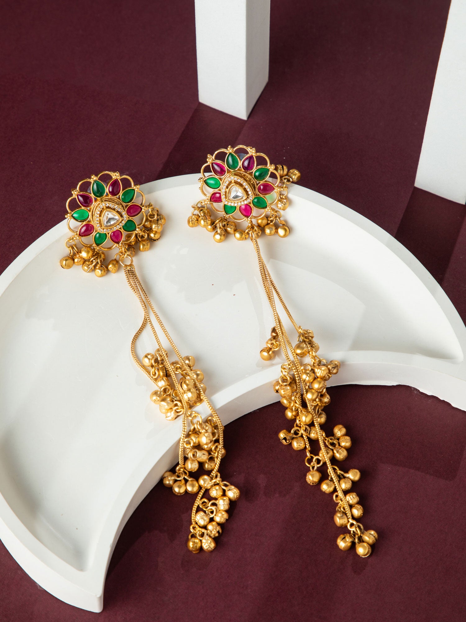Matte Gold Plated Long Kashmiri Floral Earrings