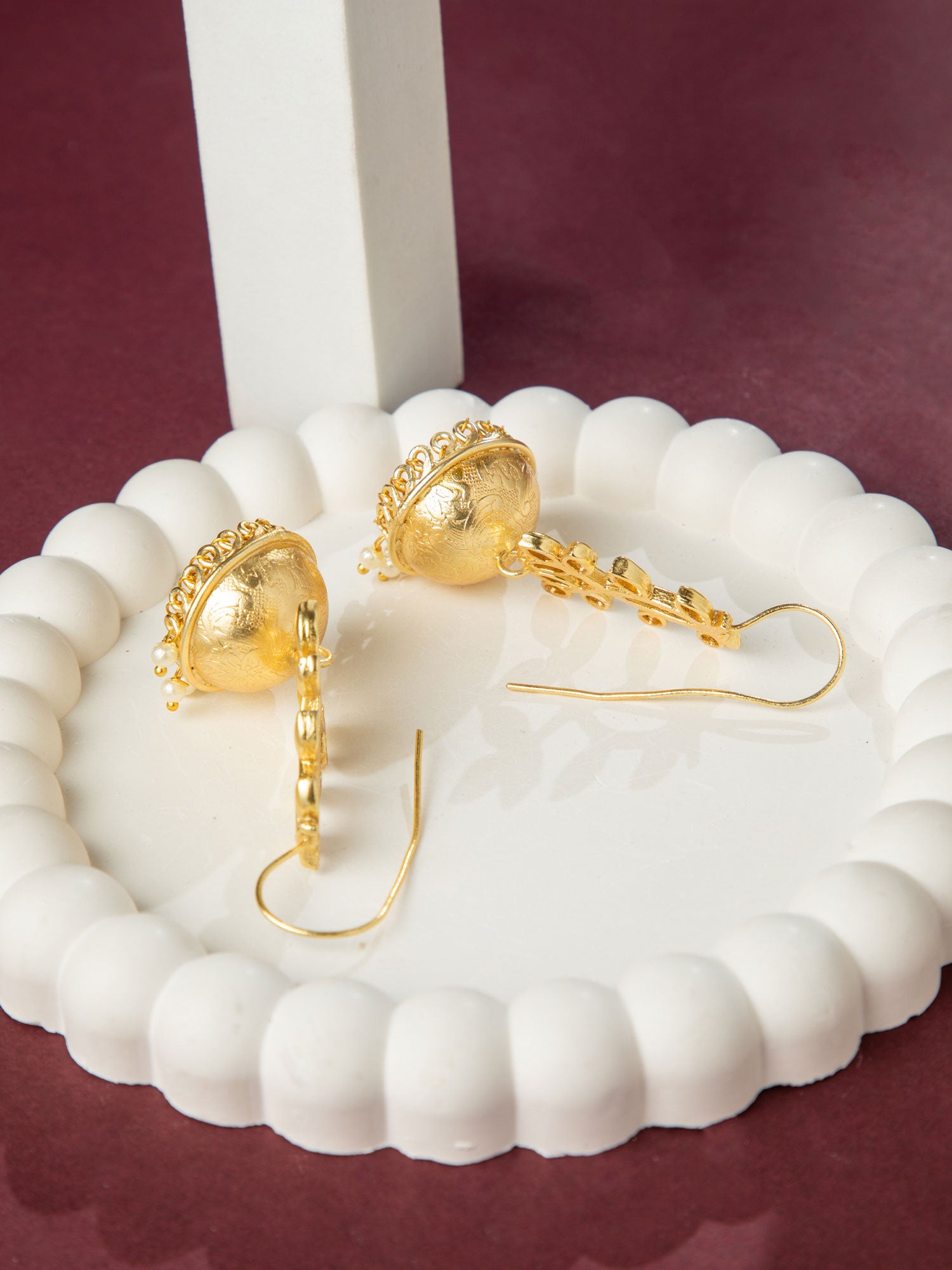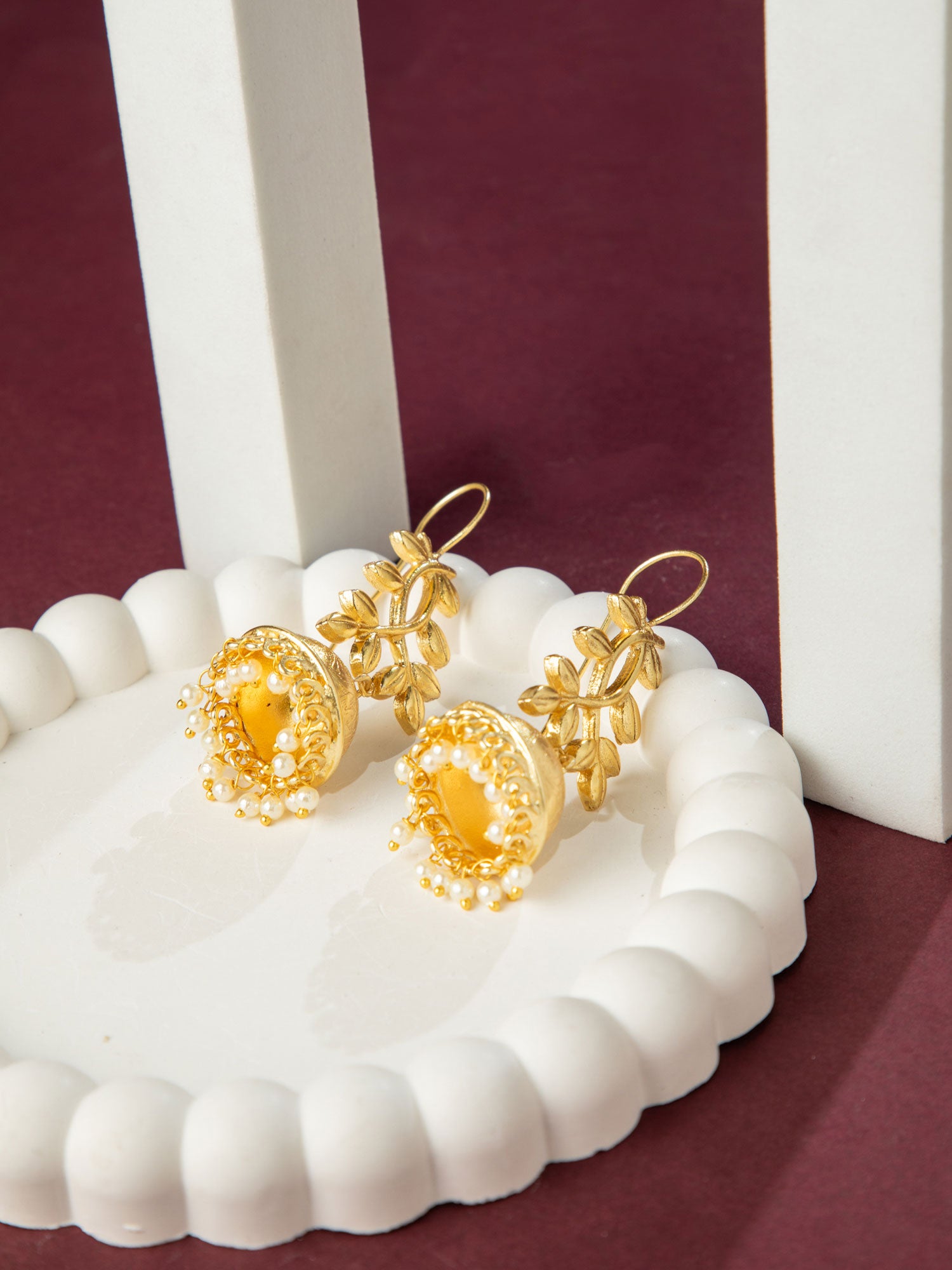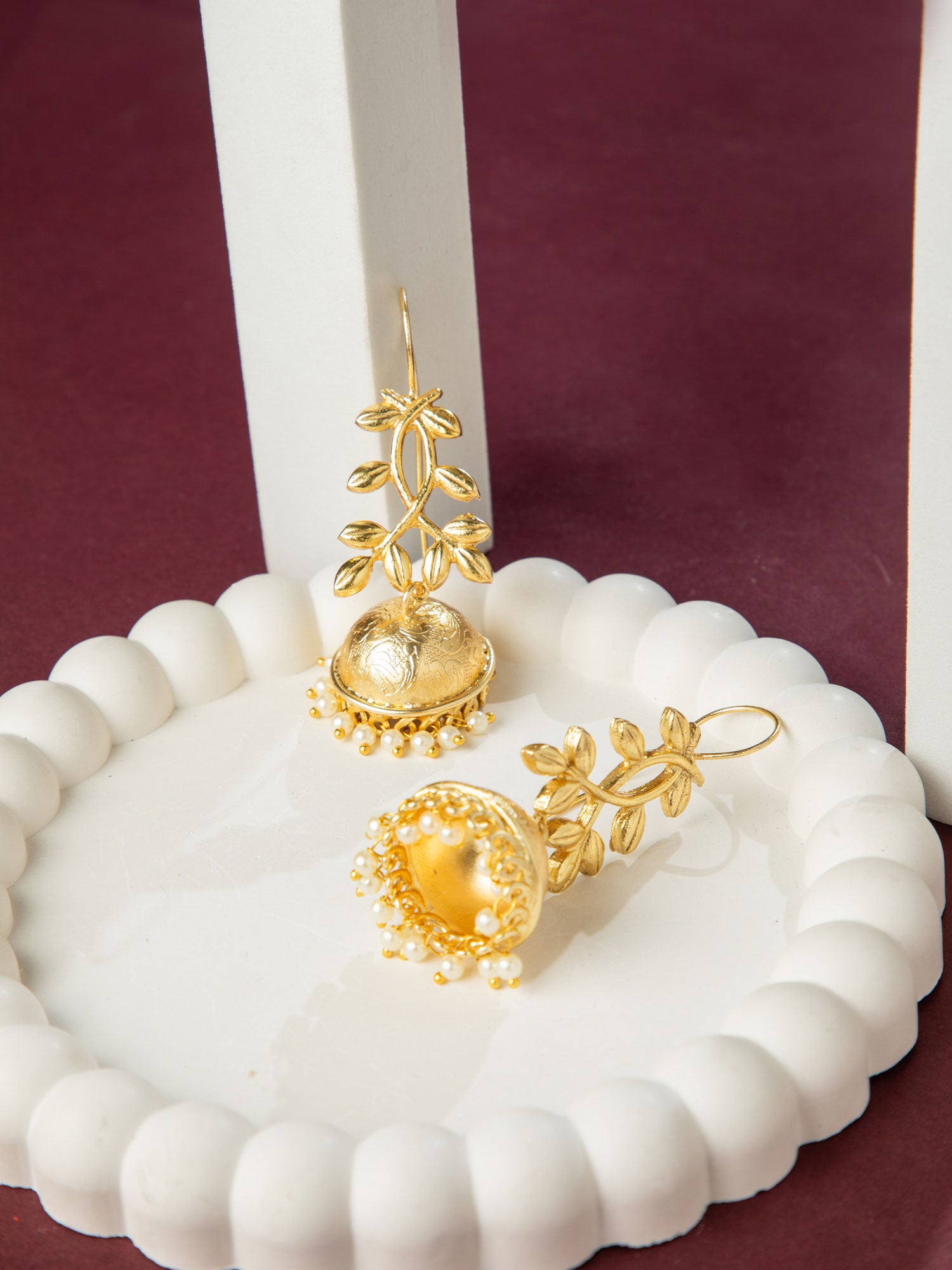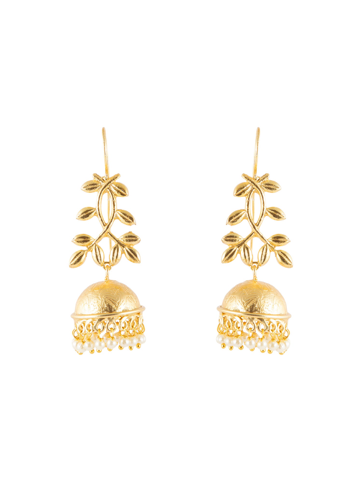 Matte Gold Plated Long Petal Jhumka with White Pearls