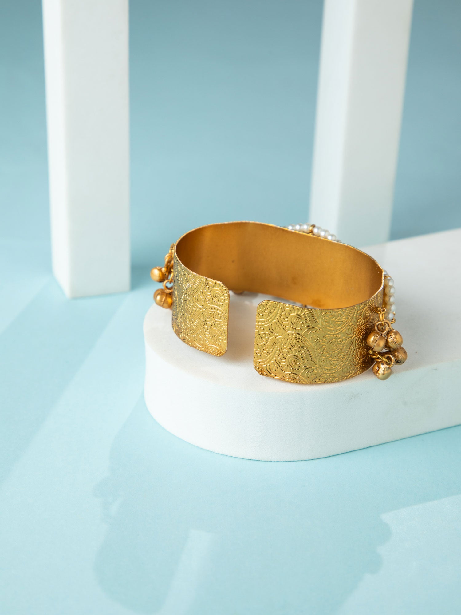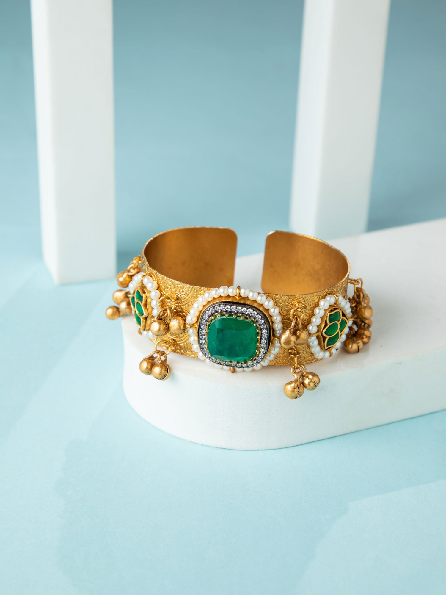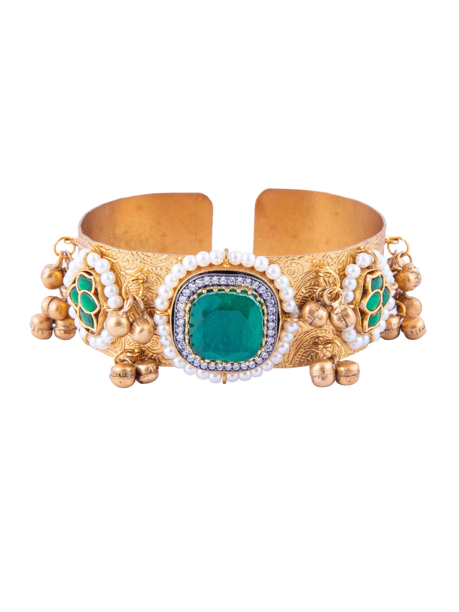 Matte Gold Plated Lotus Kada Bracelet with Green and White CZ Stones