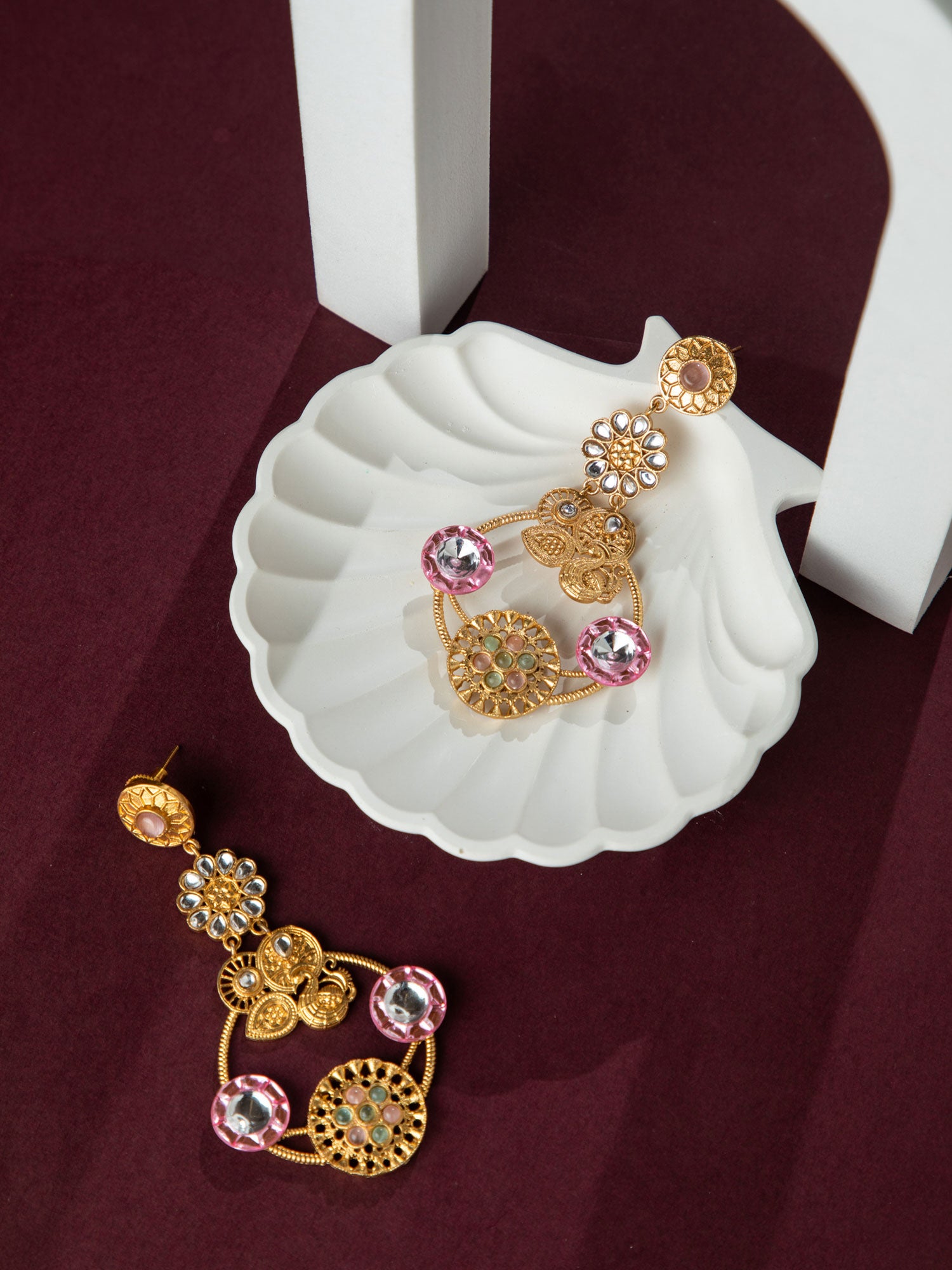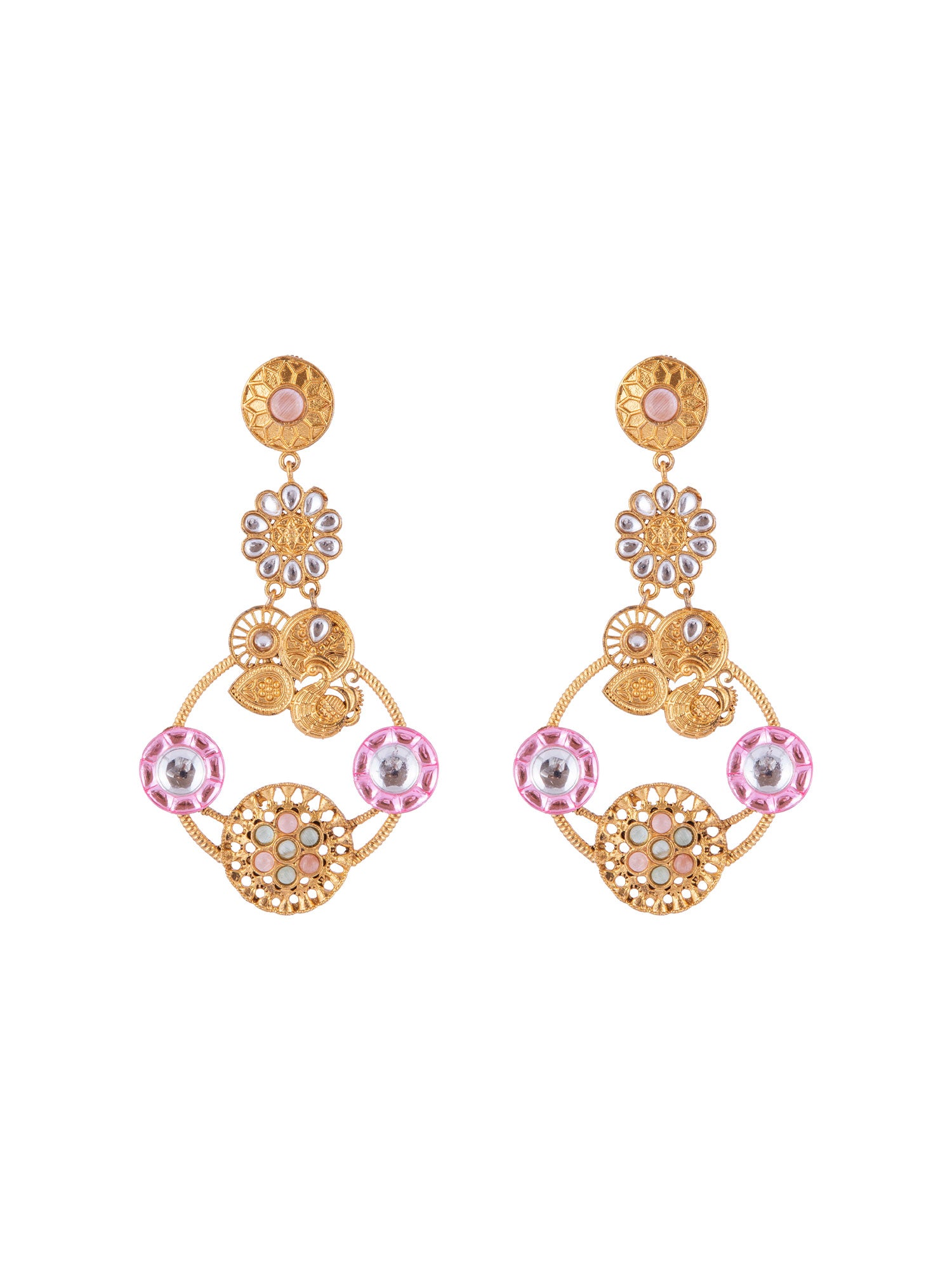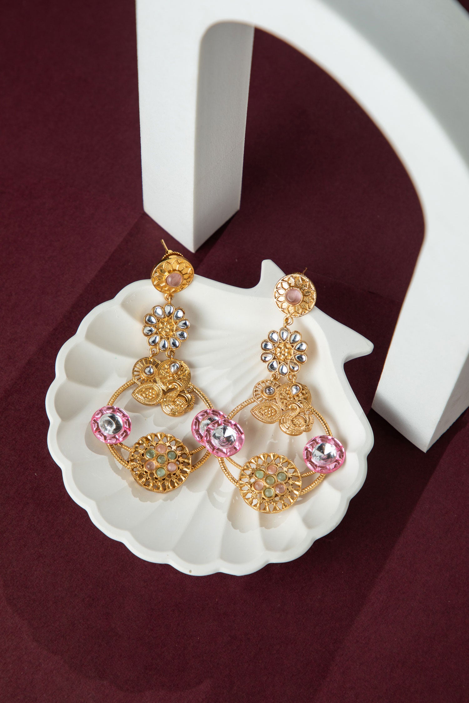 Matte Gold Plated Peacock Earrings with White Kundan and Pink Stones