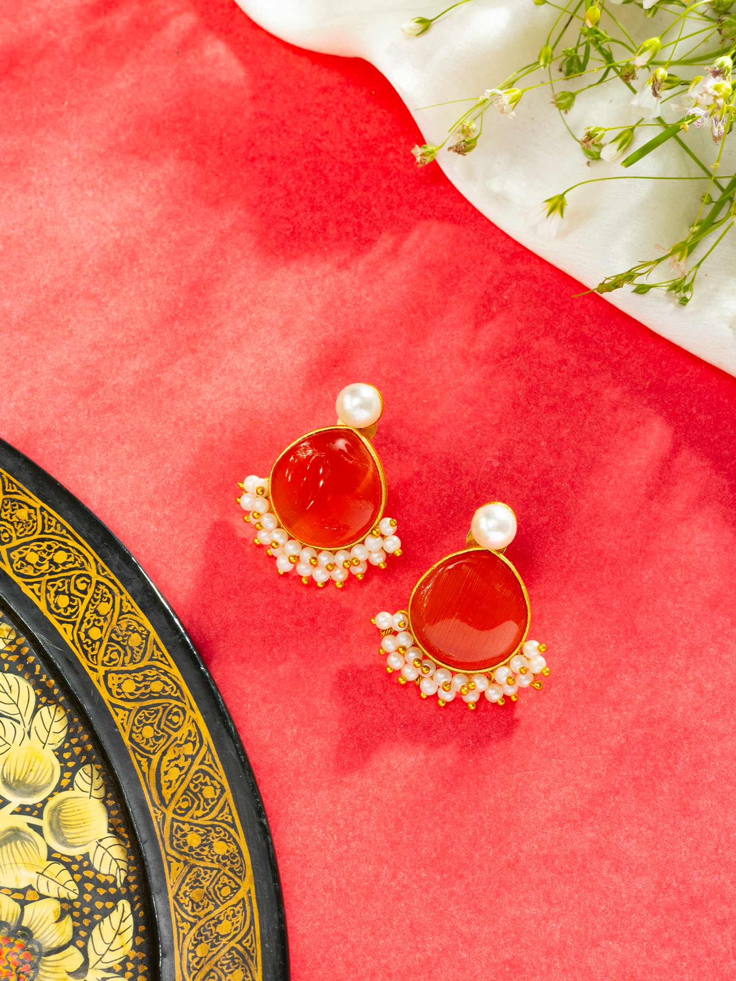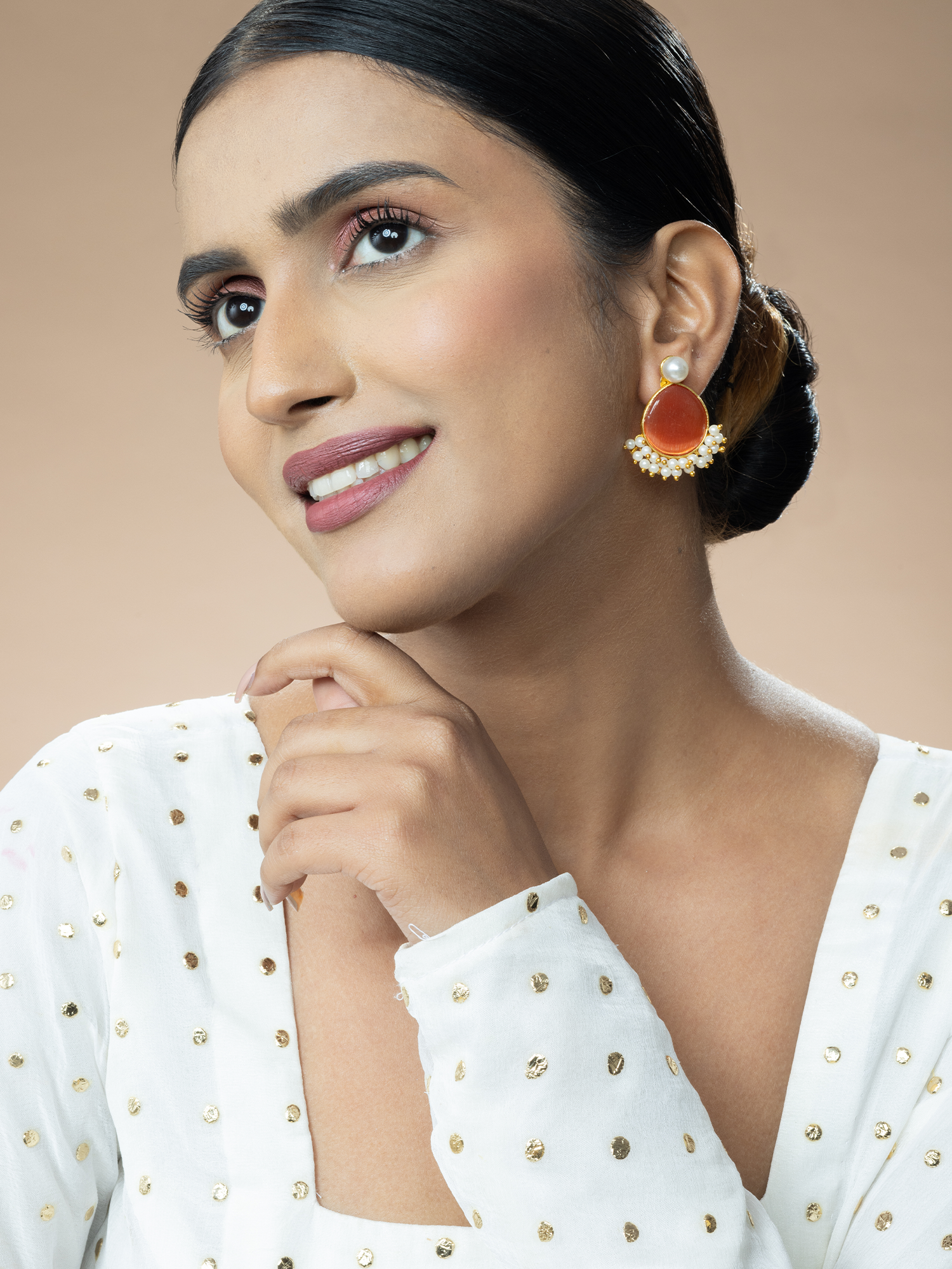 Elevate your style by pairing the Matte Gold Plated Plated Earrings with a chic, monochrome outfit. Let the vibrant orange stone and delicate white pearls take center stage, adding a touch of artistic flair to your look. Perfect for both casual and party wear.