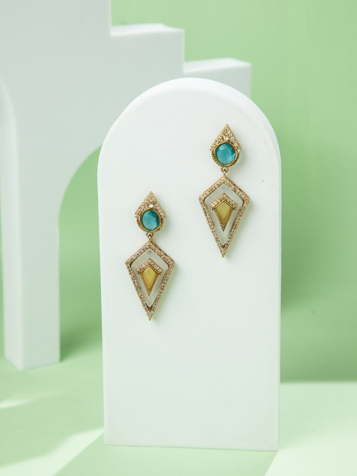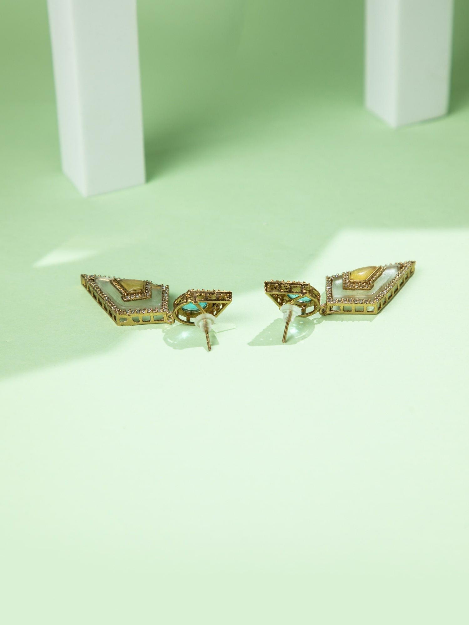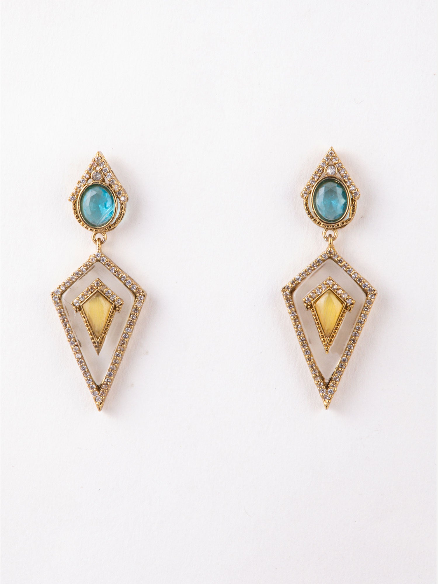 Matte Gold Plated Triangular Earrings with White, Yellow and Sky Blue Stones