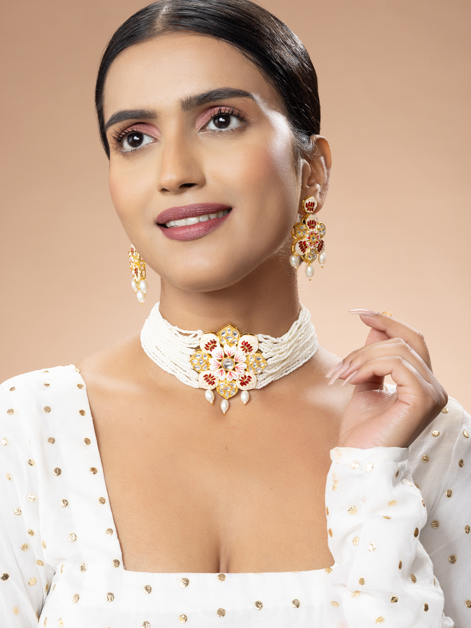 Experience the enchantment of our Matte Gold White Floral Meenakari Necklace Set, adorned with an exquisite white and red floral design, Kundan embellishments, and a multi-layered pearl chain. The set includes beautiful yellow earrings with Kundans and white pearls. This stunning and wonderful ensemble is irresistibly ravishing and gorgeously artistic, showcasing the latest design trends. Elevate your style with this masterpiece, where the intricate details and artistic craftsmanship seamlessly blend to create a timeless symbol of elegance and sophistication.