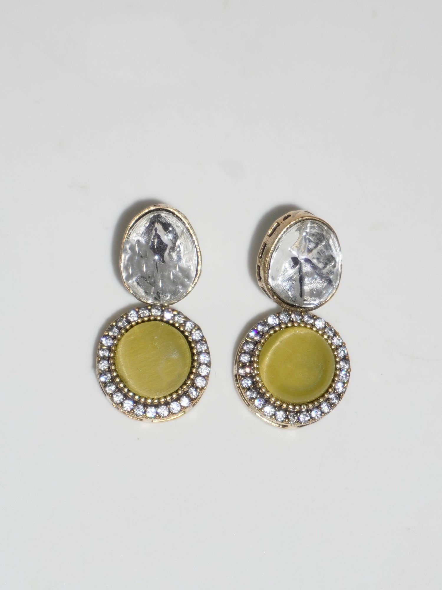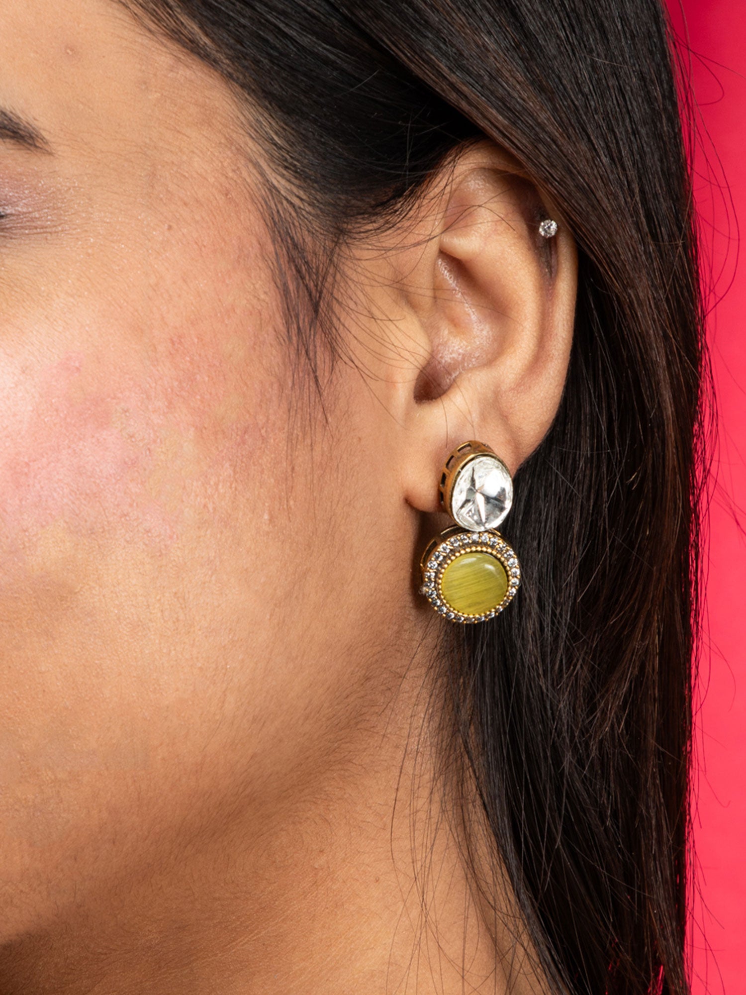 Mesmerizing Mehndi gold-plated earrings featuring a large lime green and white stone, accented with small white CZ stones. Handcrafted by local artisans, this modern design is a must-have for parties, festivals, or functions, adding a stunning touch to any look.