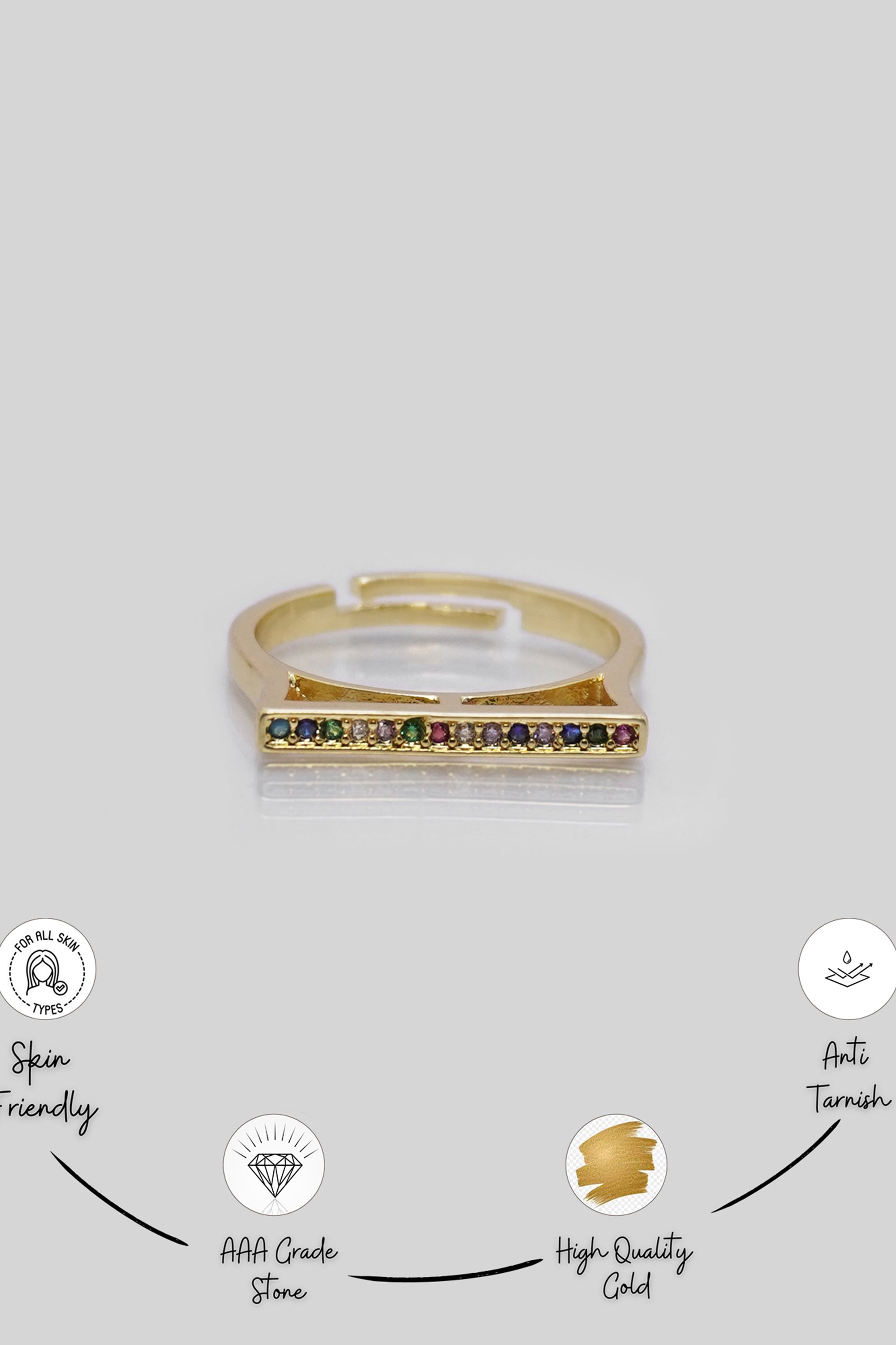 If you want to make your look colorful then this multicolor stones ring is perfect for you. This ring is finely gold-plated and embellished with small colorful CZ stones. It is a combination of elegance, class, and style. Adorn it with your favorite outfit and create magic.