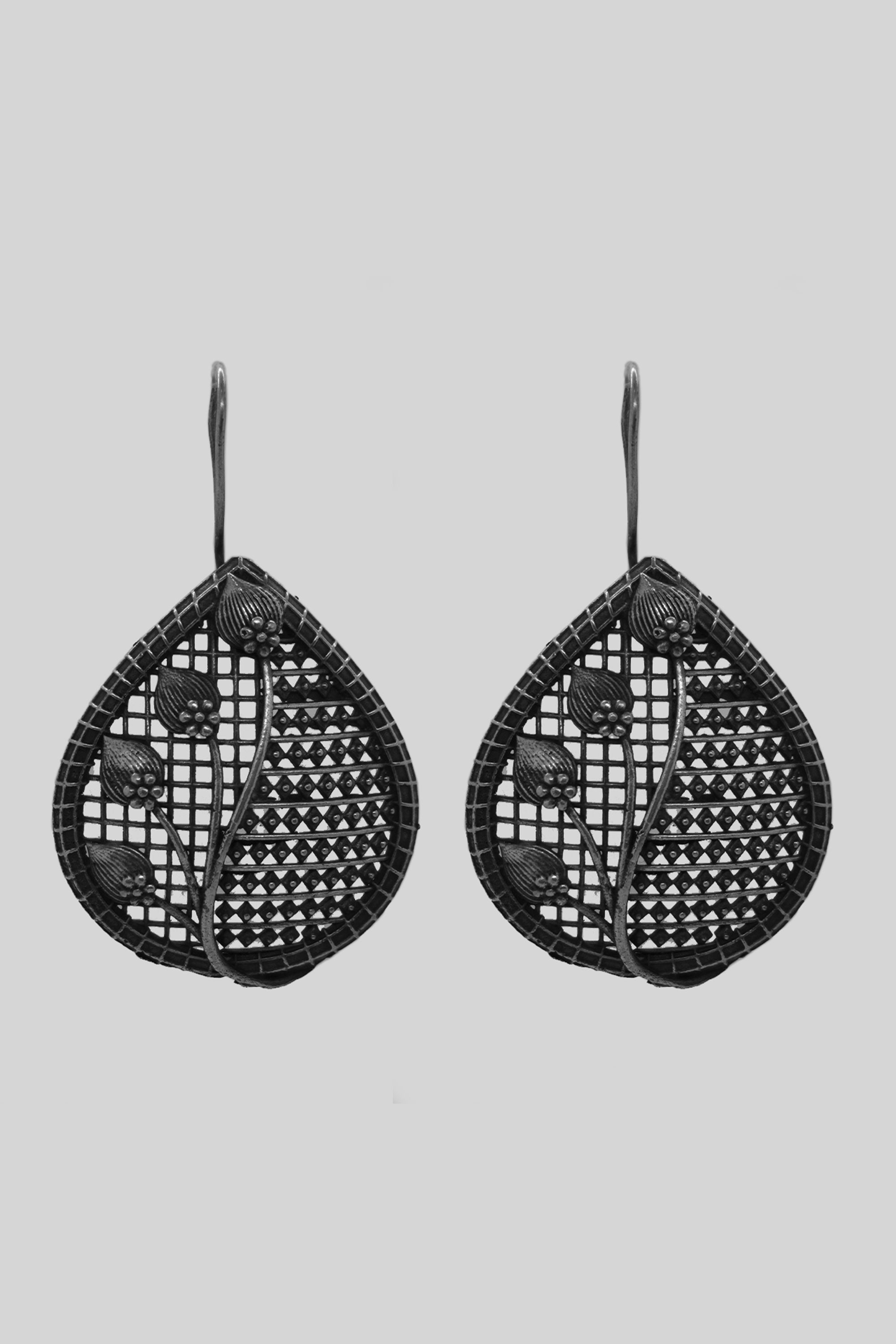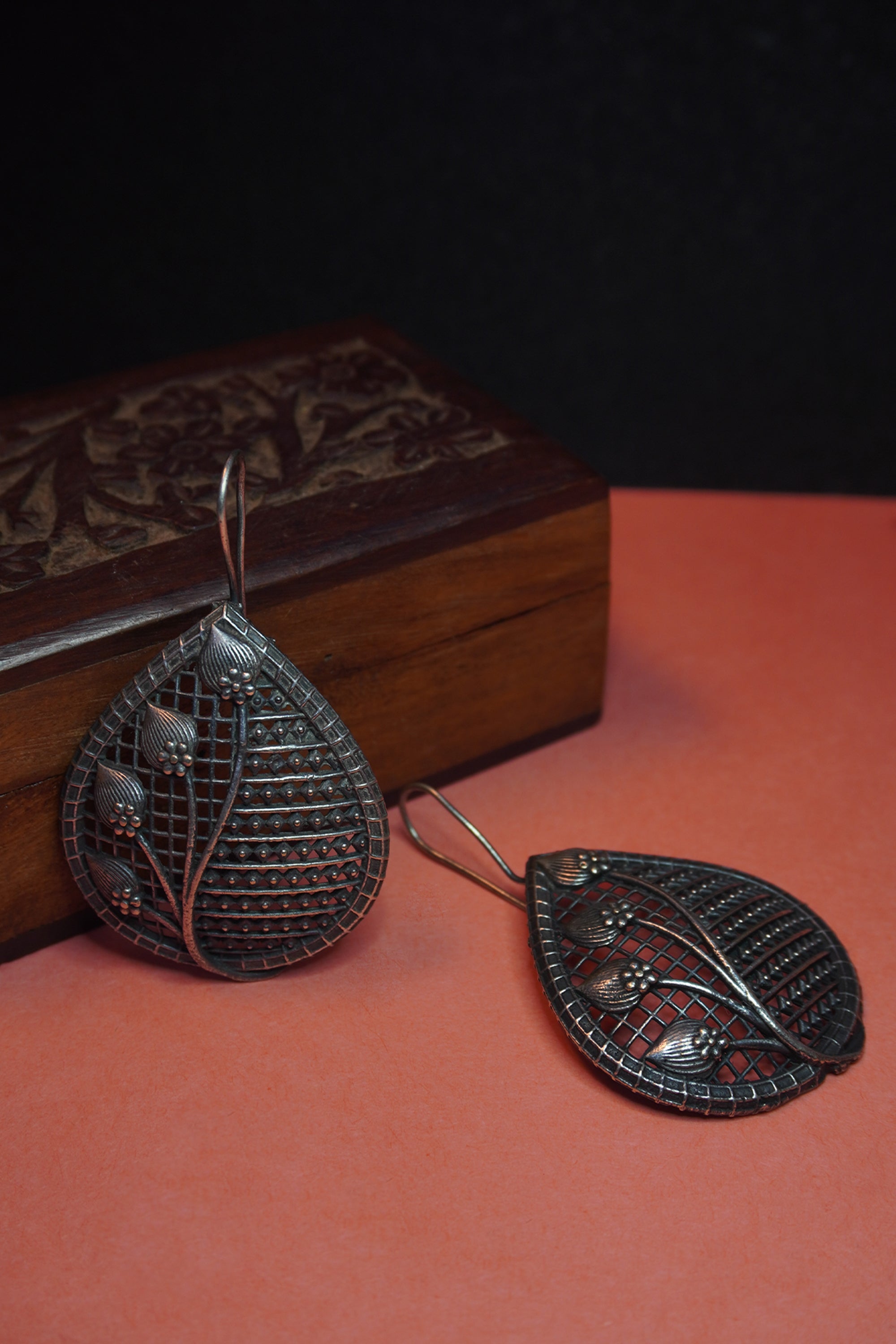 This is a beautiful Niscka Pan Shaped Oxidised Hanging Earring pair. These are made up of high-quality brass. You can pair them or team up with any Indian or Western Attire.