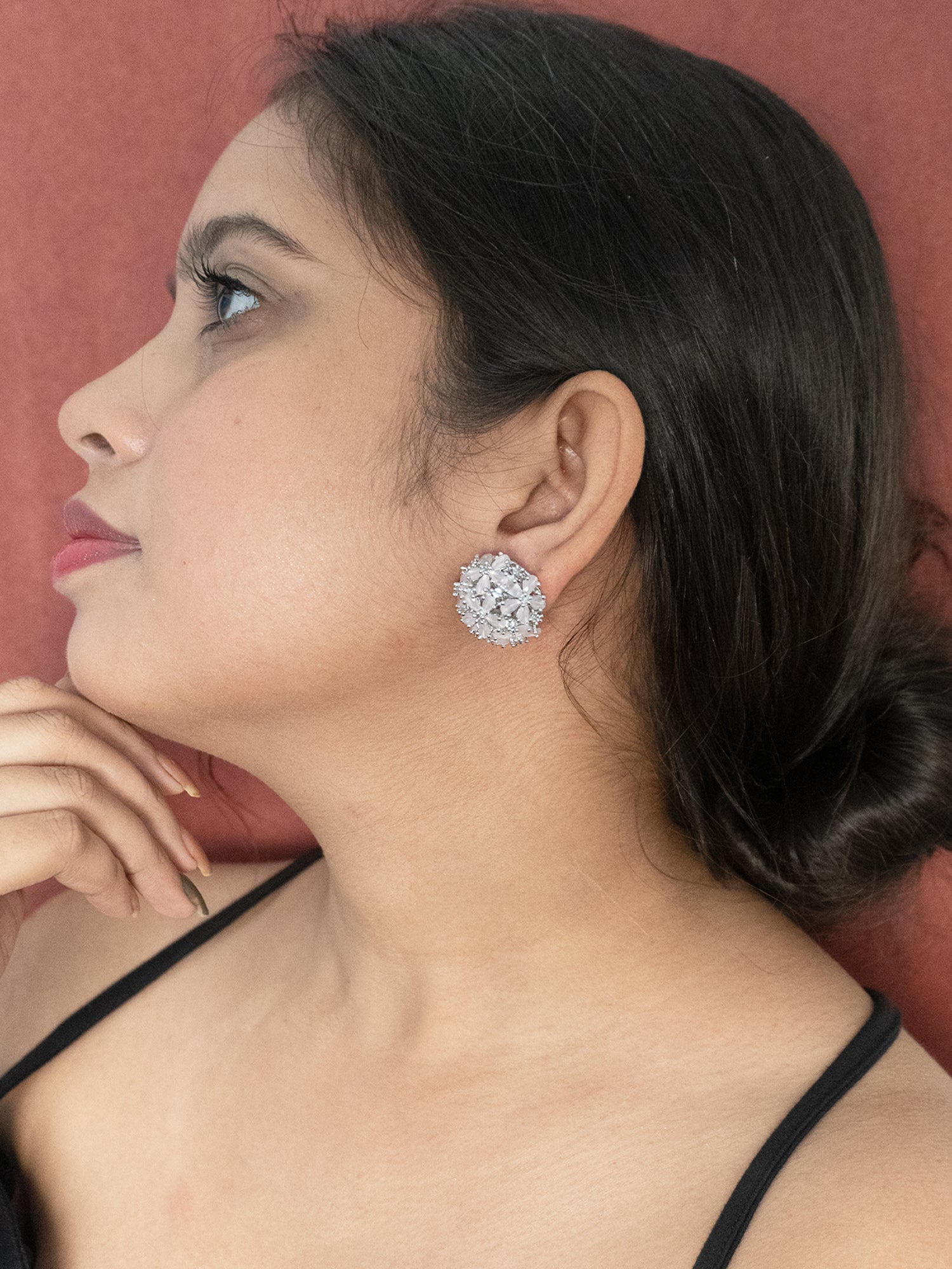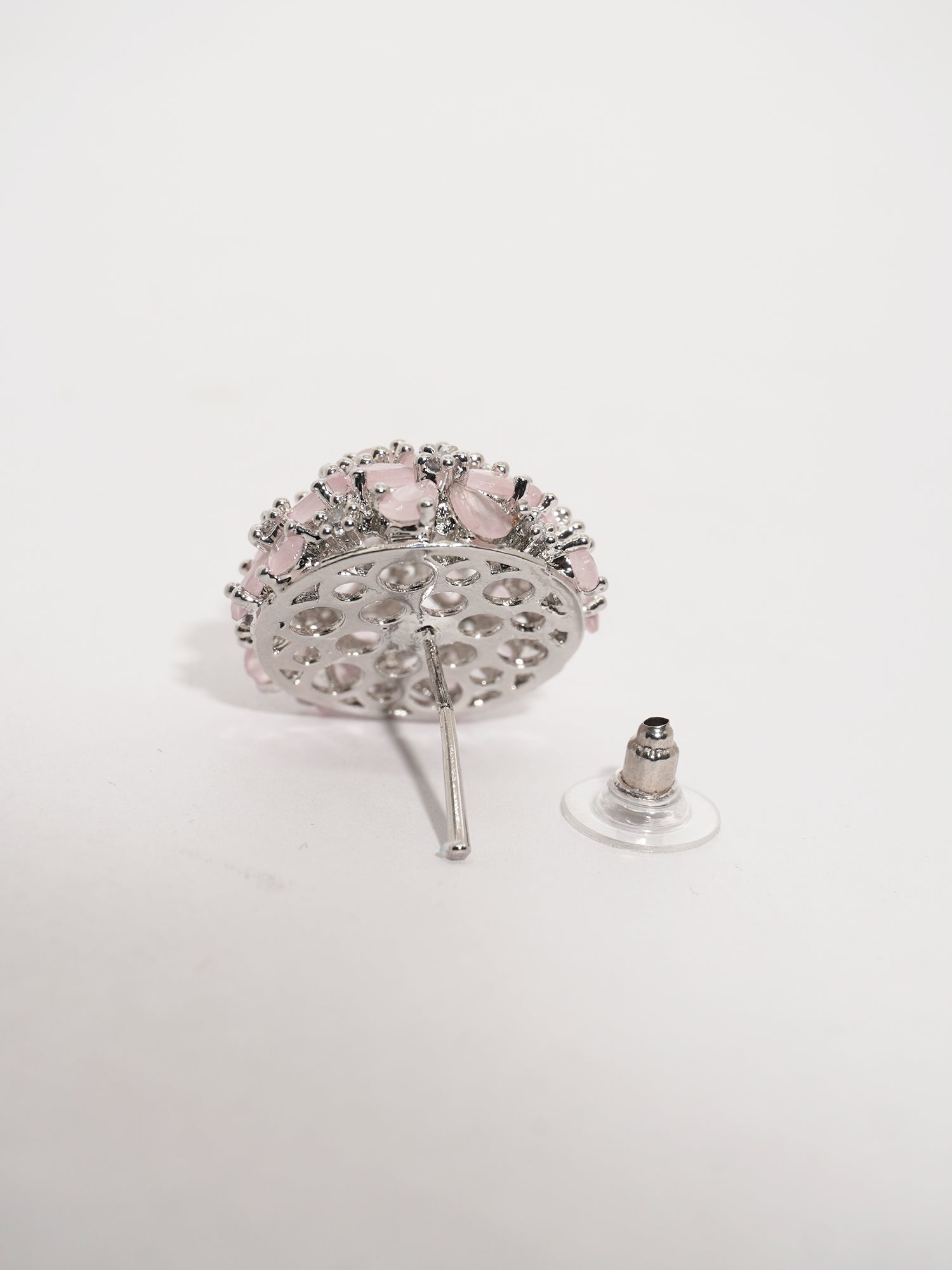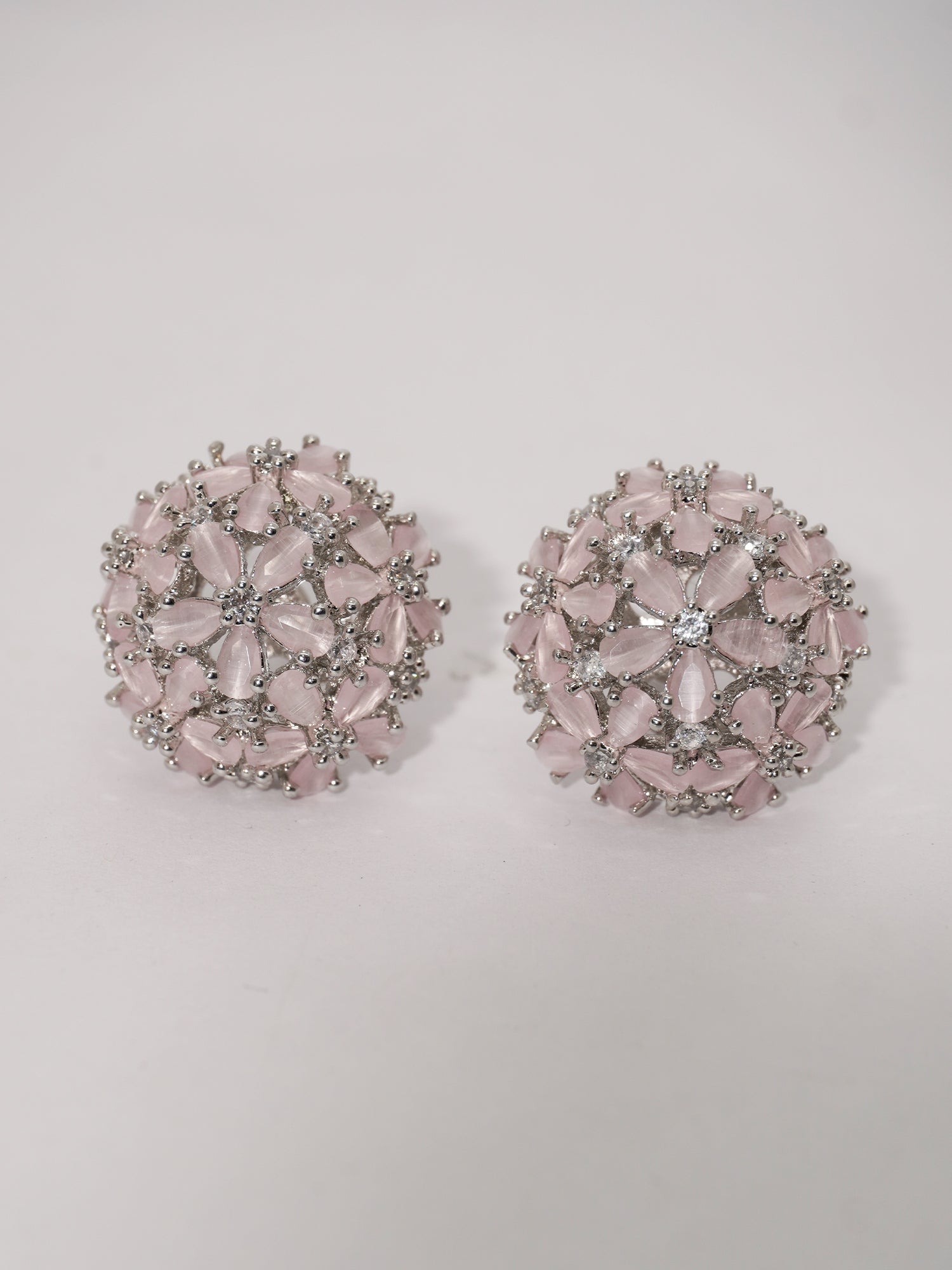 Add a touch of whimsy to your jewelry collection with Niscka's stunning baby pink floral design earrings. Crafted with a circular silhouette, these rhodium-plated studs feature delicate floral motifs that beautifully highlight the soft pink hue. Adorned with sparkling American diamonds, these earrings exude elegance and charm, making them perfect for both everyday wear and special occasions. The combination of the feminine design and luxurious materials ensures they will stand out while providing a comfortable fit. Elevate your style effortlessly with these enchanting earrings that capture the essence of grace and beauty.